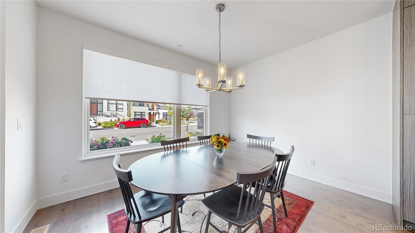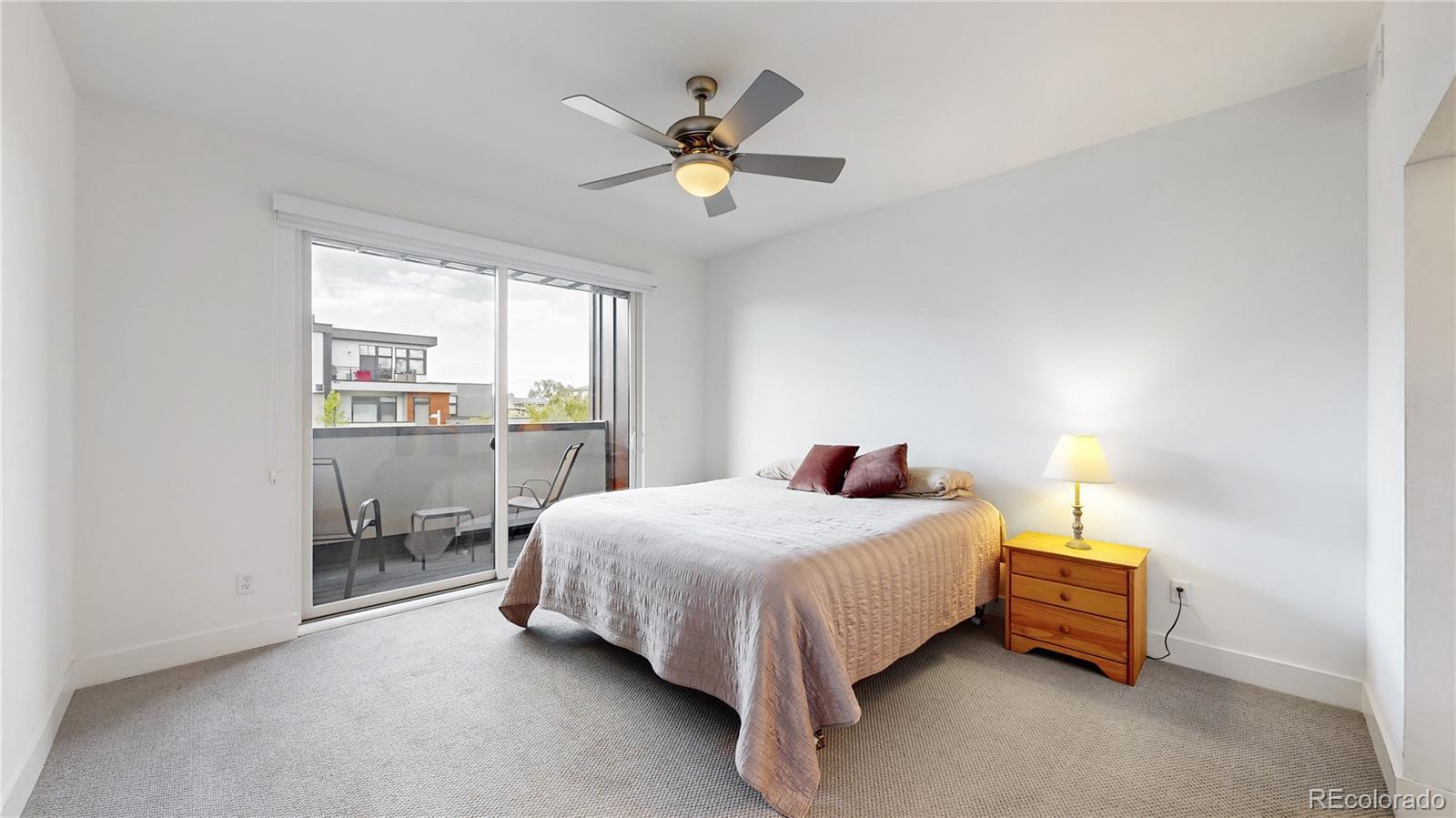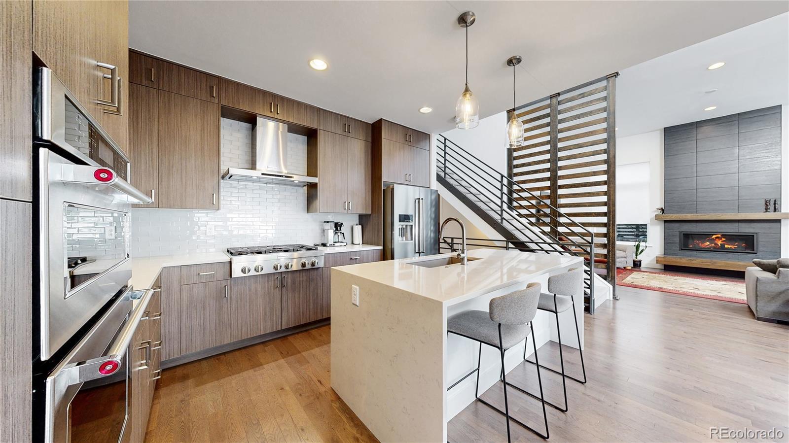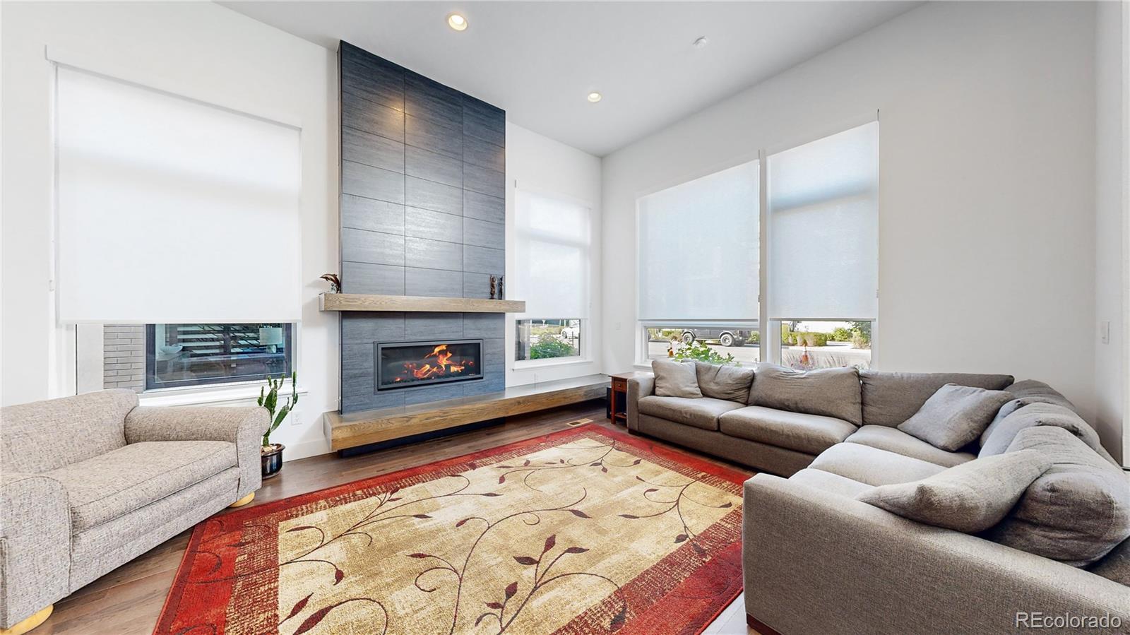 Welcome to this stunning end-unit townhome in Lowry’s coveted Boulevard One with main-floor primary suite. Just four years old, this contemporary home offers a rare blend of modern design, high-end finishes and thoughtful upgrades—plus a fully finished basement. The open main level showcases hardwood floors, soaring 12’ ceilings and a cozy gas fireplace. A chef’s kitchen features stainless steel appliances, a 6-burner gas cooktop, quartz countertops and an oversized island. The desirable main-floor primary suite boasts a spa-like bath and spacious walk-in closet. A powder room and laundry complete the level. Upstairs you’ll find two additional bedrooms with two baths (1 en-suite), a flexible loft space plus balconies at both the front and back of the home. The top level offers a dramatic open loft with a two-sided indoor/outdoor fireplace and a 320 sq ft rooftop deck—west- and north-facing views, plumbed for natural gas and perfect for entertaining. The fully finished basement includes a large family room, fourth bedroom and 3/4 bath. A two-car garage with two EV chargers and an owned solar system add convenience and efficiency. Backing to a peaceful neighborhood park, this home is just steps from shops, restaurants, groceries, library, parks and public transit. Truly a turnkey opportunity in one of Denver’s most walkable neighborhoods.