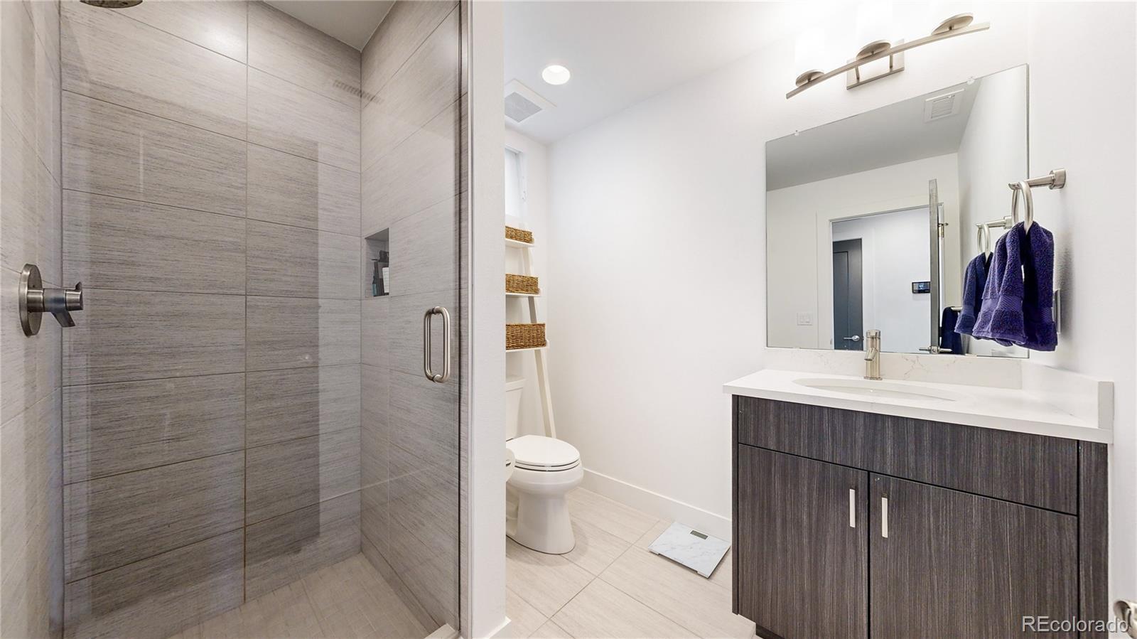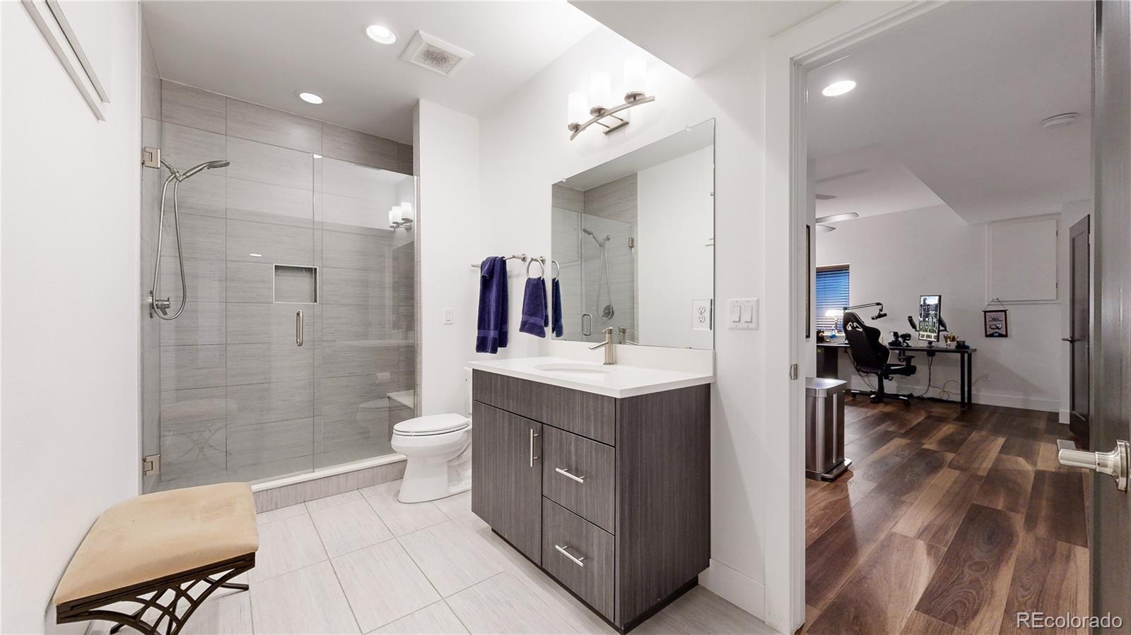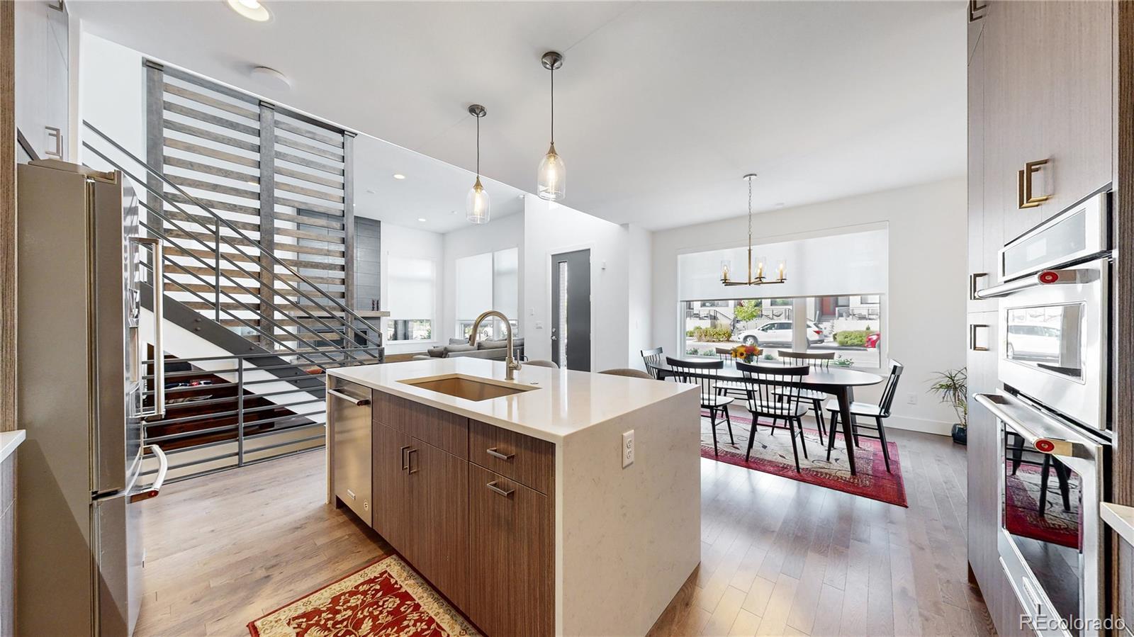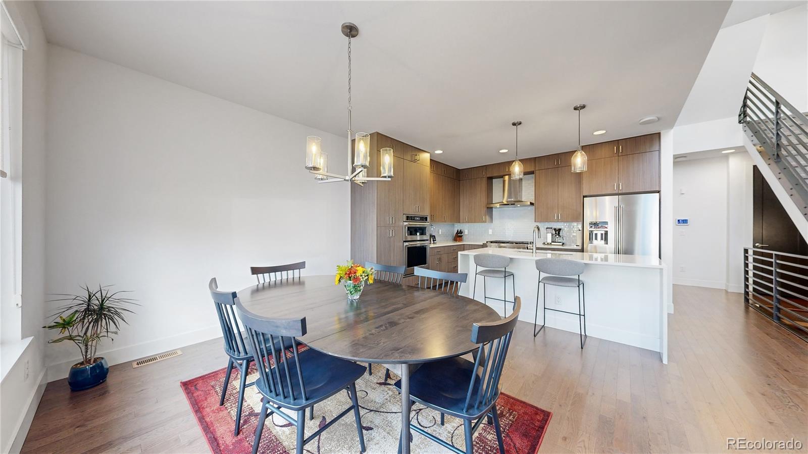 Welcome to this stunning end-unit townhome in Lowry’s coveted Boulevard One with main-floor primary suite. Just four years old, this contemporary home offers a rare blend of modern design, high-end finishes and thoughtful upgrades—plus a fully finished basement. The open main level showcases hardwood floors, soaring 12’ ceilings and a cozy gas fireplace. A chef’s kitchen features stainless steel appliances, a 6-burner gas cooktop, quartz countertops and an oversized island. The desirable main-floor primary suite boasts a spa-like bath and spacious walk-in closet. A powder room and laundry complete the level. Upstairs you’ll find two additional bedrooms with two baths (1 en-suite), a flexible loft space plus balconies at both the front and back of the home. The top level offers a dramatic open loft with a two-sided indoor/outdoor fireplace and a 320 sq ft rooftop deck—west- and north-facing views, plumbed for natural gas and perfect for entertaining. The fully finished basement includes a large family room, fourth bedroom and 3/4 bath. A two-car garage with two EV chargers and an owned solar system add convenience and efficiency. Backing to a peaceful neighborhood park, this home is just steps from shops, restaurants, groceries, library, parks and public transit. Truly a turnkey opportunity in one of Denver’s most walkable neighborhoods.
