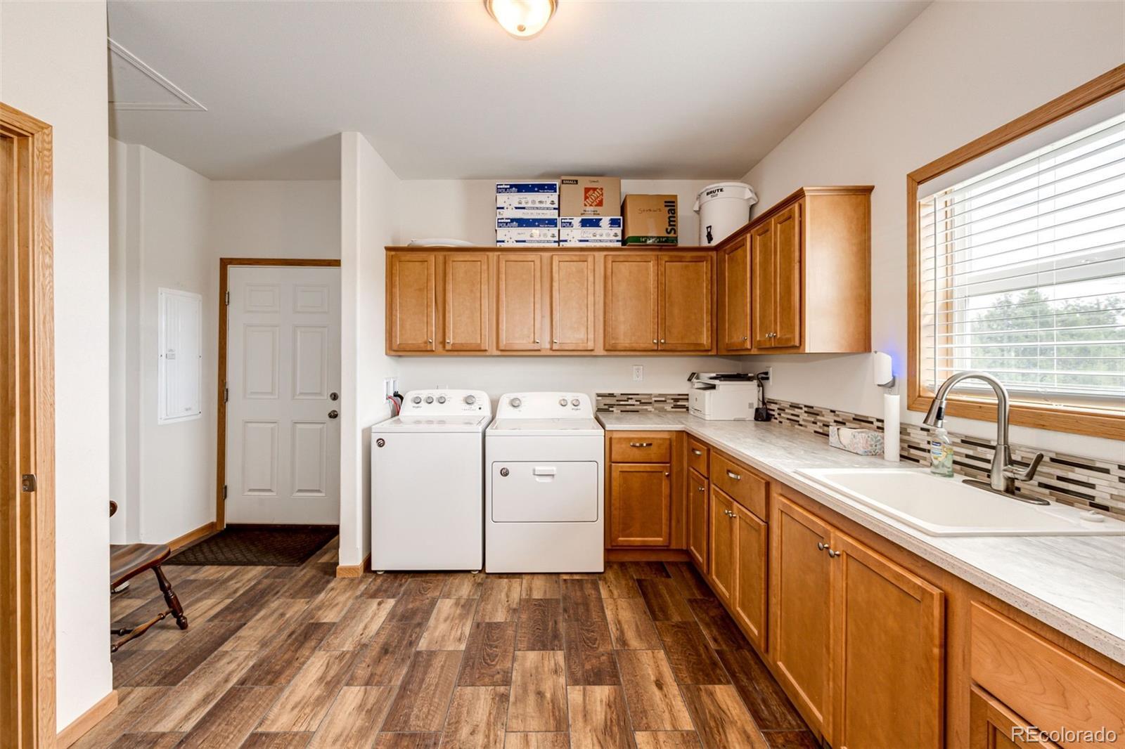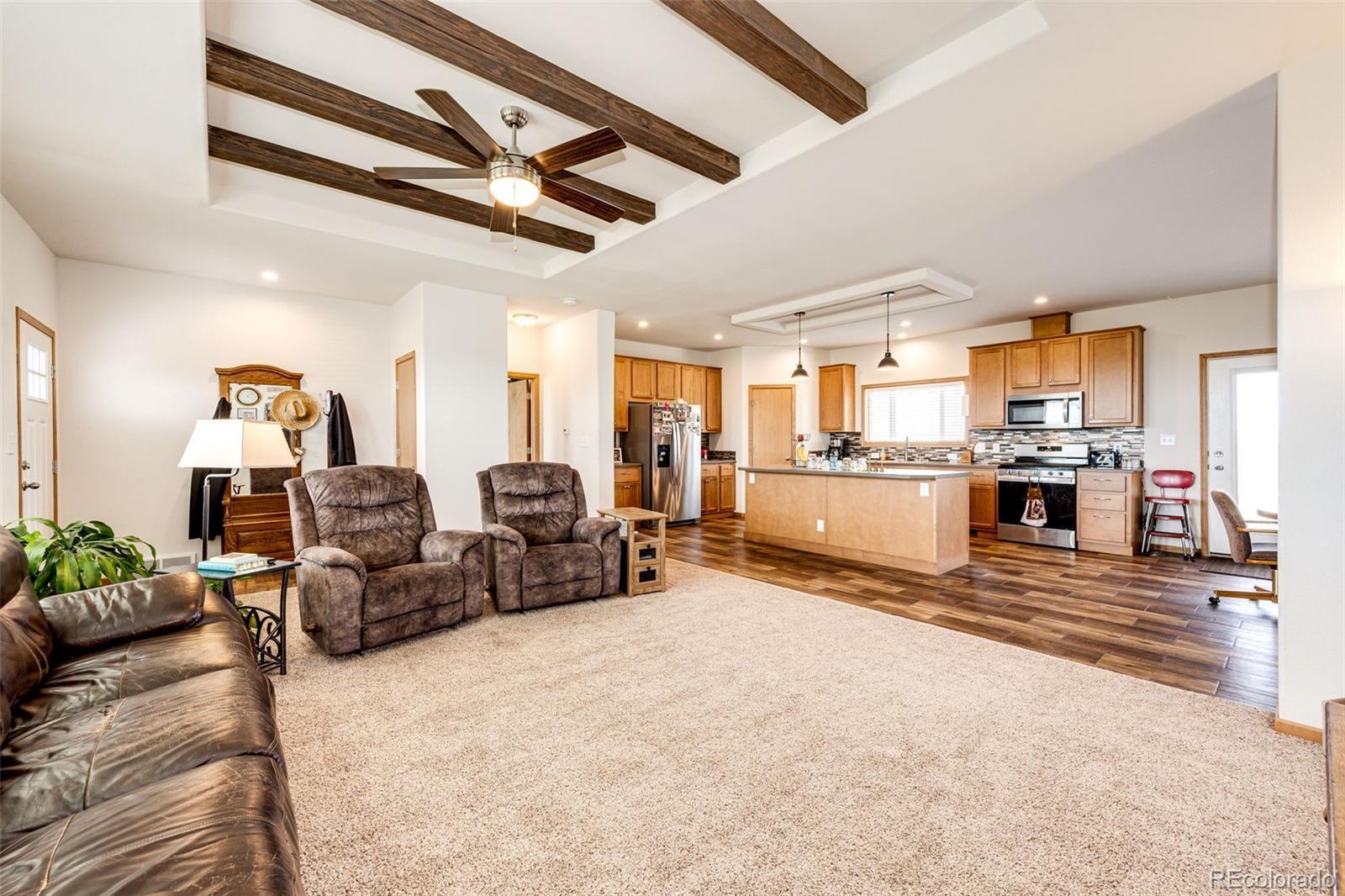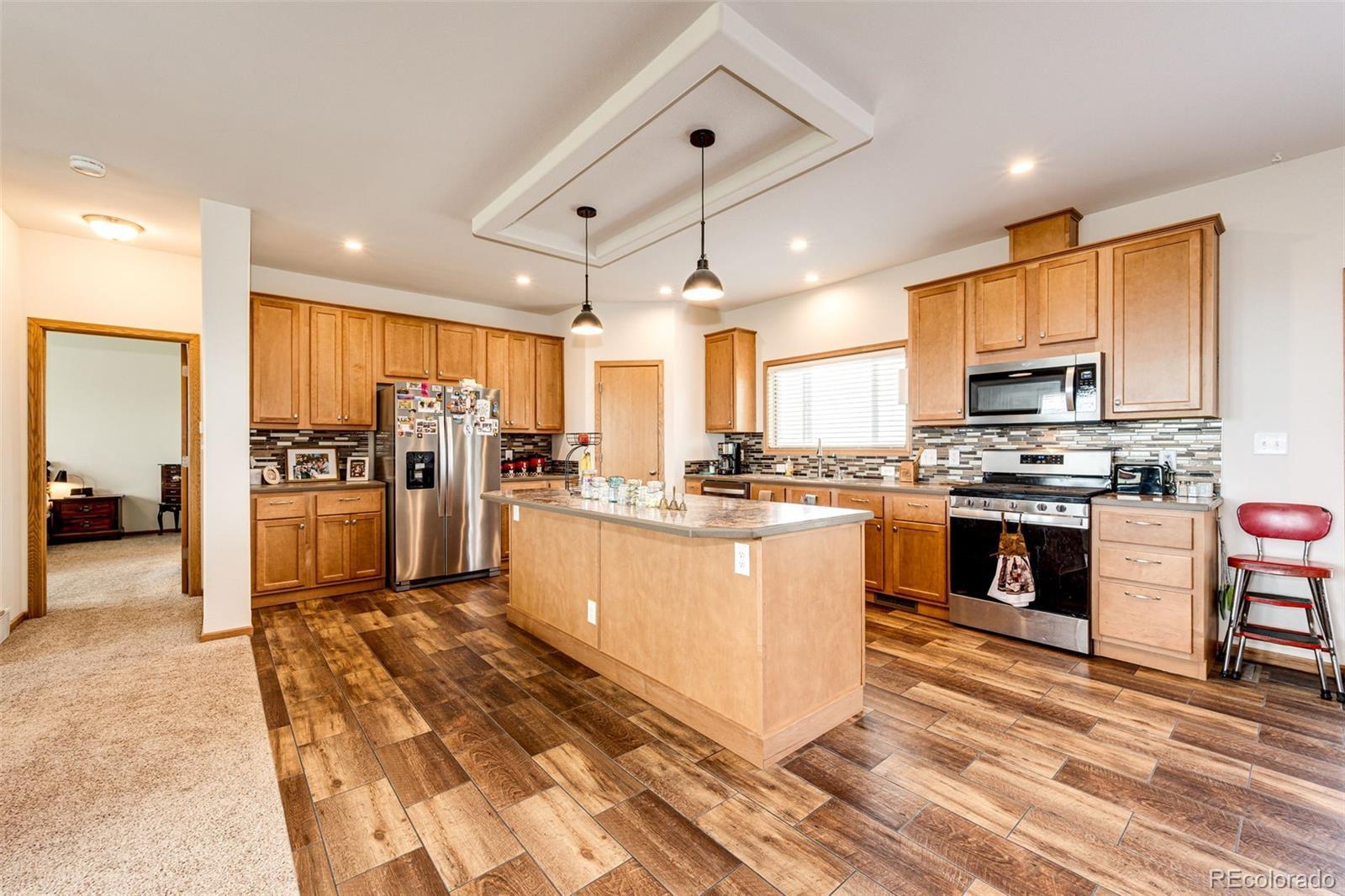 This beautiful ranch style home sits on almost 40 acres! Newly built in 2021, this home offers multi-generational living with an in law suite/apartment in the basement. The upper level features an open floor plan with a spacious kitchen, walk in pantry, primary bedroom with luxurious 3/4 bathroom, two spacious bedrooms and an absolutely amazing mud/laundry room. The finished basement offers two bedrooms, spacious family room, kitchen with pantry and dining room area. The upgrades in the home include low maintenance Luxury Vinyl Tile/Plank flooring, 9 ft coffered ceilings, maple cabinetry, stainless steel appliances, water filtration system and reverse osmosis system. The attached two car garage is oversized is a mechanic dream! The lot has a mature tree snow barrier which provides a great wind block on the north side. The property is fenced and features native grass and no covenants. This home is in impeccable condition and pride of ownership shows! Buyer to verify all information.