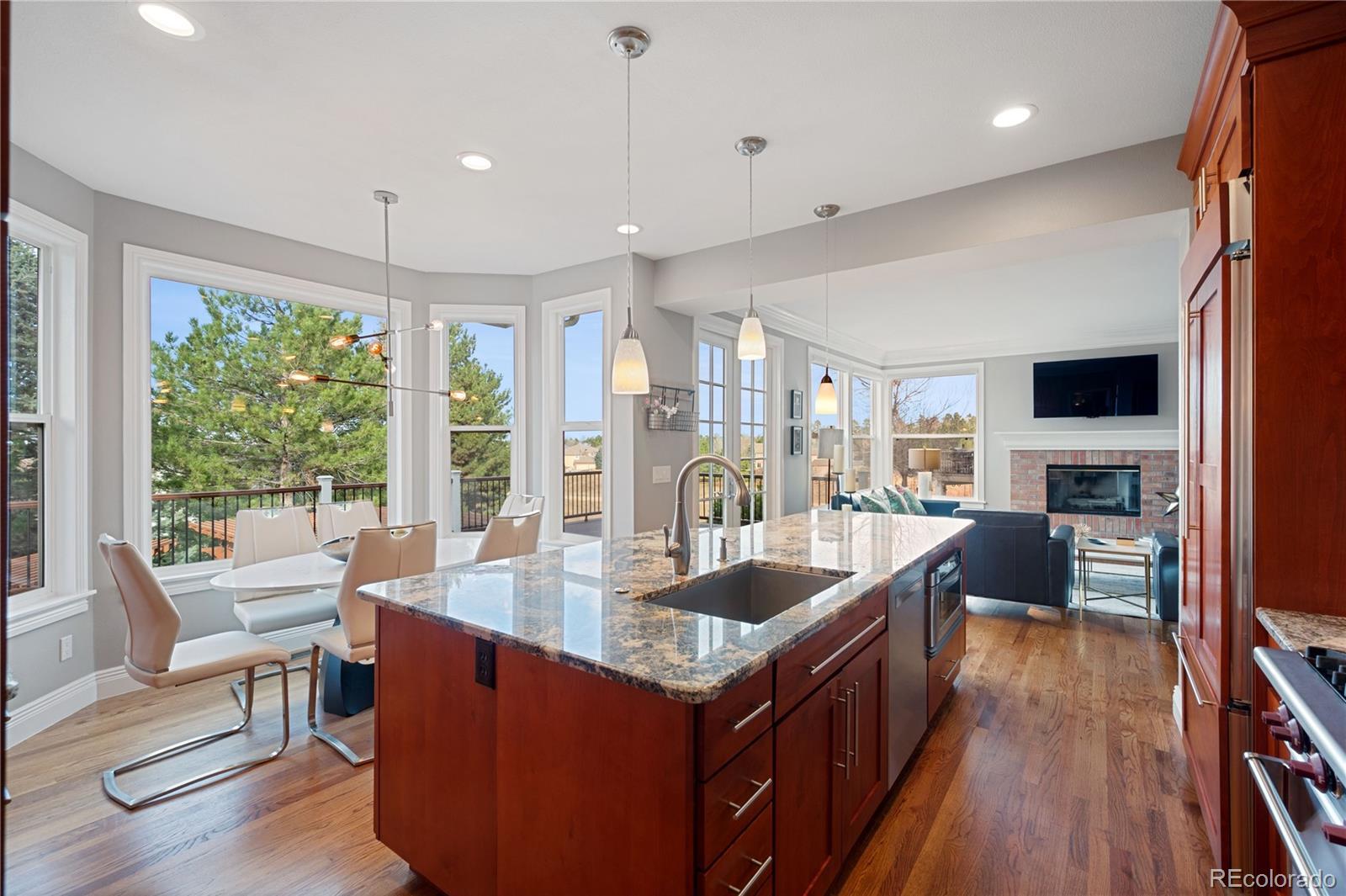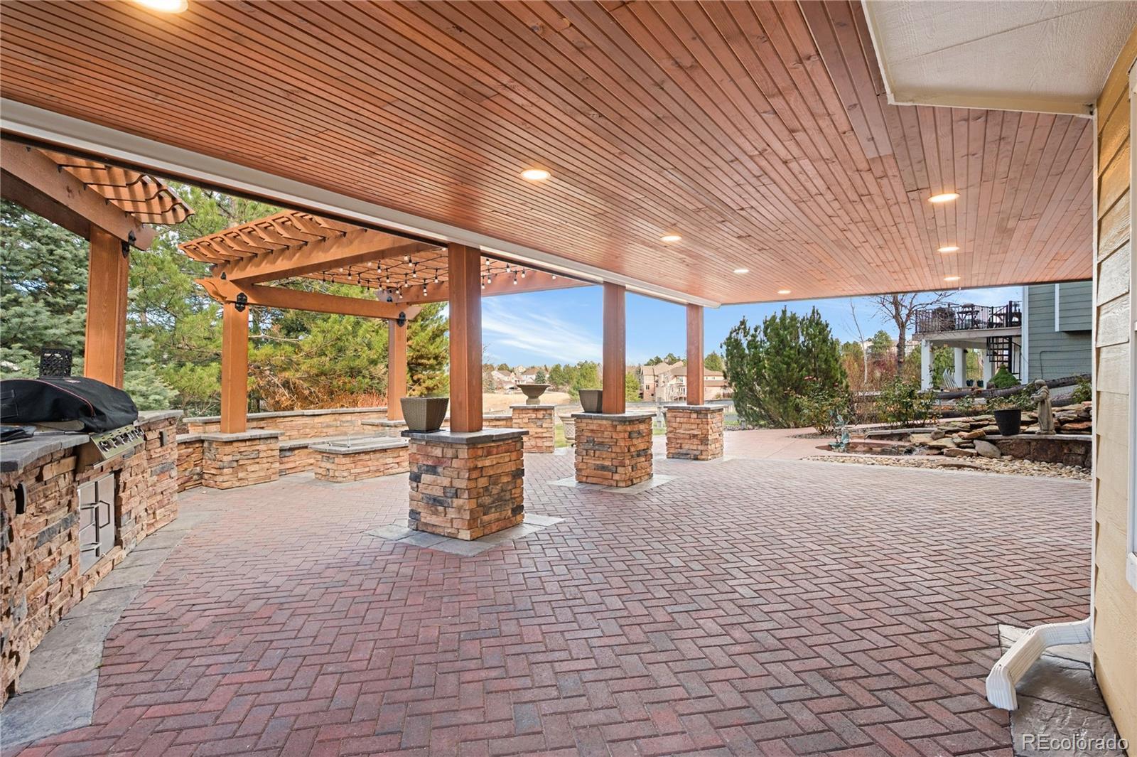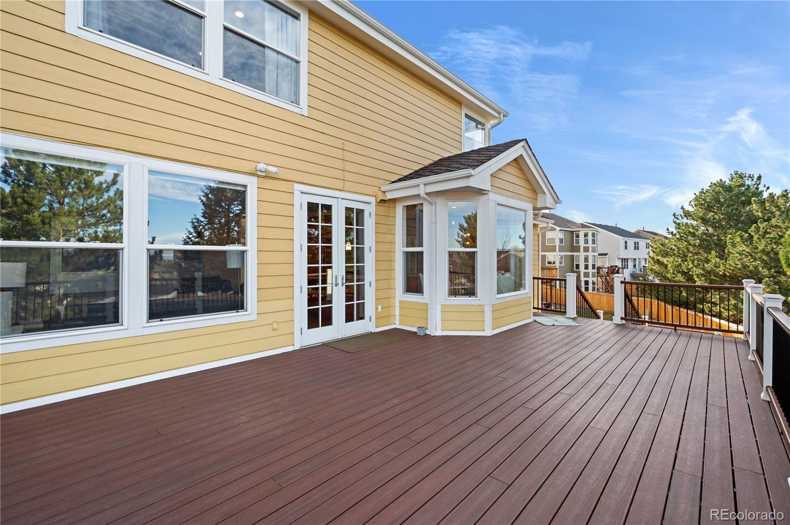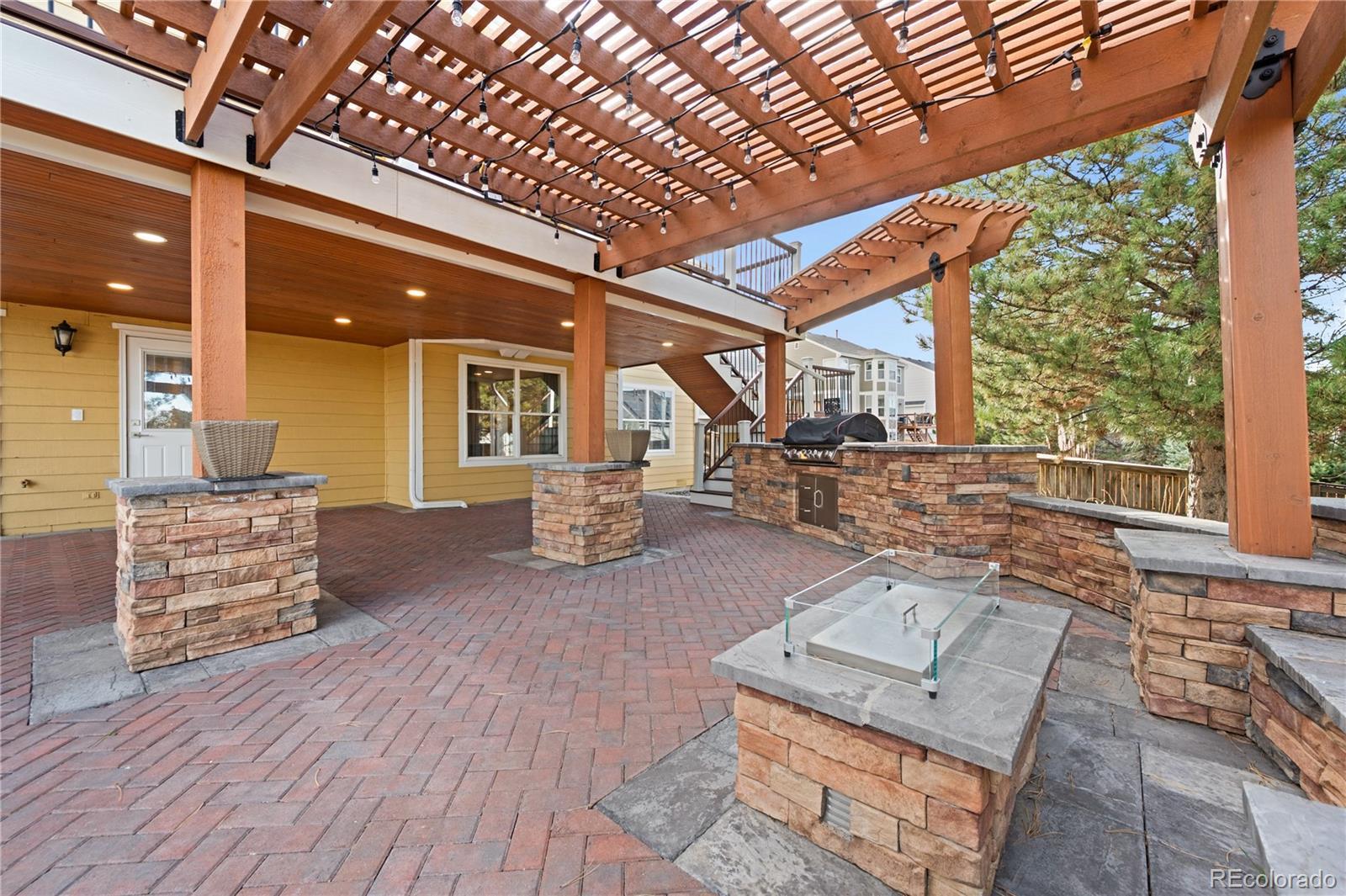 Discover this beautifully updated, ready-to-move-in 5-bedroom, 4-bathroom home nestled at the end of a quiet cul-de-sac in Highlands Ranch. Surrounded by open space and scenic walking trails, this residence offers partial breathtaking views of the mountains and the city, along with an exceptional blend of luxury, comfort, and community. Interior highlights include fresh interior paint (2024) and remodeled bathrooms (2024). Gourmet kitchen with a custom granite island, Wolf stove, Sharp drawer microwave, Monogram beverage drawer refrigerator, KitchenAid French Door refrigerator, and built-in coffee bar with a filtered hot-water faucet and built-in coffee machine. French doors open to an oversized, extended deck—perfect for entertaining. Multiple formal and informal living areas with soaring two-story ceilings that flood the main level with natural light. Primary suite retreat upstairs with a luxurious 5-piece en-suite bath, plus three additional bedrooms and a double sink bathroom. Walk-Out Basement Retreat remodeled includes Media/theater room, Wet bar and built-in cabinetry, Exercise room and guest bedroom, New ¾ bathroom, French doors lead to a covered patio oasis featuring a Built-in BBQ grill, Fire pit and seating area, Pergola and a tranquil water feature, surrounded by mature trees for privacy. Recent Upgrades include a new water heater (2025), an Advanced whole-house fan system (2025), Exterior paint (2024), a new washer and dryer (2025), Electric Vehicle Charging Station ready (2025). Prime Location and Amenities. Walkable to neighborhood schools and Arma Dei Academy, parks, and trails. Access to Highlands Ranch’s premier four recreation centers, pools, pickleball courts, and community amenities. This home is a rare find—offering elegant design, thoughtful upgrades, and a vibrant lifestyle in one of the area's most desirable neighborhoods.