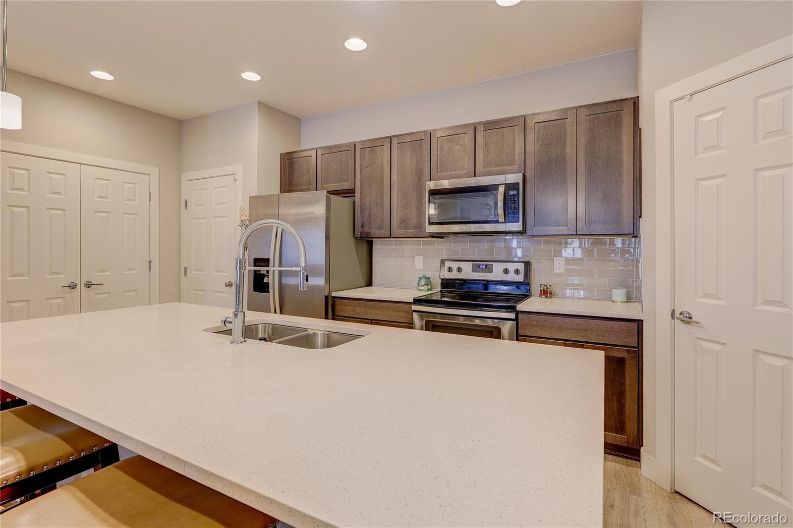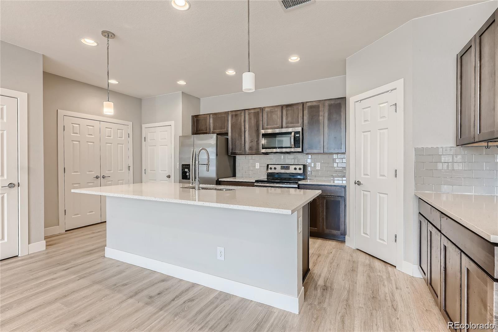 Welcome to Avion at Denver Connection, where modern elegance meets unbeatable convenience. One of the largest units with 1865 sq.ft., this 4-bedroom, 2.5-bathroom townhome is designed for stylish living and effortless entertaining. Step into a bright, open-concept layout featuring luxury vinyl flooring throughout the main level. The spacious living room is perfect for gatherings, flowing into a modern kitchen with granite countertops, a walk-in pantry, stainless appliances and a massive island. An area for dining, direct access to the attached two-car garage and a half-bath completes the main floor. Upstairs, the large primary suite offers a peaceful retreat with a luxury en suite 3/4 bath. Three additional bedrooms, a full bath, and a convenient upstairs laundry room provide comfort and function for family or guests. Multiple storage closets throughout the home keep everything organized. Directly across the street, The FlyWay—a vibrant new 32-acre retail hub—is set to bring shopping, dining, and community space right to your doorstep. Enjoy amenities including: The HUB clubhouse with a pool, yoga room, and year-round events. Dog parks with water stations. Pollinator Park and scenic walking trails. A planned 10-acre community park with soccer fields and playgrounds. Unbeatable location: Just 5 minutes to the light rail, 10 minutes to DIA, 15 minutes to downtown Denver.