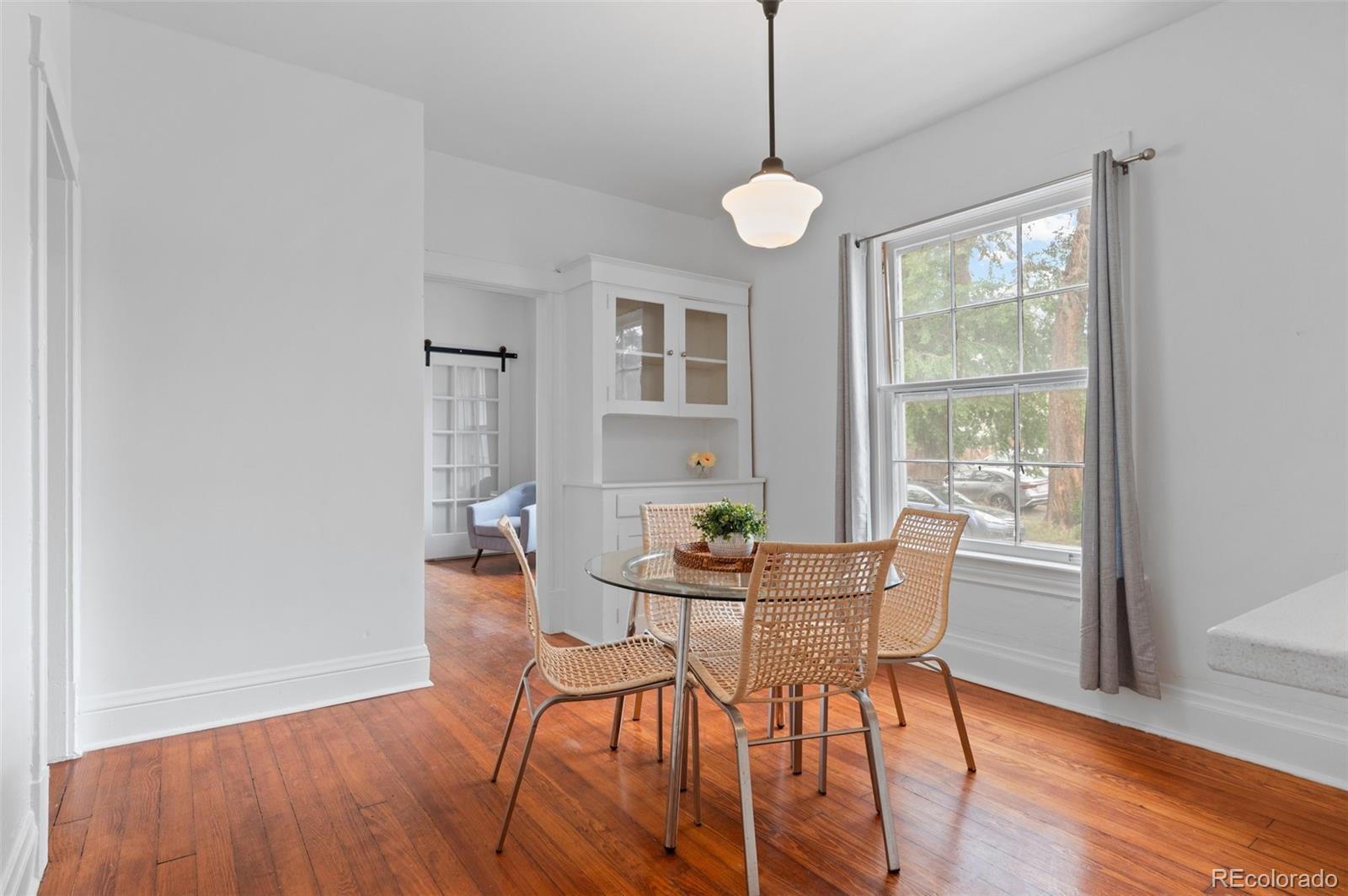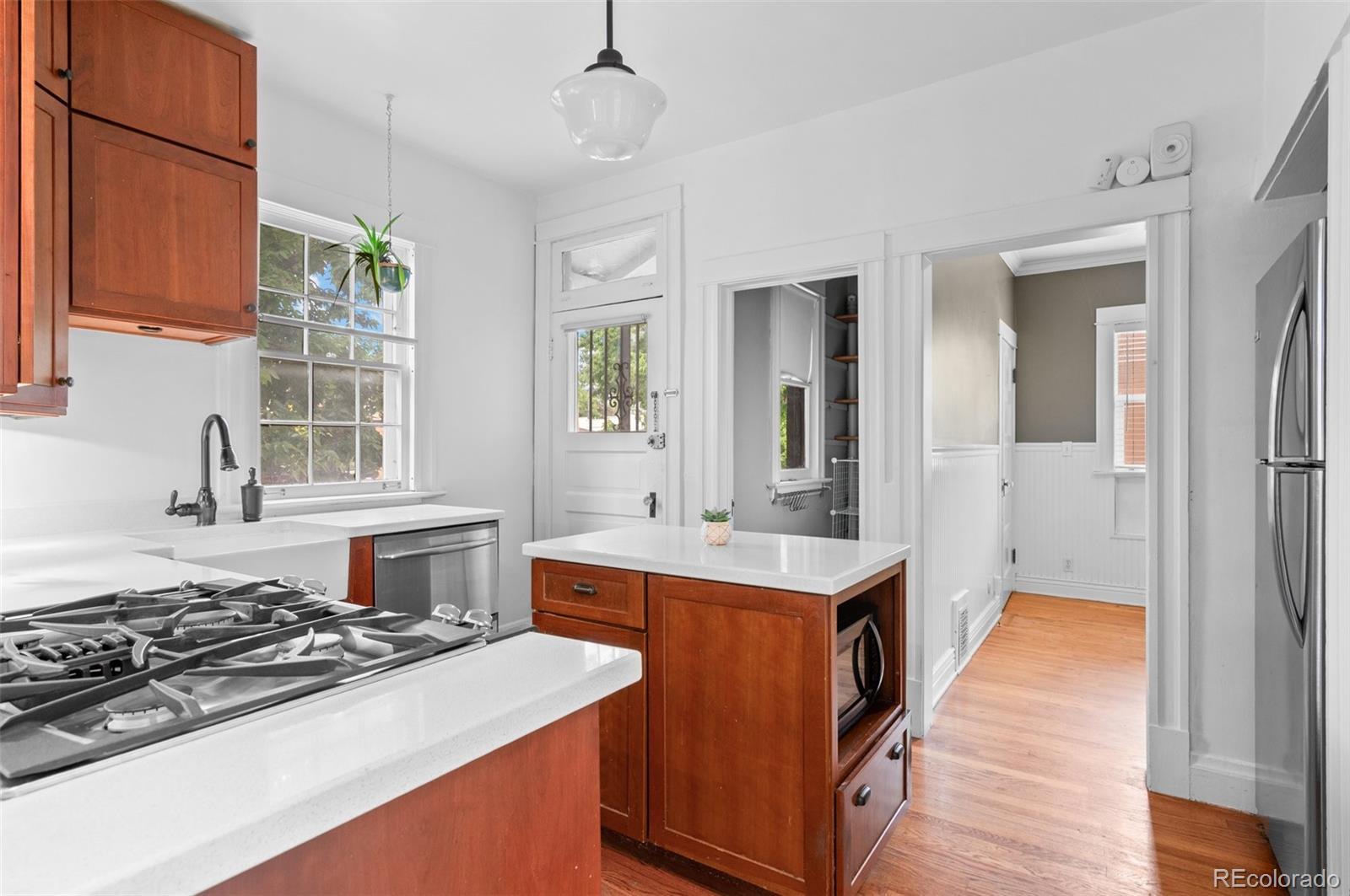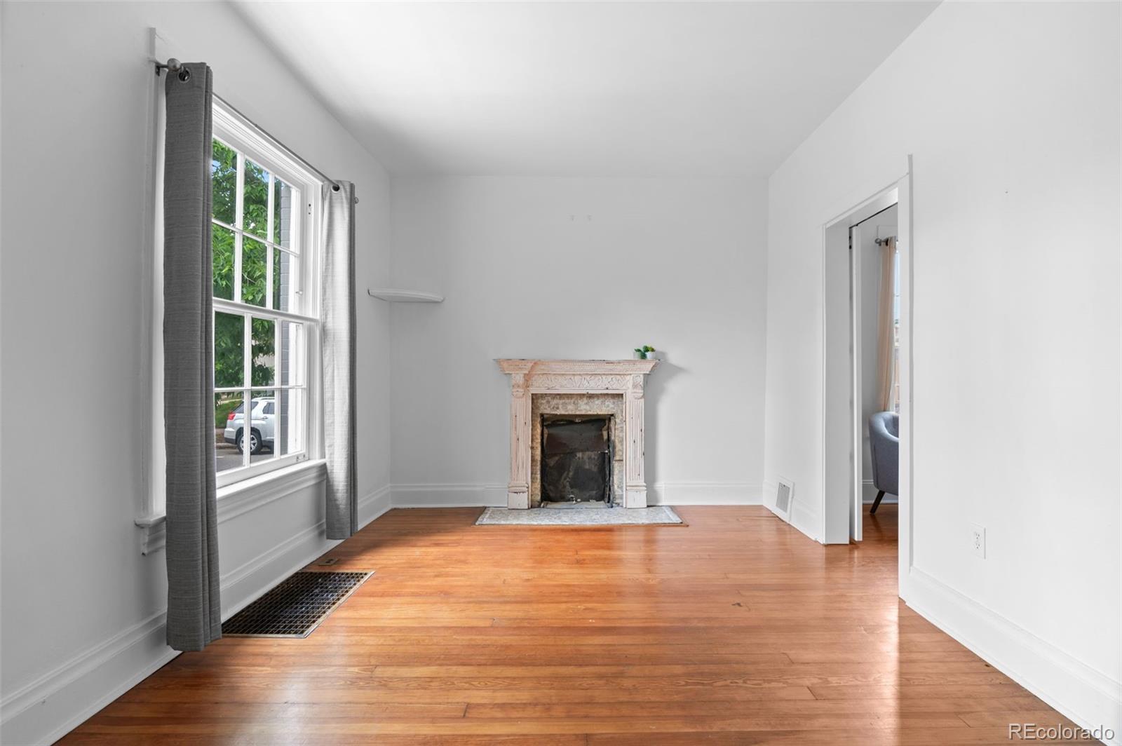 Nestled in the heart of Denver’s Alamo Placita neighborhood, this charming historic row home perfectly blends classic character with modern convenience. Featuring three bedrooms and one bathroom, the home boasts a bright and inviting main level with high ceilings and gleaming wood floors throughout. Historic details abound, from the decorative fireplace to built-in shelving, creating a warm and welcoming atmosphere. The thoughtfully designed pass-through from dining room to kitchen enhances the flow between spaces, leading to a beautifully updated kitchen with Quartz countertops, stainless steel appliances, natural gas range, spacious island, and walk-in pantry. The home offers two comfortable bedrooms on the main level, while the third bedroom or bonus space in the basement provides versatility to suit your needs. Step outside to the fenced, private patio, perfect for outdoor relaxation or entertaining. Enjoy the convenience of a truly walkable lifestyle. Find yourself just moments from dining, shopping, and amenities, all while embracing the timeless charm of this historic gem. Don't miss the opportunity to own a piece of Denver history in one of its most desirable neighborhoods!