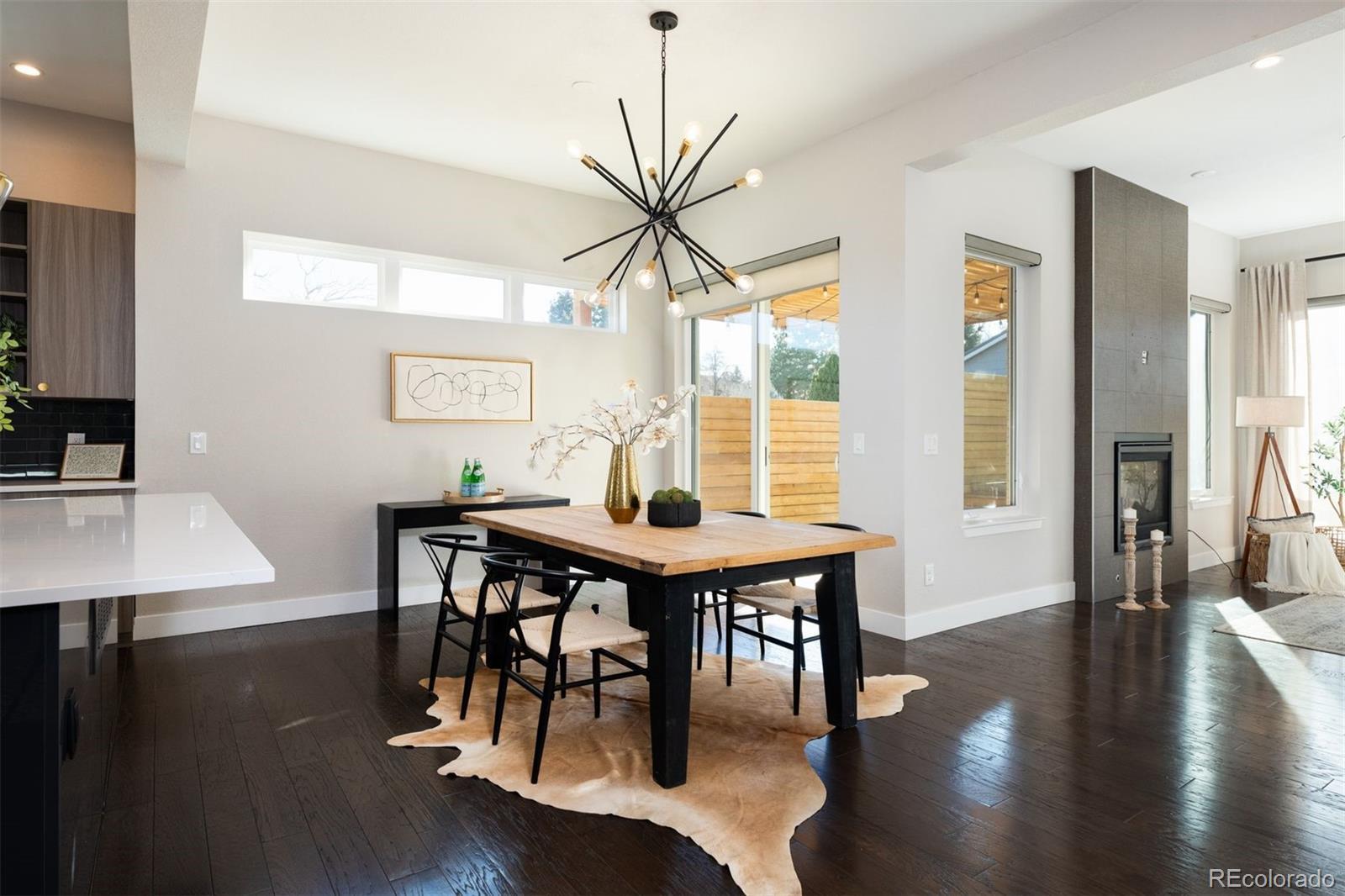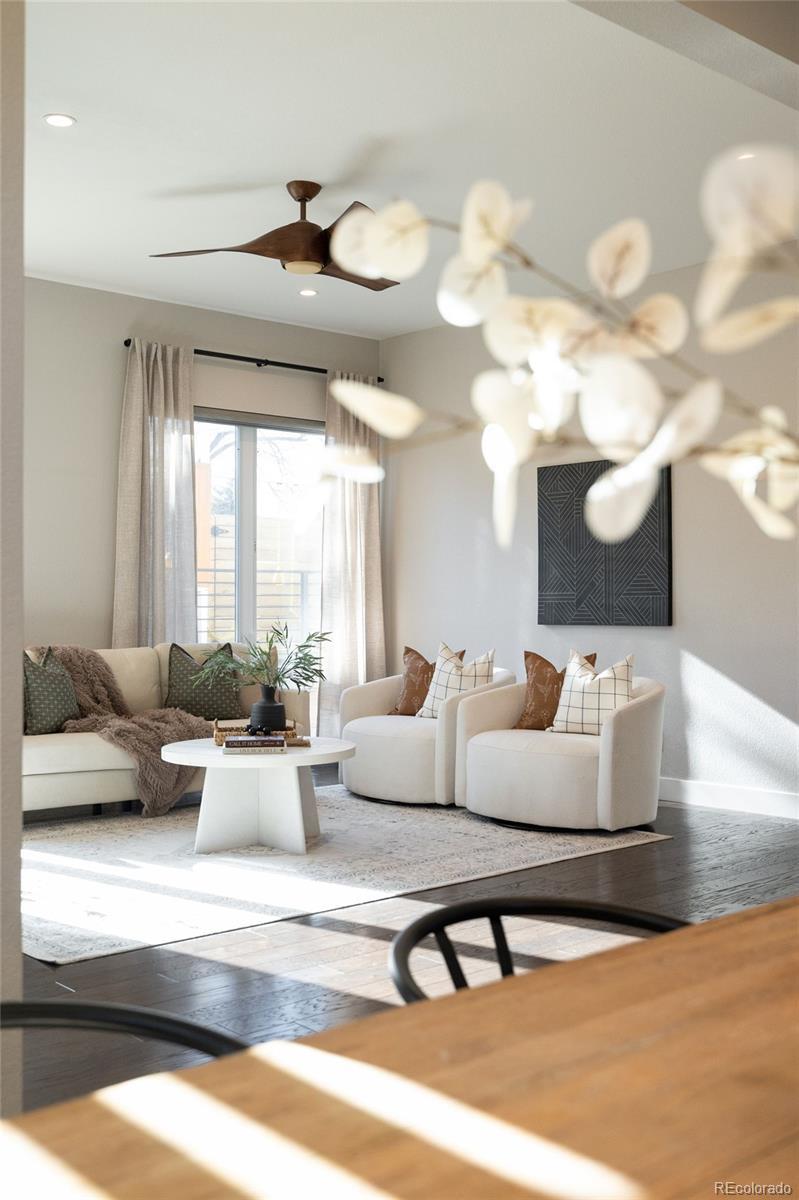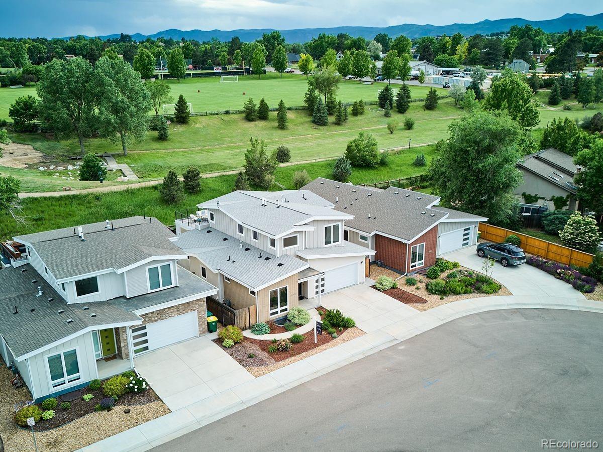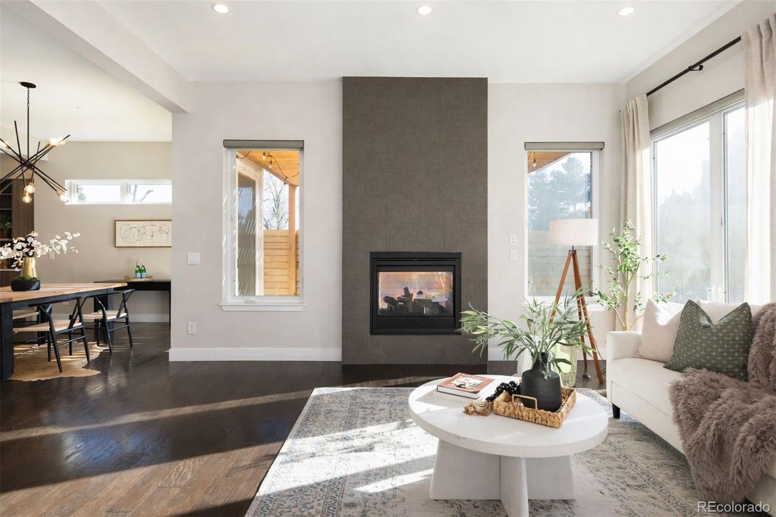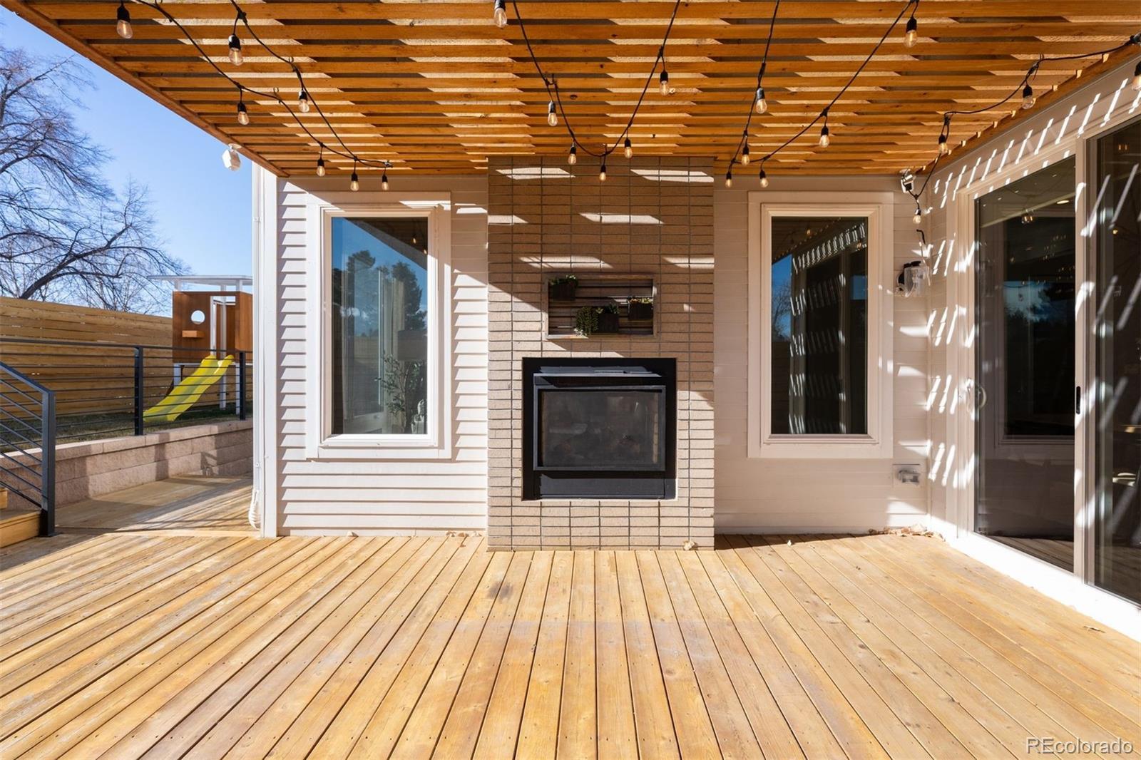 Welcome to this impeccably designed residence in the private nine-home enclave of Harlan Pines, tucked within a quiet cul-de-sac and backing directly to open space with mountain views. 6036 W. Keene Avenue is a fully built-out offering with 5 bedrooms, 5 bathrooms, and a finished basement, setting it apart from most homes in the community. The main level features an open, light-filled floor plan with soaring ceilings, expansive windows, upgraded designer lighting, and wide-plank hardwood floors. A signature two-sided indoor/outdoor fireplace anchors the great room and connects seamlessly to a covered patio and professionally landscaped backyard—ideal for entertaining or quiet evenings outdoors. The chef’s kitchen blends style and function with quartz countertops, stainless steel appliances, modern European cabinetry, and an inviting dining area that flows into the living space. A sought-after main-level primary suite offers dual walk-in closets with built-ins and a spa-inspired five-piece bath. The main floor is completed by a dedicated home office, and powder bath. Upstairs, two bright bedrooms share a Jack-and-Jill bath, while a versatile loft opens to a private rooftop deck with stunning foothill views—perfect for morning coffee or sunset gatherings. The finished basement significantly expands livability, offering a large recreation area, a private guest suite with full bath, and a fully built-out secondary laundry suite, ideal for multi-generational living or extended guests. There is also ample storage. Additional highlights include upgrades throughout, dual-zone air conditioning, smart home features, motorized blinds, radon mitigation, and a finished two-car garage. Meticulously maintained and move-in ready, this home delivers architectural style, flexibility, and low-maintenance luxury—just minutes from trails, parks, and the best of Lakewood living.