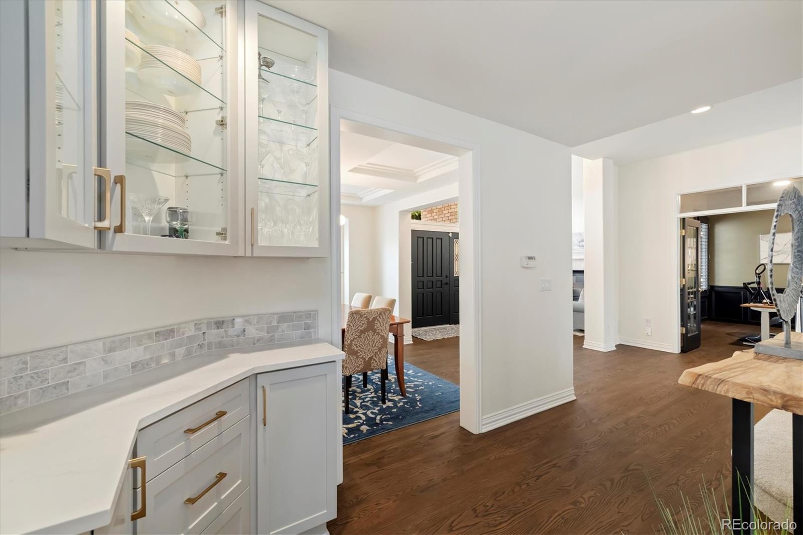 Tucked inside sought after Heritage West, along a quiet cut-de-sac with little traffic, this custom construction home by Celebrity Homes has been thoughtfully refreshed by owners who must relocate sooner than planned. The terraced landscape to the front entry with brand new garage doors set a polished first impression for what's in store. Stepping inside you are greeted by an airy foyer and solid hardwood floors throughout that are finished in a soothing natural wood tone; perfect for any decor style. The stylish executive office space has been curated with custom finishes that make work from home days easy and practical for all your needs. Within the recently renovated kitchen, careful attention to details are evident throughout; featuring high-end appliances, huge walk-in pantry, retractable cook vent, gas cooktop, solid quartz countertops w/ extended kitchen island, and custom cabinets - perfect for those everyday and even special occasion needs. Adjacent to the kitchen is a sunny dining nook that overlooks the expansive deck for effortless indoor outdoor living. Rounding out the main level includes a spacious yet cozy family room w/ fireplace and custom shelves, formal dining room, powder bath, and a renovated mudroom. Unwind in the primary suite with the cozy gas fireplace, custom bookcase shelving, and a huge walk-in closet! The spa like 5-piece ensuite bathroom includes heated flooring, soaking tub, walk-in shower, and separate vanities. The three spacious guest bedrooms upstairs offer ensuite baths and walk-in closets. The fully finished basement rounds out this stunning home; enjoy the spacious media room w/ stone surround fireplace, custom bookshelves w/ media center, wet bar, and wine cellar w/ adjoining tasting room. The 5th bedroom in the basement offers a private ensuite. Heritage West amenities include: Community pool, Tennis Courts, Pickleball, Basketball, Garden, Green Spaces, Swim Team and robust Social Activities! Welcome home.