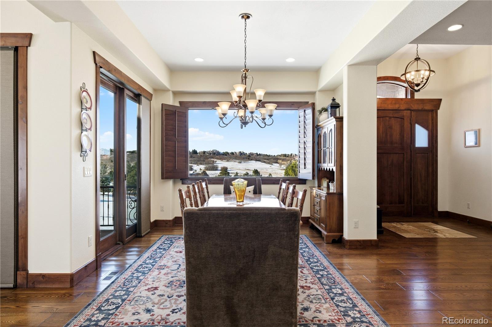Located at the end of a quiet cul-de-sac in Diamond Ridge Estates, this custom 2015 ranch-style home with a walk-out basement sits on 1.45 acres, offering privacy, space, and refined craftsmanship just minutes from Castle Rock amenities. A short flight of stairs leads to the main living level, where an open-concept design unfolds across 4,131 finished square feet. Warm hardwood floors, plantation shutters throughout, expansive windows, and two stone fireplaces highlight the quality materials and custom craftsmanship found throughout the home. The chef’s kitchen features quartz countertops, oversized island seating, custom wood cabinetry, stainless appliances, double ovens, gas cooktop, and a walk-in pantry, flowing seamlessly into the dining and great room—ideal for both everyday living and entertaining. Outdoor living extends from the main level to a covered deck overlooking the property. The main-level primary suite offers a peaceful retreat with deck access, large walk-in closets, and a spa-inspired bath with soaking tub, walk-in shower, and dual vanities. All bedrooms in the home feature generously sized closets, providing excellent storage. The walk-out lower level adds flexibility with two additional bedrooms connected by a Jack-and-Jill bath, a spacious family and recreation room with fireplace, 1/2 bath, fitness or flex spaces, and ample storage—well-suited for guests or multigenerational living. Active residents of Diamond Ridge Estates enjoy access to pickleball, tennis, basketball, and a community pool, while still maintaining a serene acreage lifestyle. Conveniently located near I-25, downtown Castle Rock, Castle Pines, trails, and top Douglas County schools, this home delivers Colorado living defined by space, quality, and comfort.