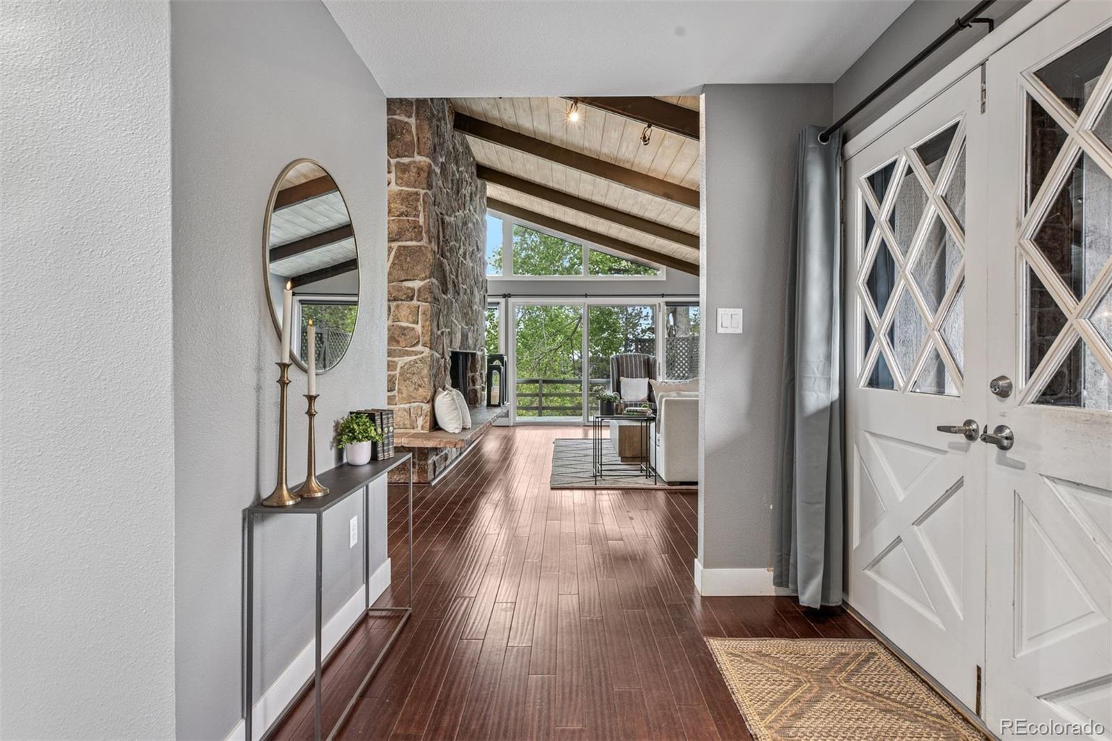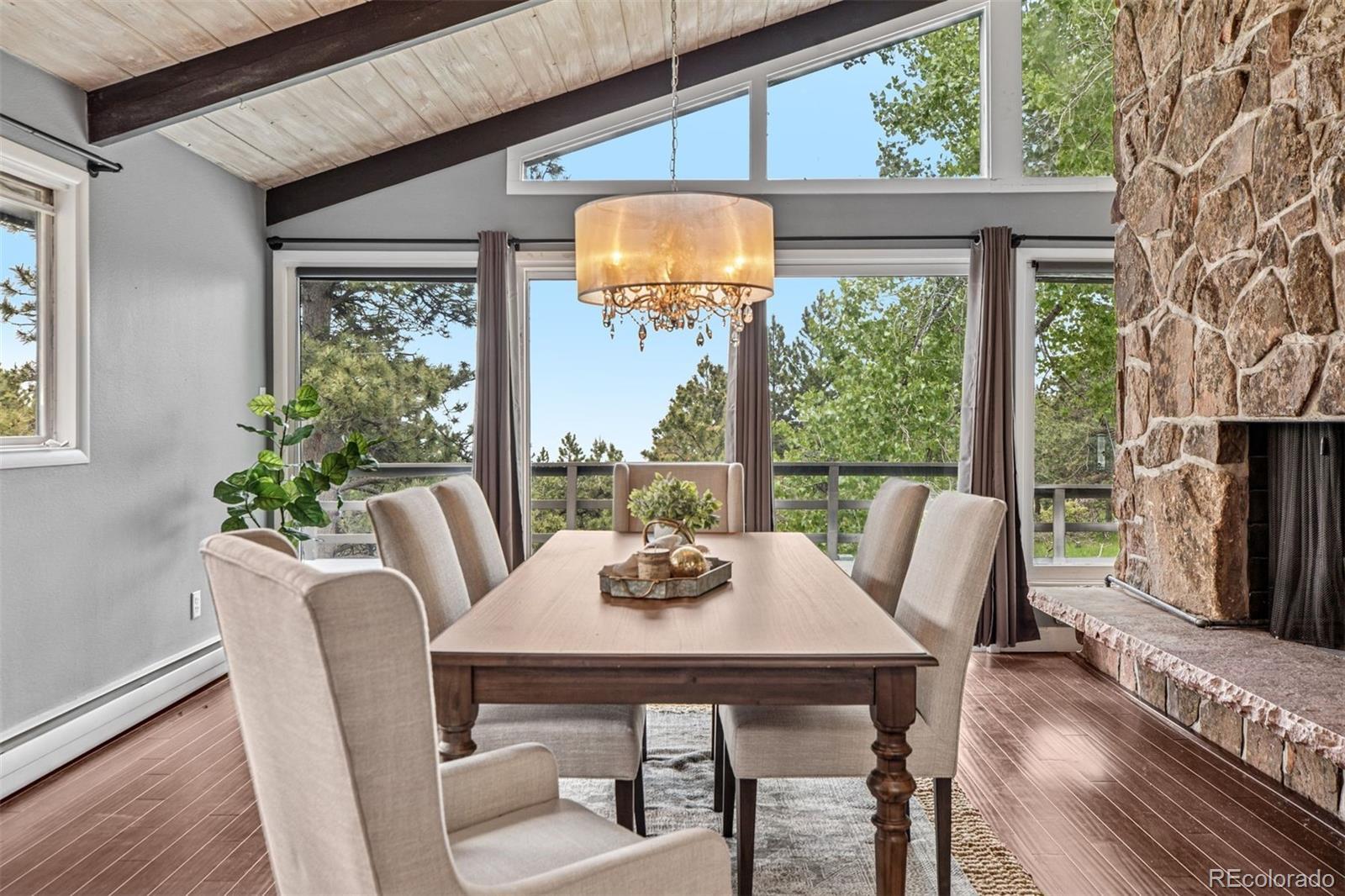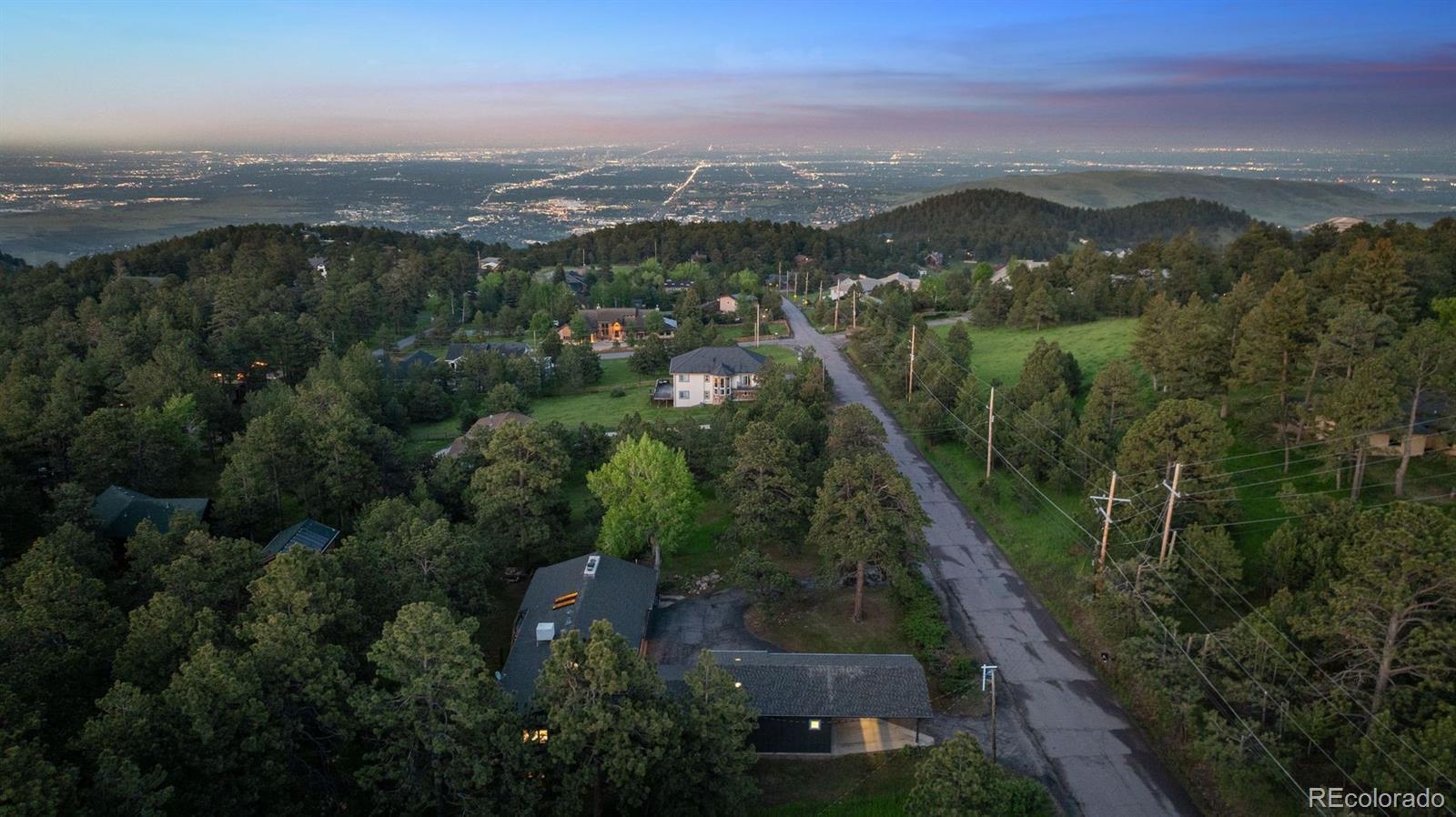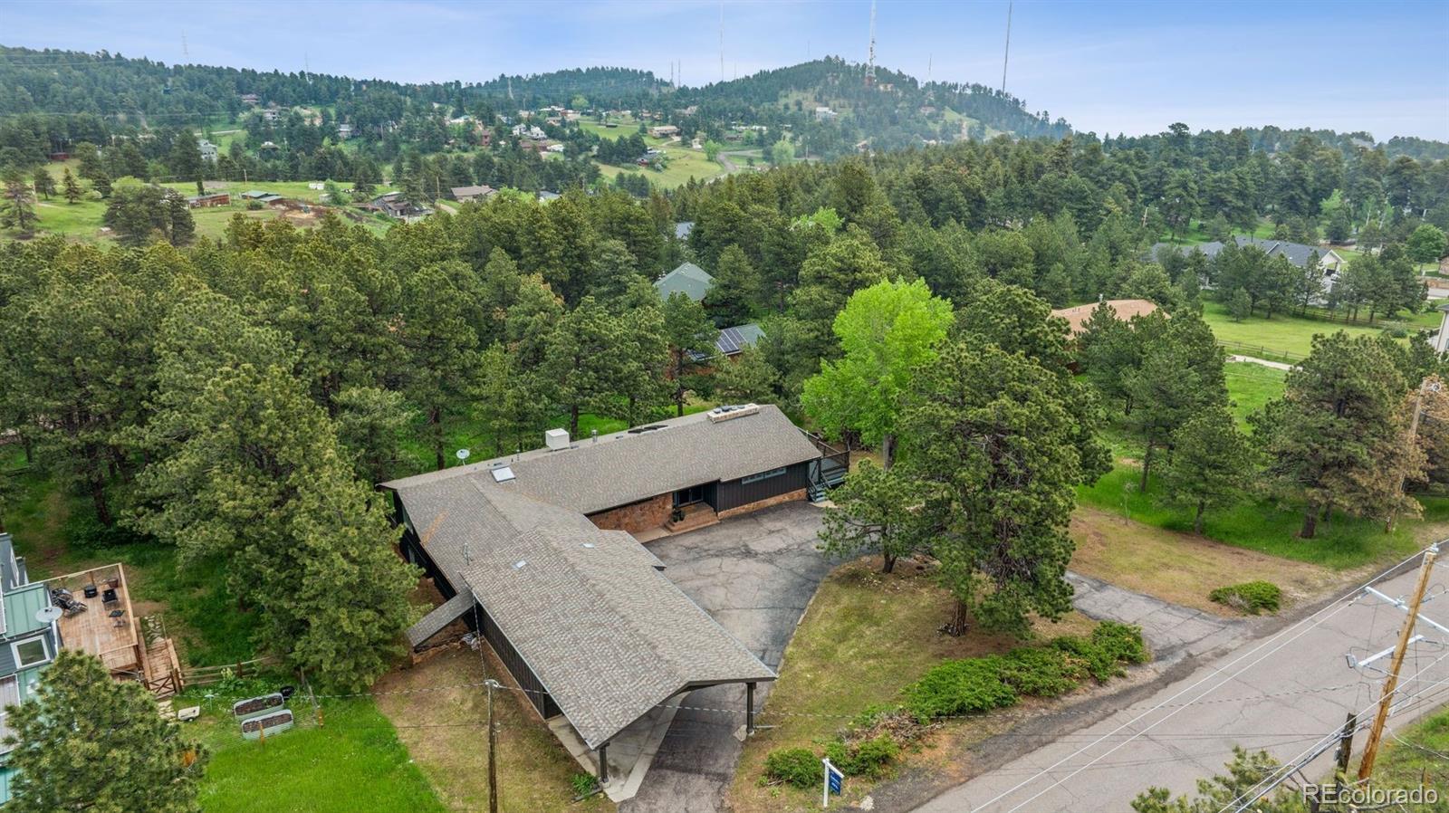 Welcome to this timeless mid-century ranch nestled on over an acre along a quiet, paved road atop scenic Lookout Mountain. Blending classic charm with contemporary finishes, this home offers "peek-a-boo" views of Denver from its expansive east-facing deck—perfect for enjoying your morning coffee. Inside, a bright and open floor plan greets you with vaulted wood ceilings and a dramatic floor-to-ceiling stone fireplace that artfully separates the living and dining areas. A multitude of windows bathe the home in natural light. The thoughtfully designed kitchen features granite countertops, stainless steel appliances, a charming bow window above the sink, and a spacious breakfast bar—ideal for casual dining. An entry-level primary suite offers privacy and comfort, complete with a jetted tub, walk-in shower, dual vanities, and a generous walk-in closet. A second bedroom and full hall bath complete the main level. The fully finished walk-out lower level offers exceptional flexibility, boasting a large family room with a second fireplace, three additional bedrooms (each with WIC), a full bath, oversized laundry room, and a cedar-lined closet—perfect area for guests, multi-generational living, or a home office setup. Car enthusiasts and hobbyists will love the two oversized, two-car garages—one heated with extra-high ceilings—and an attached carport for additional parking. The covered breezeway connects one garage to the house for protection against inclement weather. The large, fenced area in back is perfect for dogs with convenient deck access. Additional upgrades include a freshly painted exterior, new carpet in the lower level, and a whole-house water filtration system. Surrounded by natural beauty and abundant wildlife, this unique mountain property offers seclusion, convenience, and a short walk to hiking and biking trails! Ideal location just 25 minutes to Downtown Denver and an hour to world-class skiing. Don’t miss your chance to own this special retreat.