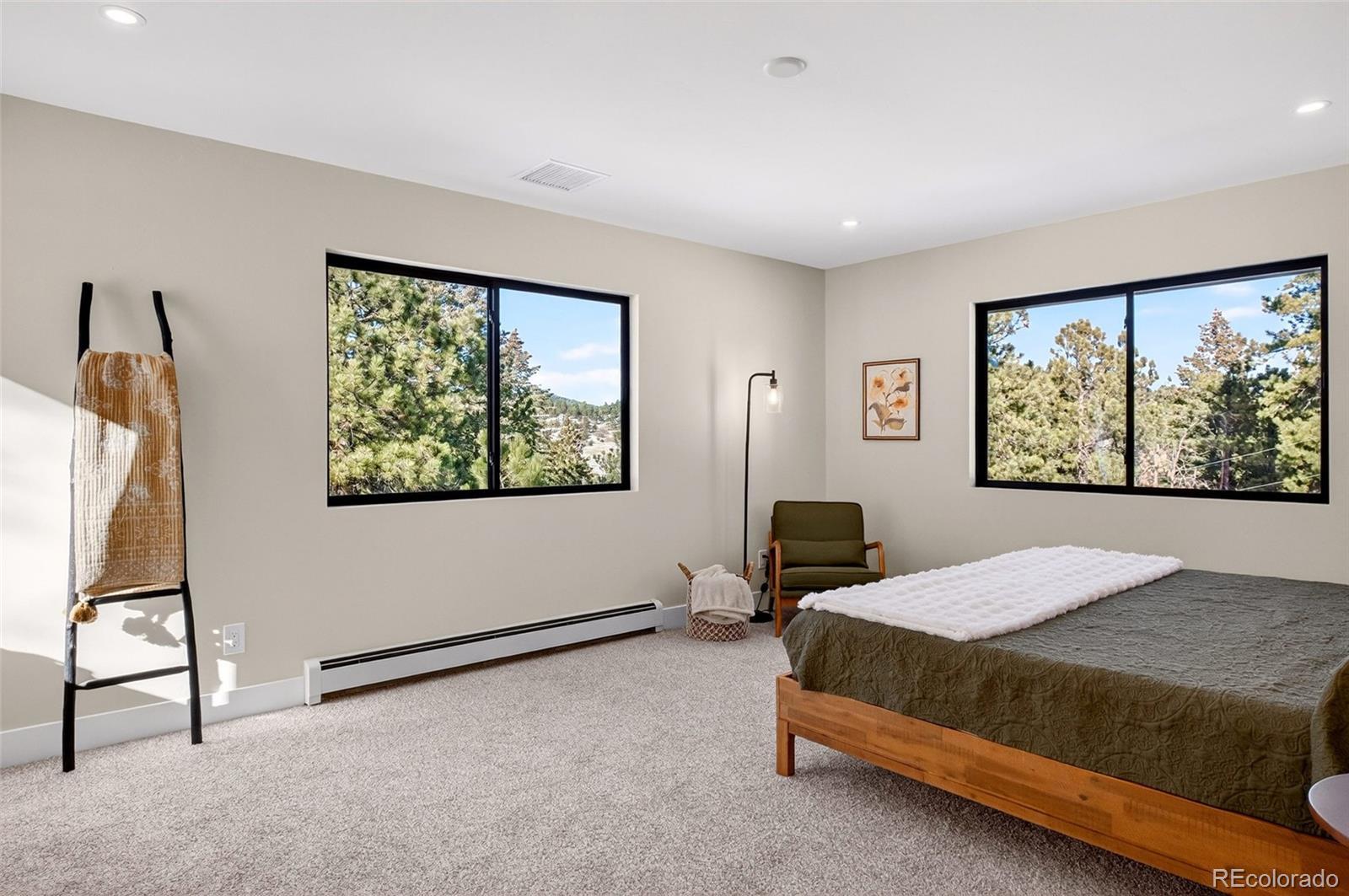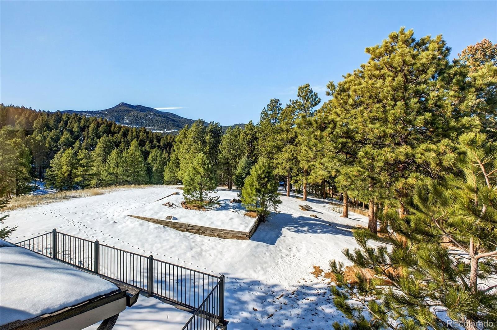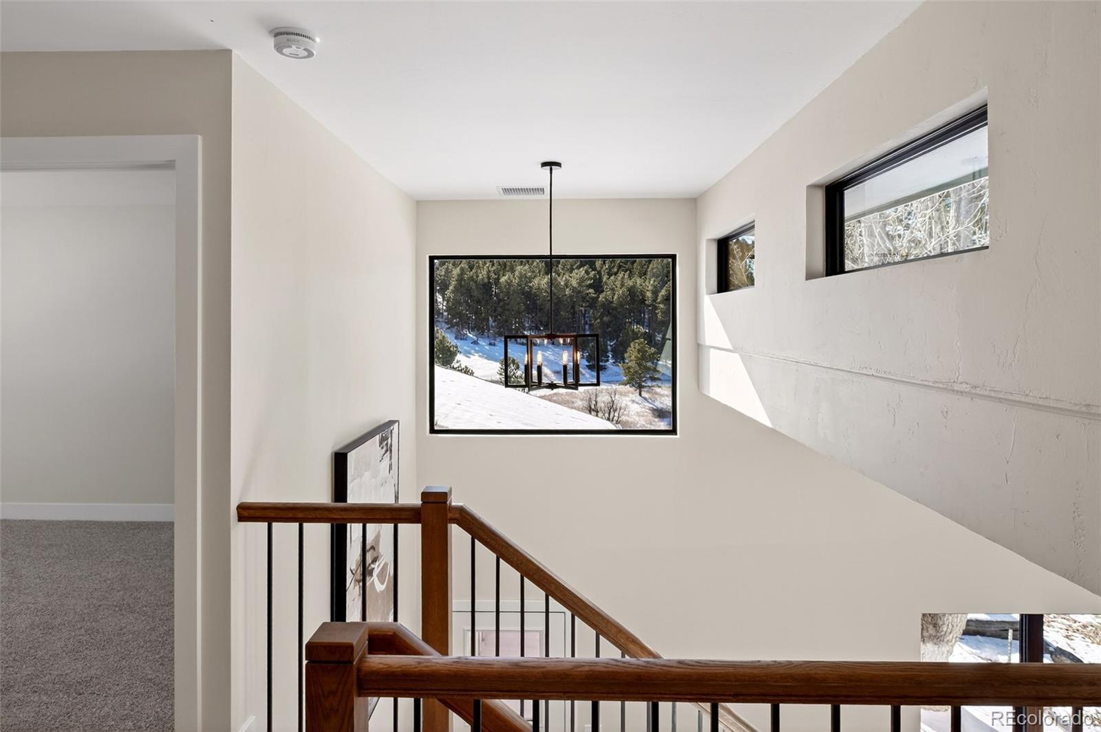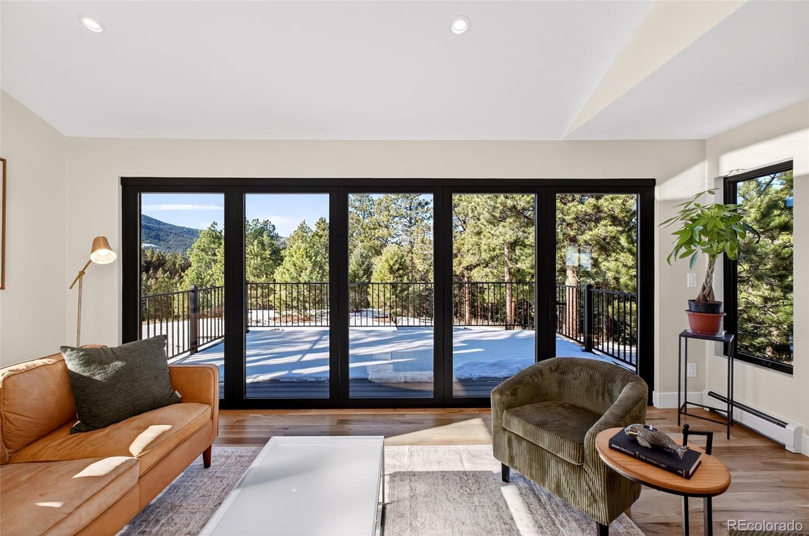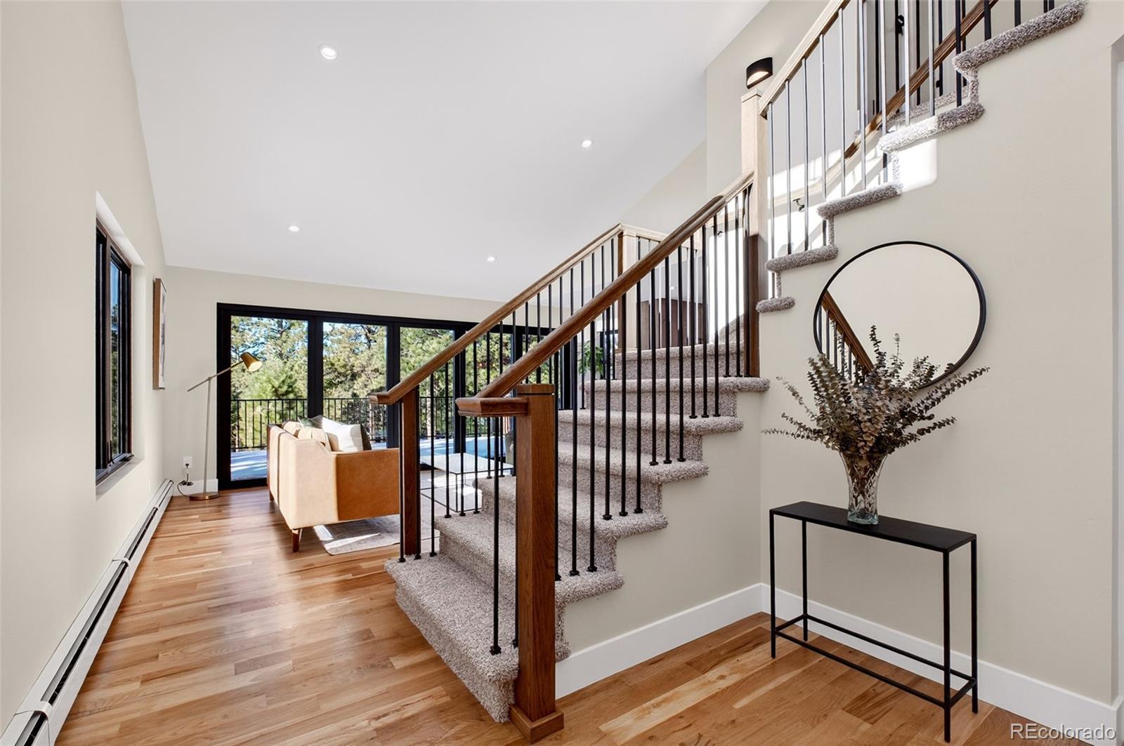 Post modernism architecture meets the finishes of new construction. Elegant open concept vaulted great room features metal banister staircase and a moving glass wall system that provides a wall of windows to the mountain views, or a completely open wall to extend the living room out onto the new Trex deck. Open concept kitchen provides a large island, Custom cabinetry, Coffee Bar, and A walk in Pantry. NEW Stainless appliances include induction cook top, range hood, and drawer microwave. Solid quartz counters offer expansive workspace. Large main level laundry doubles as a mud room. Primary suite is a bright escape with windows on three walls! Prewired for ceiling fan. Ensuite bathroom with walk in shower, two separate vanities for added storage and a smart toilet. Pocket door to the large walk-in closet. Two additional bedrooms and a second bathroom, also with dual sinks, complete the upper level. Hardy board siding for longevity and low maintenance. LED lighting throughout and Energy Star Certified New windows create a highly efficient living space. Wide panel, white oak plank flooring throughout the main level. Cozy carpeting up the stairs and in the bedrooms. A mountain home with Air Conditioning! NEW boiler and baseboard hot water heat also for those with a preference for the quiet and hypoallergenic benefits of baseboard radiant heating. New roof in 2025 with Class IV Impact resistant shingles. Large open finished walk-out basement complete with a fourth bathroom. Updated Electrical and all NEW Plumbing! This 17-acre Horse Property has combined topography including rolling meadow and forested hillside to the back. The front meadow is home to a seasonal pond. County maintained road provides year-round access. And closeness of the highway allows for great commute times: 17 minutes to Red Rocks Amphitheatre, 34 minutes to downtown Denver. Much easier drive if you follow directions in this listing rather than GPS.