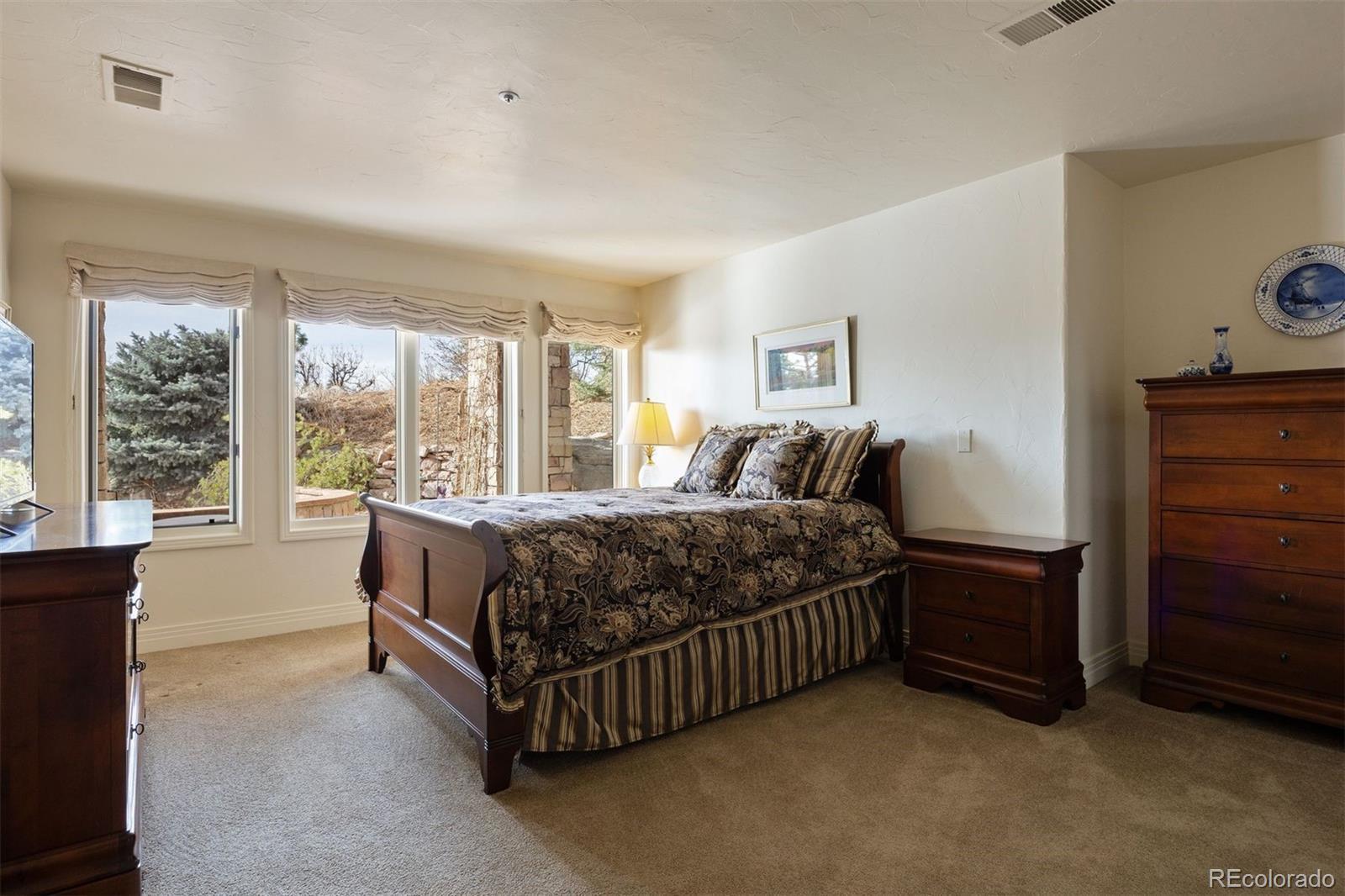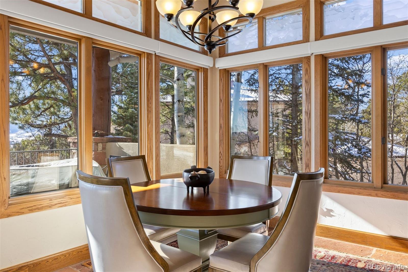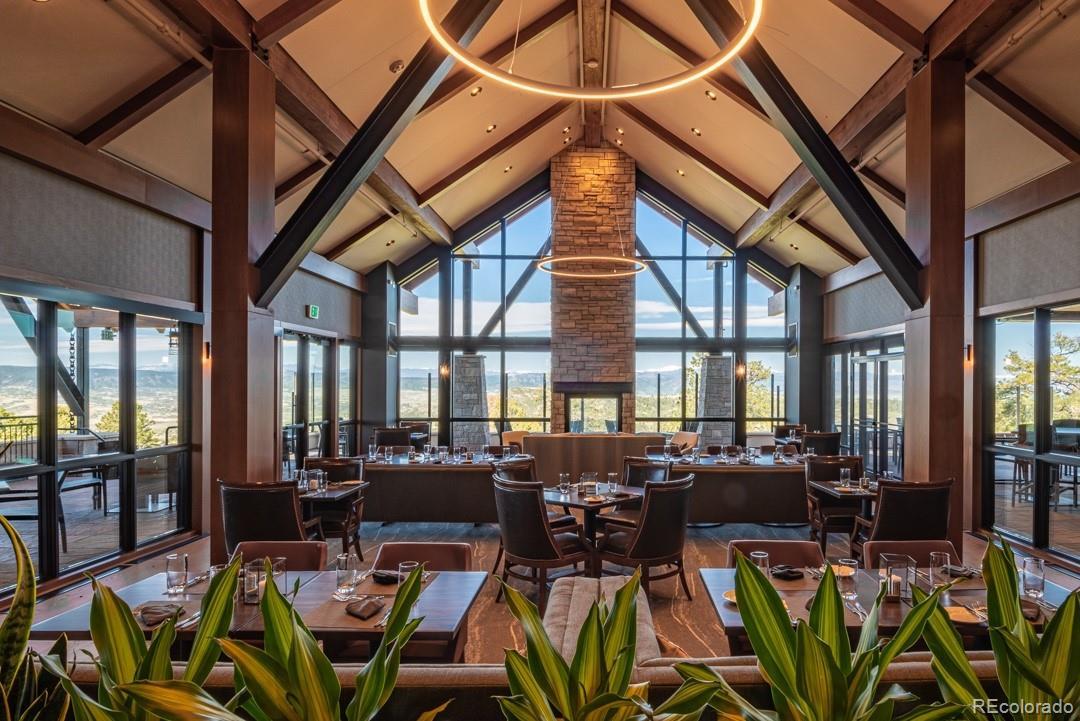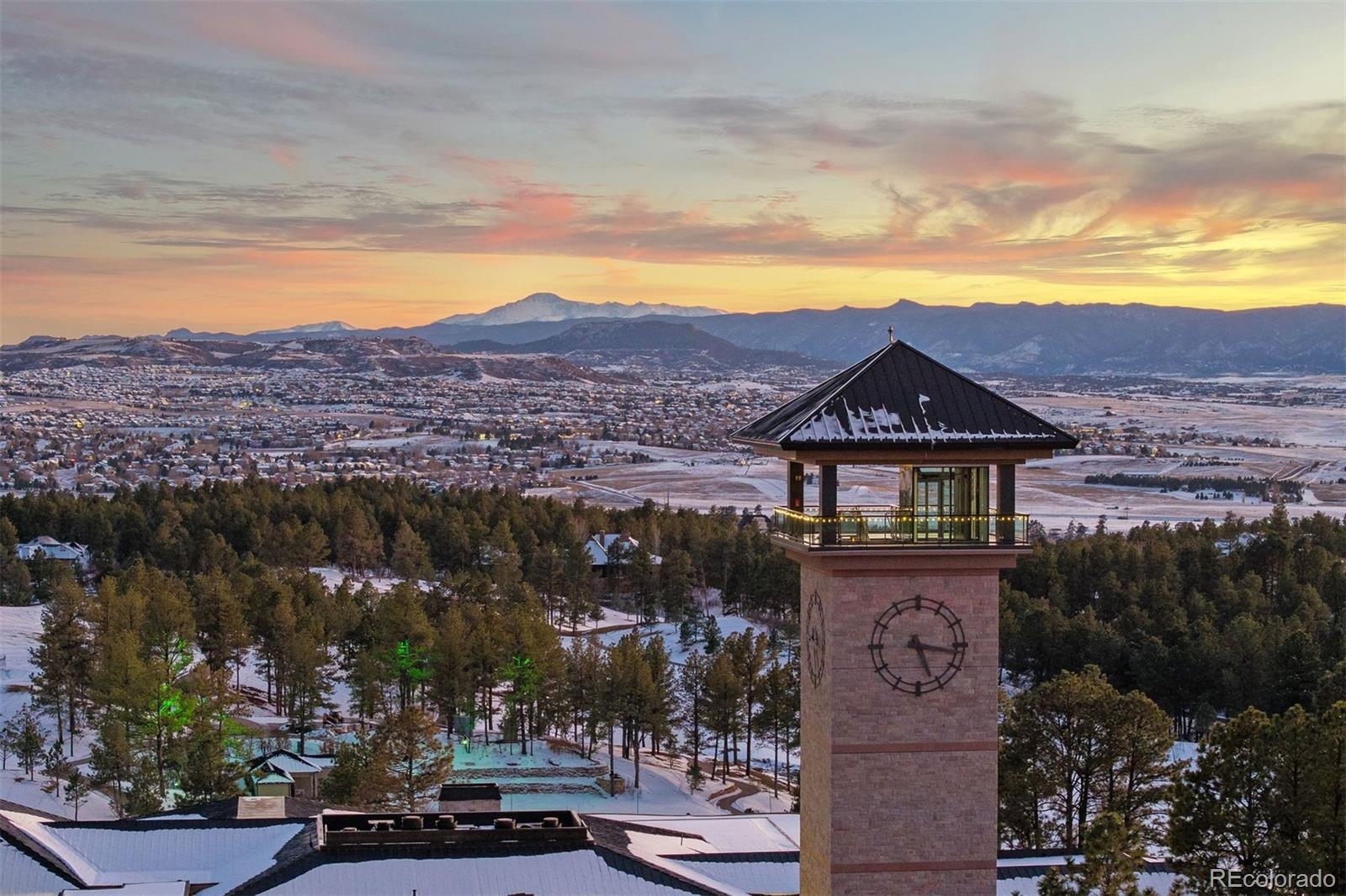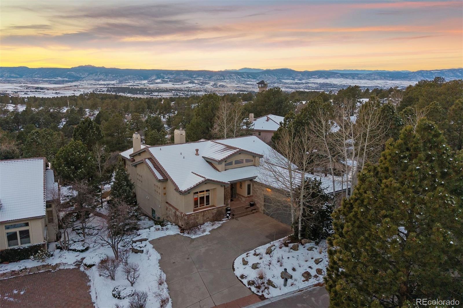 Rare, awe-inspiring mountain views majestically unfold across the horizon and command your full attention at this luxury 3 bedroom | 4 bathroom residence. Tucked within a private enclave of the gated Village at Castle Pines community, this home sits adjacent to the exclusive Castle Pines Golf Club, host of the 2024 BMW Championship, and offers rare proximity to this revered course. As you enter the lodge-inspired foyer, floor-to-ceiling windows provide a sweeping panorama. Just off the entry, an executive office with rich wood detailing and glass-faced doors presents a refined workspace, while the formal dining room is perfect for gathering family and friends alike. Continuing on through the main level, the great room anchors the home with soaring ceilings and a window wall that frames breathtaking, wide-open mountain views, complemented by a stone fireplace. A sun-filled breakfast nook opens to a large deck, perfect for wildlife viewing over morning coffee and sunset dinner parties, and sits adjacent to the recently remodeled kitchen with Viking appliances and granite counters. A convenient main level primary suite offers more stunning mountain vistas, separate outdoor access, and a setting designed to capture the surrounding landscape. The renovated primary bath has quartz counters, LED-lit mirrors, a soaking tub, and a walk-in glass shower with custom tilework, while a functional laundry room and stylish powder room complete the main level. Downstairs, the walkout lower level features a custom wet bar, family room with a stone fireplace, game room, two en suite guest bedrooms with walk-in closets, and a flexible den - perfect for a gym or study. Conveniently located only 2 minutes to Gate 1, these homes seldomly come onto the market due to their quiet, coveted location, lock and leave nature, and spectacular vistas. Delivering architectural character, thoughtful updates, and one in 1,000,000 views at every turn, this mountain retreat is truly one of a kind.