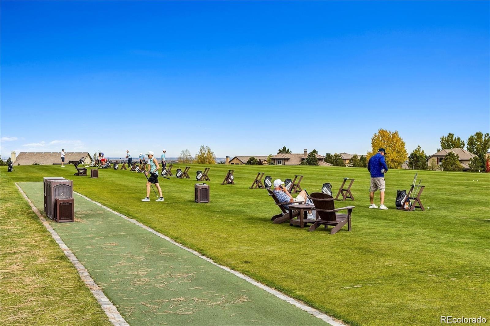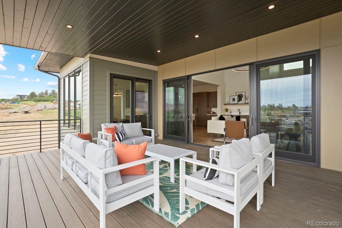 Tucked inside the gated Village at Castle Pines community and just steps from the award-winning Country Club at Castle Pines, this 4 bedroom | 5 bathroom residence is a RARE MOVE-IN READY WALK-OUT RANCH NEW CONSTRUCTION HOME AVAILABLE NOW IN THIS COVETED COMMUNITY. Inside, the sunlight-filled rooms feature wide plank hardwood floors, Visual Comfort lighting, and desirable level 5 flat finished walls. An inviting chef’s kitchen includes Thermador appliances, a generously sized quartz island, dual dishwashers, walk-in pantry, and a flexible prep or serving space. The adjoining dining area, framed by expansive floor-to-ceiling windows and contemporary lighting, is perfect for entertaining. The open concept great room stuns with soaring ceilings, a sleek linear fireplace, and sliding glass doors that open to a covered deck with tongue-and-groove ceiling and a patio below. An elegant main floor office offers a quiet retreat. Nearby, the primary suite showcases large windows, plush carpeting, and a statement chandelier. The enormous en suite bath boasts dual vanities with quartz counters, sleek cabinets, and a floor-to-ceiling glass enclosed shower. A powder bath with a vessel sink adds convenience for guests, while a well-placed laundry room near the owner’s entry enhances functionality. On the lower level, the large walkout family room features a striking linear fireplace accented by a textured tile surround and opens seamlessly to the lower patio. Adjacent game and lounge spaces center around a wet bar, ideal for hosting. Two en suite secondary bedrooms are perfect for family and friends, and a fourth flexible bedroom may be used as a home gym or studio. A lower-level powder room completes the space. Surrounded by professional landscaping and poised in close proximity to the gates within one of Colorado’s most coveted golf communities, this home is an elegant expression of Colorado modern living where sophistication meets comfort in every detail.