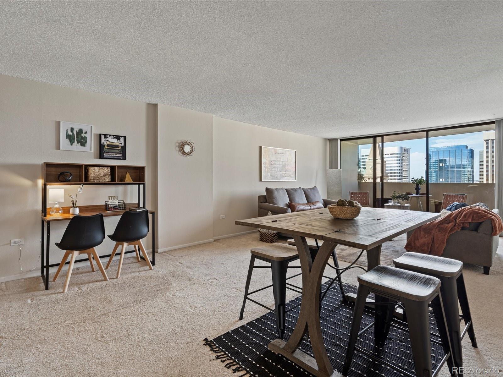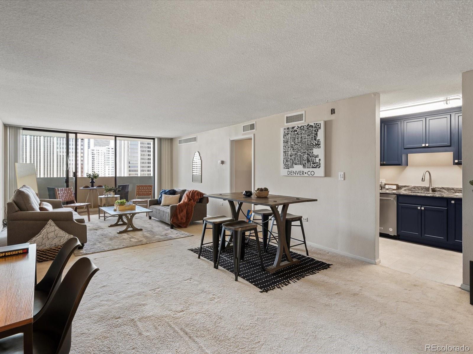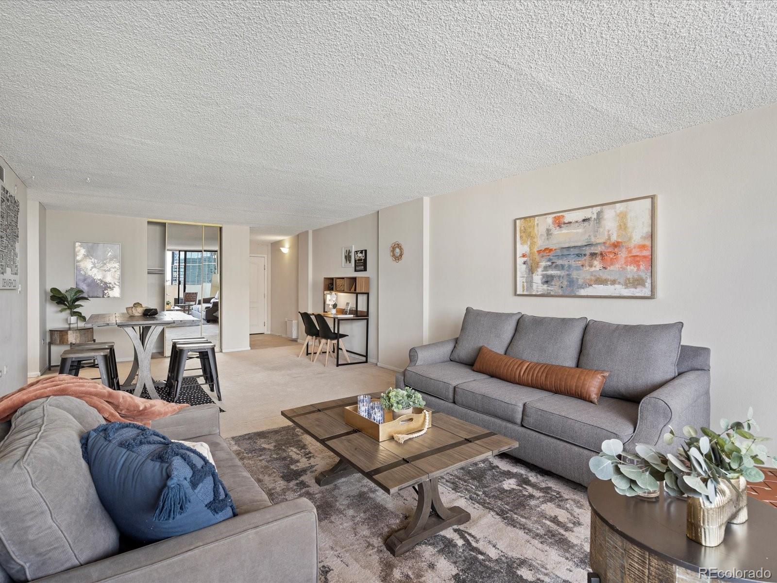 Welcome home to your urban sanctuary. This inviting condo effortlessly combines luxury and convenience. Upon entering you are greeted with an open floor plan and a breathtaking city view. Take in the views and all that Downtown Denver has to offer from your own private balcony large enough for dining and lounging. This home has been recently updated with new stainless steel appliances, shaker cabinets, and top of the line Brazilian Granite Counter tops in both Kitchen and Bathroom. Updates were done meticulously. Carpet was Replaced on 6/4/25, and home is no longer Staged. This is the ideal downtown location, in the heart of it all! Just outside your building doors are museums, theaters, shopping, restaurants, and nightlife. The building offers a city-scape pool, with 2 sundecks, a fitness room, conference center, and even a billiard room. All amenities are easily accessed on the 3rd floor. The HOA covers your water and heat, amazing amenities and the security and convenience of 24hr front desk service. Come take a look and see what the absolute best of downtown Denver living has to offer! If you are not interested in having a parking spot - the seller is willing to sell them separately, lowering the purchase price of just the condo.