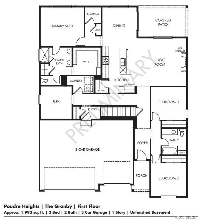 Unfinished Basement for future customization and storage! Ask a sales counselor about optional rear yard fencing!! Welcome to the Granby — a thoughtfully designed ranch-style home that blends comfort, functionality, and style. As you step through the inviting foyer, you'll find two spacious bedrooms and a full bathroom conveniently located to your right, ideal for family or guests. The heart of the home opens into a beautifully integrated kitchen and great room, creating a seamless space for entertaining and everyday living. A unique flex space is tucked away just off the garage, offering privacy and versatility — perfect for a quiet home office, creative studio, or workout area. With a generous three-bay garage and a single-story layout, the Granby offers both convenience and charm in a spacious 1,993 square feet. Meritage Homes is known for quality construction, innovative design, and exceptional energy efficiency—thanks to features like advanced spray foam insulation. With transparent, all-inclusive pricing, every home includes appliances, blinds, and designer upgrades, ensuring a truly move-in ready experience that reflects our commitment to excellence and sustainability. Nestled in the heart of Windsor, Poudre Heights offers the perfect balance of small-town charm and modern convenience. Enjoy nearby parks like Eastman Park and Windsor West Park for outdoor fun. Shop and dine at The Promenade Shops at Centerra or Windsor Town Center, just minutes away. Whether you're planning a family outing, a date night, or a quick errand run, everything you need is right around the corner!