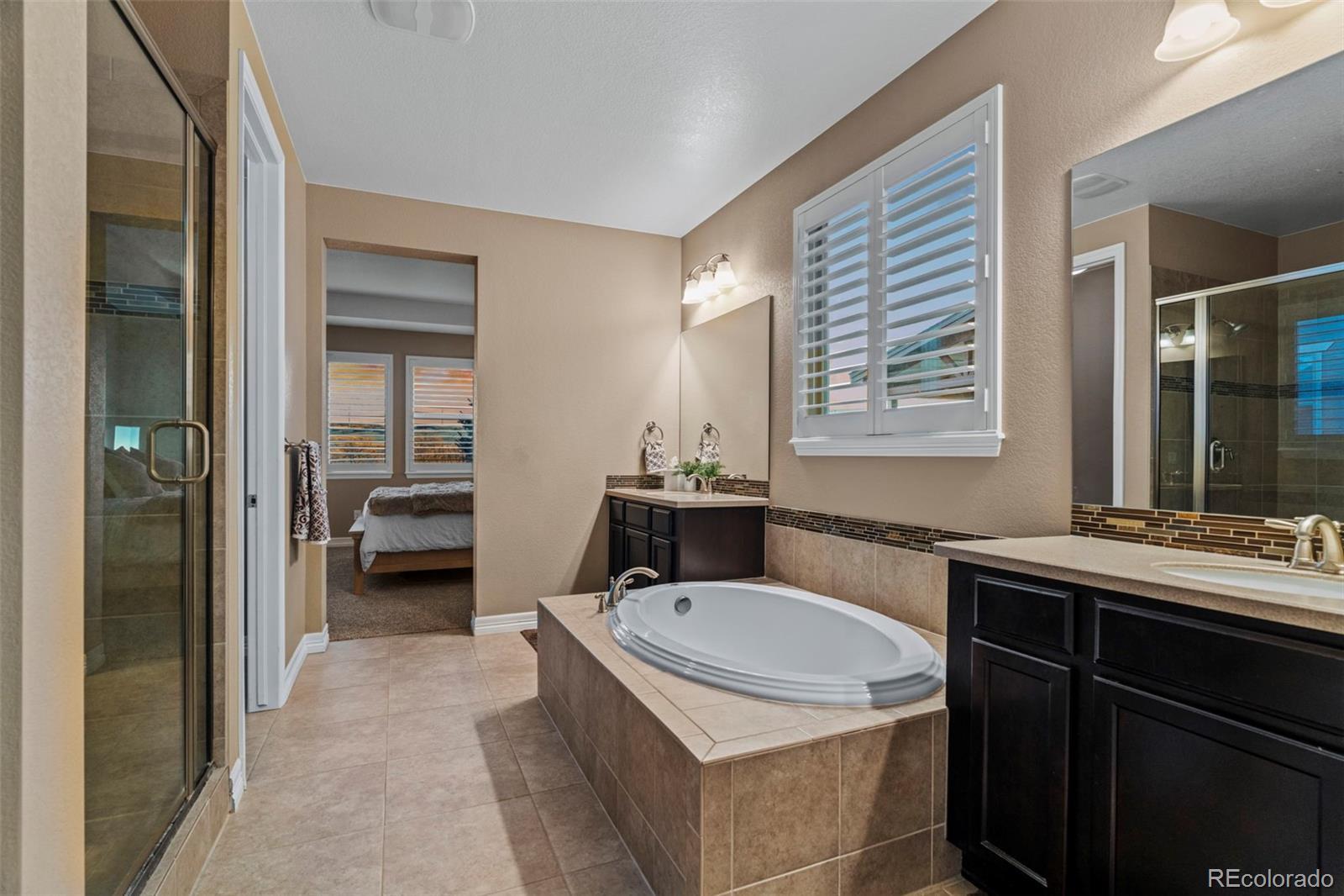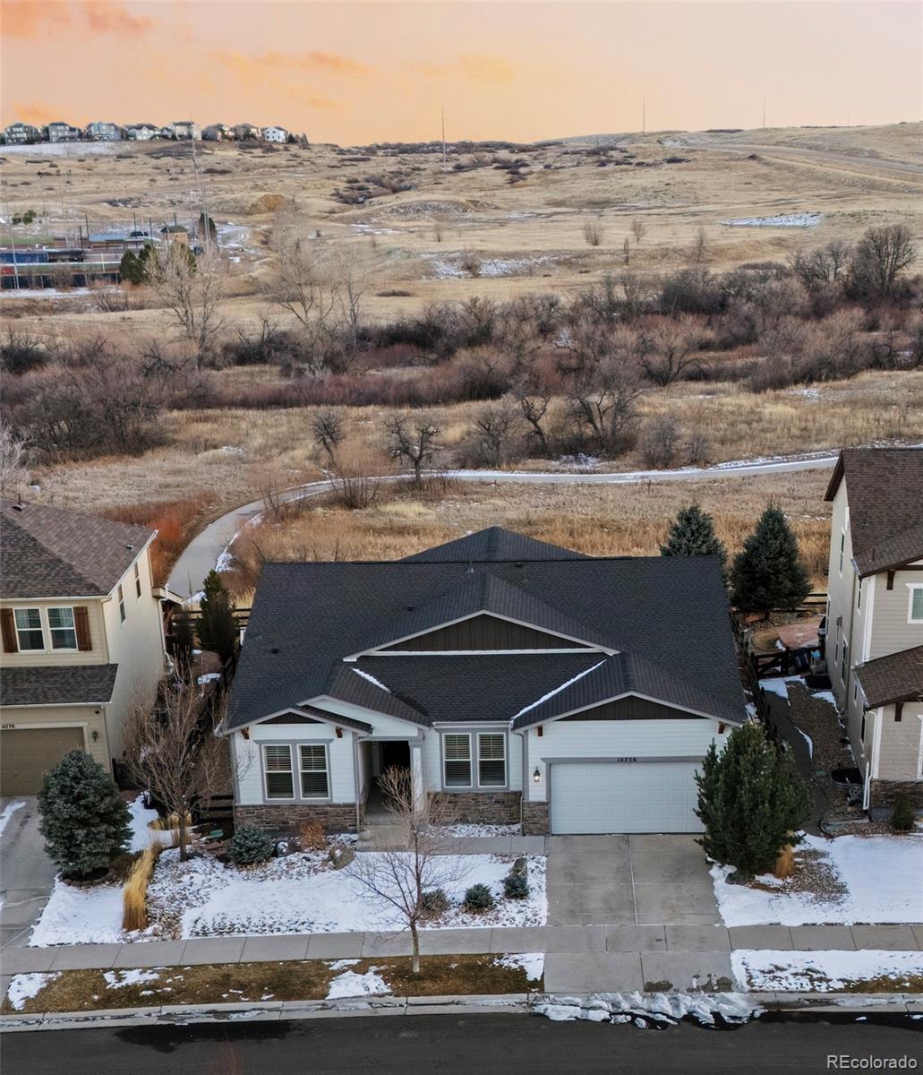 This incredible, meticulously maintained 4 bedroom, 5 bath, 4,786 sq ft ranch-style home backing to dedicated open space is truly breathtaking and priced to sell. The main floor showcases hardwood floors, plantation shutters, hand-troweled walls, and 8’ doors throughout. The gourmet kitchen features quartz countertops, 42” staggered ivory white cabinets with crown molding, a large walk-in pantry, double ovens, a 4-burner gas cooktop, and a modern white French-door refrigerator with freezer drawer, plus an elegant butler’s pantry and breakfast nook. The spacious family room is filled with natural light from oversized windows and southern exposure and is complemented by a formal dining room or study. The private owner’s suite offers a tray ceiling and a luxurious 5-piece bath with dual vanities, custom backsplash, a glass-enclosed shower with bench, and a large walk-in closet. Two additional main-floor guest suites each feature their own full bath, along with a main-floor laundry room and powder bath. The 3-car tandem garage includes finished and painted walls. The 2,393 sq ft fully finished basement is ideal for entertaining, offering a massive recreation room plumbed for a wet bar, open study area, an additional guest suite with adjacent full bath, and over 600 sq ft across three separate storage and utility rooms. The rear exterior features a private covered Colorado Room and a professionally landscaped yard backing to breathtaking open space and trail views—some of the best in Parker. Just one block to the Heirloom community pool and clubhouse and minutes to Rueter-Hess Reservoir, Recreation and Challenge Incline, I-25, downtown Parker and Castle Rock, DTC, and DIA. An exceptional home in an unbeatable setting. New class 4 roof installed in 2024!