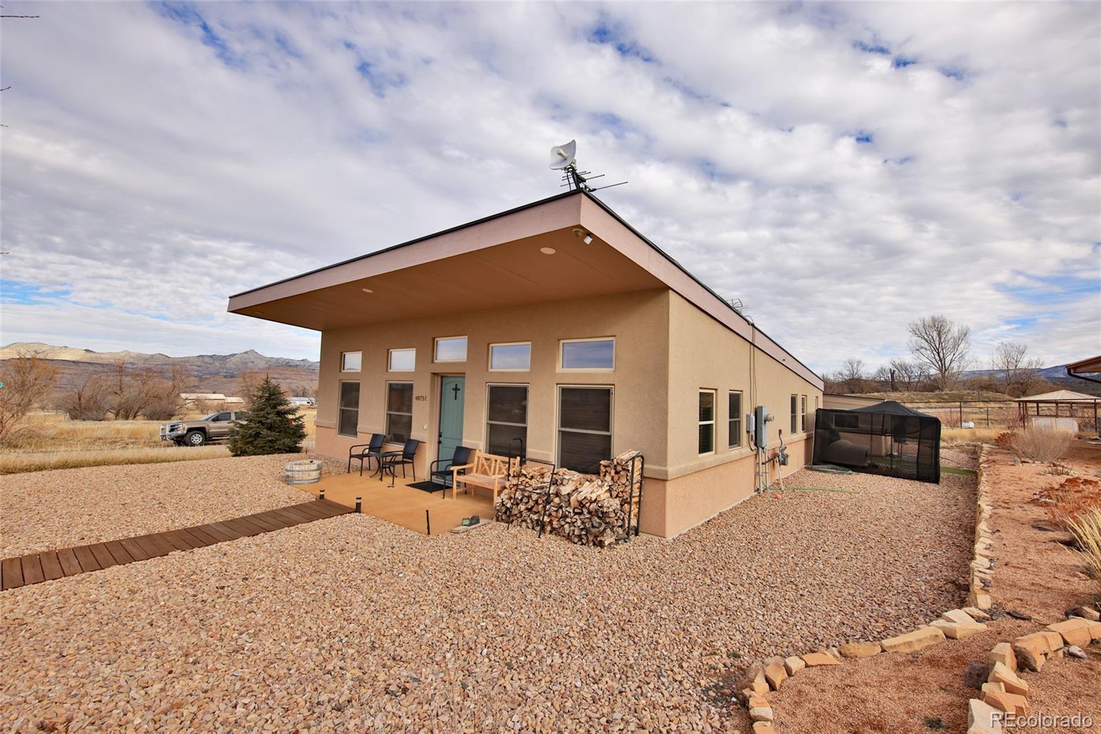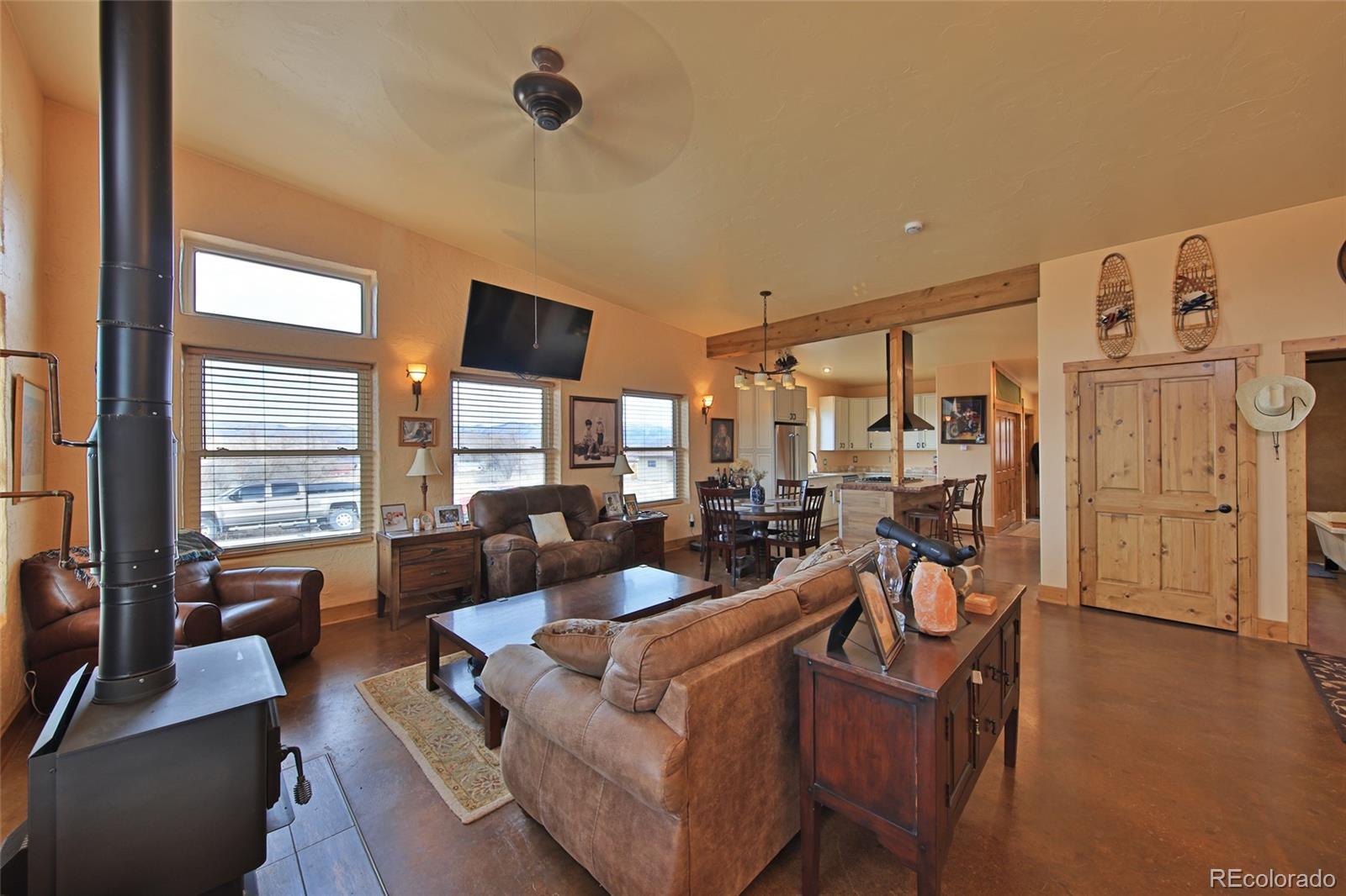 Experience modern comfort and mountain living in this 2018-built, energy-efficient home located in a desirable Western Colorado cooperative community. Featuring high-end finishes throughout, this two-bedroom, one-bath residence blends style, function, and sustainability. Covered patios and keyless entries welcome you into an open-concept living, dining, and kitchen area beneath vaulted ceilings. Enjoy the comfort of radiant floor heat and a wood stove with a preheat system for the boiler. Insulated windows and doors, along with wood trim and beams, accent the stained concrete floors, creating a warm, inviting atmosphere. The gourmet kitchen features a tasteful mix of quartz and granite counters, a dual fuel range featuring a gas cooktop with range hood and double electric ovens, breakfast bar, custom cabinetry, and stainless steel appliances—the perfect setup for entertaining or home cooking. The spacious laundry room includes a washer, dryer, countertop, cabinets, and sink for added convenience. The luxurious bathroom boasts a double-sink vanity, walk-in tiled shower, soaker tub, and commode. Retreat to the primary bedroom with a walk-in closet and private patio access, leading to an enclosed sauna. The second bedroom features a triple-door closet. Additional spaces include a maintenance room for easy home care. All interior and exterior doors are ADA-compliant and 3 ft wide. This home also includes a bamboo charcoal water filter, as well as a water softener system, whole house surge protection, 200-amp electrical service, dual 30-amp generator hookups, and evaporative cooling. Ceiling fans, recessed lighting, and stylish fixtures enhance comfort and ambiance throughout. The detached oversized 2-car heated garage features automated doors and extra storage space. The home is constructed with 12-inch-thick walls insulated with 3 inches of Rockwool.