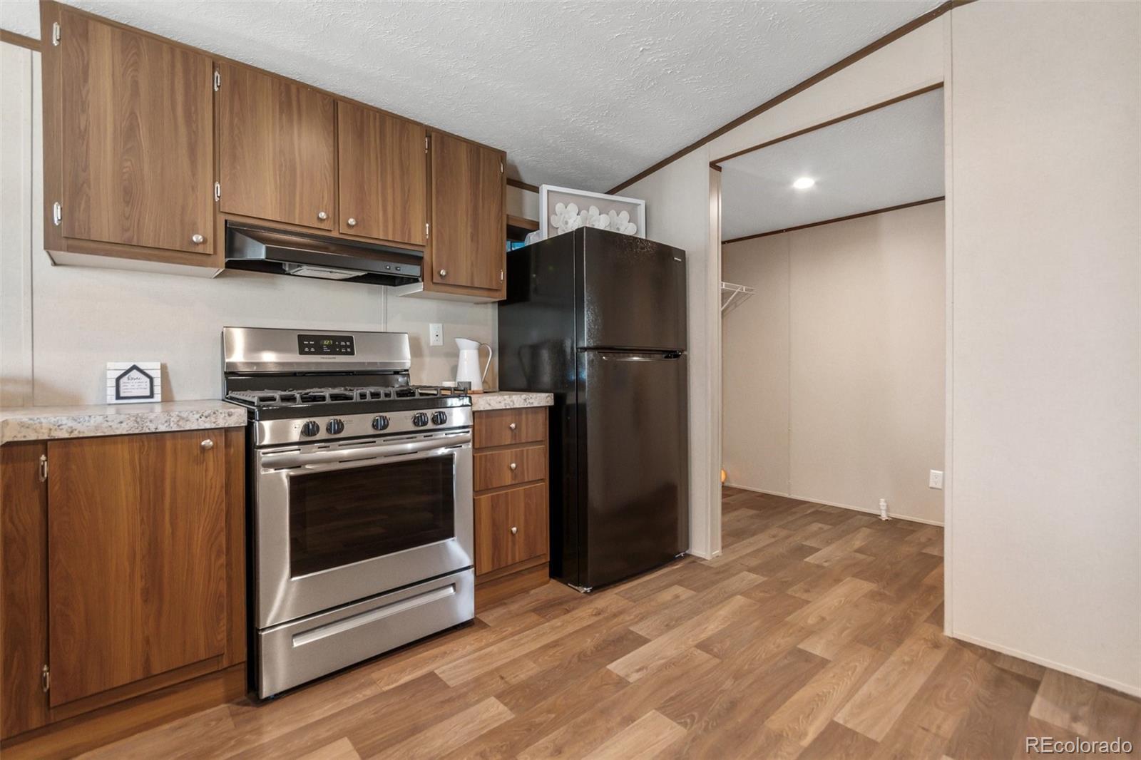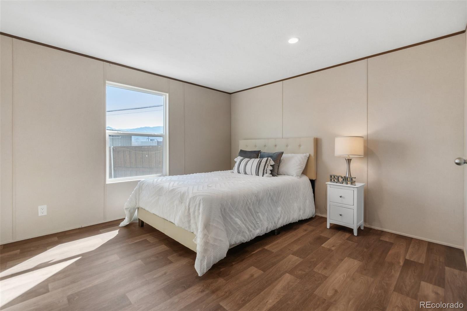 Welcome to this beautifully updated 2-bedroom, 1-bath home nestled in Colorado Springs Estates! This move-in ready home combines modern finishes with a comfortable layout, perfect for everyday living. Step inside to discover a bright living area with vaulted ceilings, fresh neutral tones, and wood-style flooring throughout. The kitchen shines with rich cabinetry, sleek countertops, a gas range, black appliances, plus a large breakfast bar ideal for casual dining or entertaining. The spacious primary bedroom offers ample closet space, while the secondary bedroom provides flexibility for guests, an office, or hobbies. The full bath includes updated fixtures and plenty of storage. A dedicated laundry area adds convenience with washer and dryer included. Outside, enjoy low-maintenance landscaping and a fully fenced yard with space for gardening, pets, or relaxing in the Colorado sunshine. The private patio is perfect for outdoor dining while taking in nearby views of Pikes Peak and the Front Range. This community is located just a short distance to Garden of the Gods, Manitou Springs and Cave of the Winds Mountain Park. Plus there is shopping, dining and parks very close and quick access to I-25.