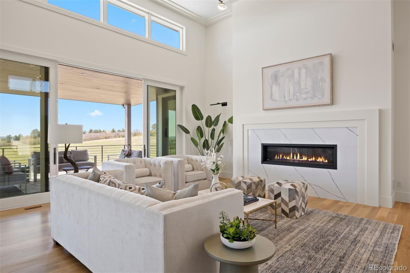 MODEL HOME SALE! With recent contracts on 2 of the few remaining Back Tees homes, the model home is ON SALE with a $50,000 price adjustment reflected in the current list price. This brand new 4 bed | 5 bath residence is THE ONLY MOVE-IN READY NEW CONSTRUCTION WALKOUT RANCH in The Village at Castle Pines. Positioned just steps from the private Country Club, this CUSTOM home offers much more than a traditional new build with full landscaping irrigation installed as well as over 20 Austrian, Ponderosa and Piñon pine trees, boulders, deciduous shrubs, perennials, ornamental grasses, and sod. From the moment you enter, the elevated craftsmanship is evident. True hardwood floors span the main level, complemented by the highest level 5 smooth drywall finish and custom lighting throughout. At the heart of the home, the kitchen is appointed with a full Thermador appliance suite, upgraded Kitchen Showcase cabinets, quartz counters, and contemporary fixtures. A large island anchors the space, complemented by a bright dining area, walk-in pantry, and adjacent flex space. Centered around a sleek linear fireplace and bathed in natural light, the great room flows seamlessly to a covered deck - perfect for entertaining. The primary suite features a stylish bathroom with soaking tub, oversized shower, and a large walk-in closet with direct laundry access from both the foyer and the bedroom. A coveted secondary bedroom with an en suite bathroom provides flexibility for guests. Completing the main level are a chic powder room and 3-car garage. Showcasing a spacious walkout family room | rec room with a gas fireplace, wet bar, dedicated workout or flex space, and powder room, the lower level includes two additional bedrooms with en-suite baths. Architectural distinction, immediate availability, multiple builder upgrades, and an improved price are impossible to beat at this stunning custom home, making it an exceptional offering within one of Castle Pines’ most sought-after communities.