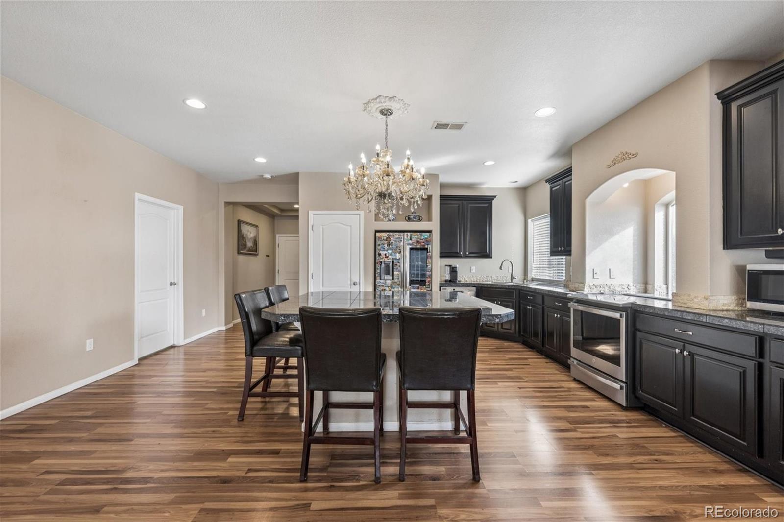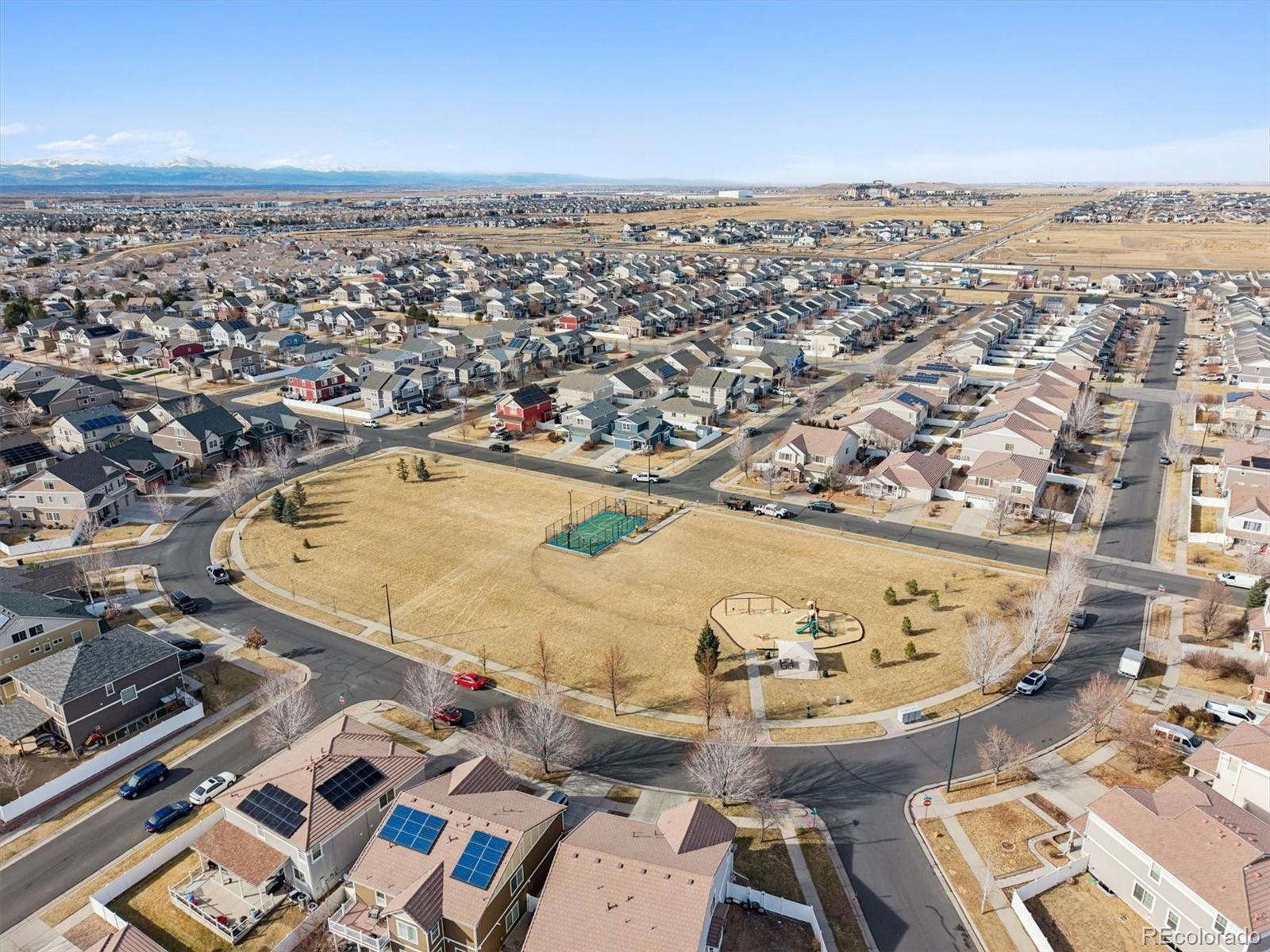 Exceptional 6-bedroom, 4-bath home in Green Valley Ranch offering over 4,000 finished square feet — every bit of it livable. Situated on a corner lot with a 3-car garage and fully paid-off solar. Not located in a metro taxing district, which is rare for the area. Lender incentive available with a 1% credit of $6,990. Open-concept main level filled with natural light and a true chef’s kitchen featuring stainless steel appliances, a huge center island, and a large pantry. The main-floor primary suite offers dual sinks, a walk-in closet, and a spa-like shower. Two bedrooms on the main level, two upstairs, and two in the fully finished basement create a highly functional layout. The basement also includes a custom bathroom with its own oversized spa-style shower. Easy access to DIA, light rail, E-470, and Green Valley Ranch Golf Course.