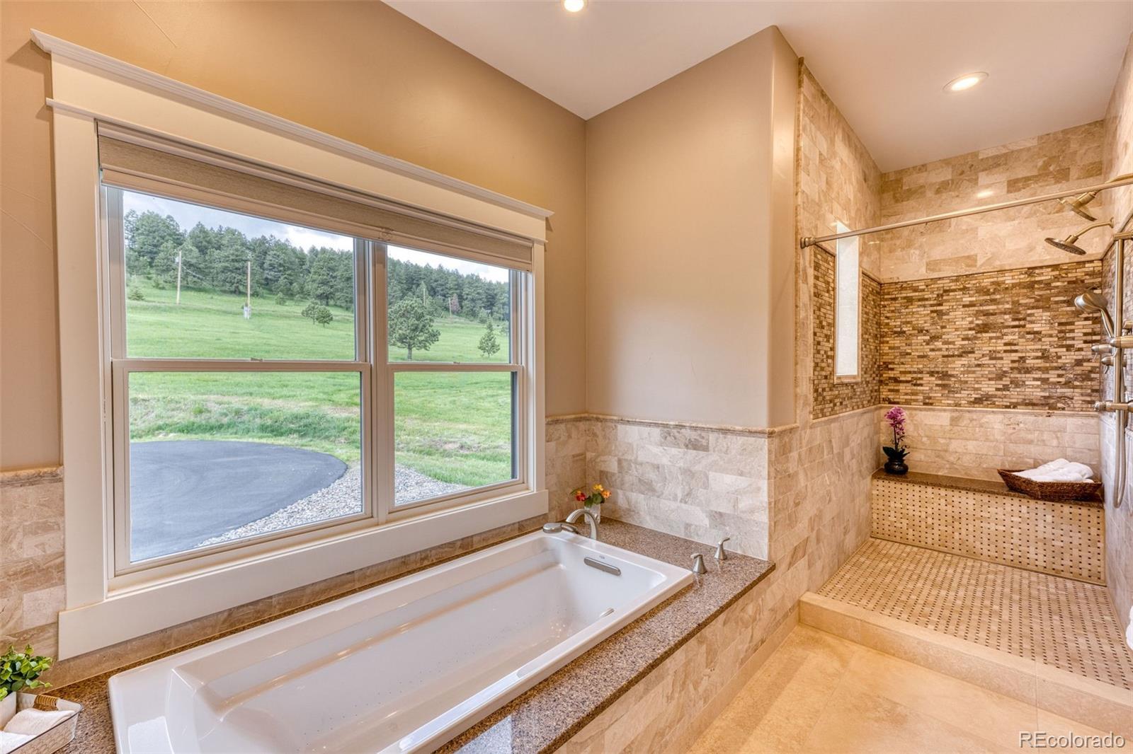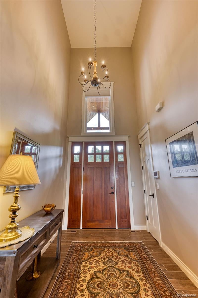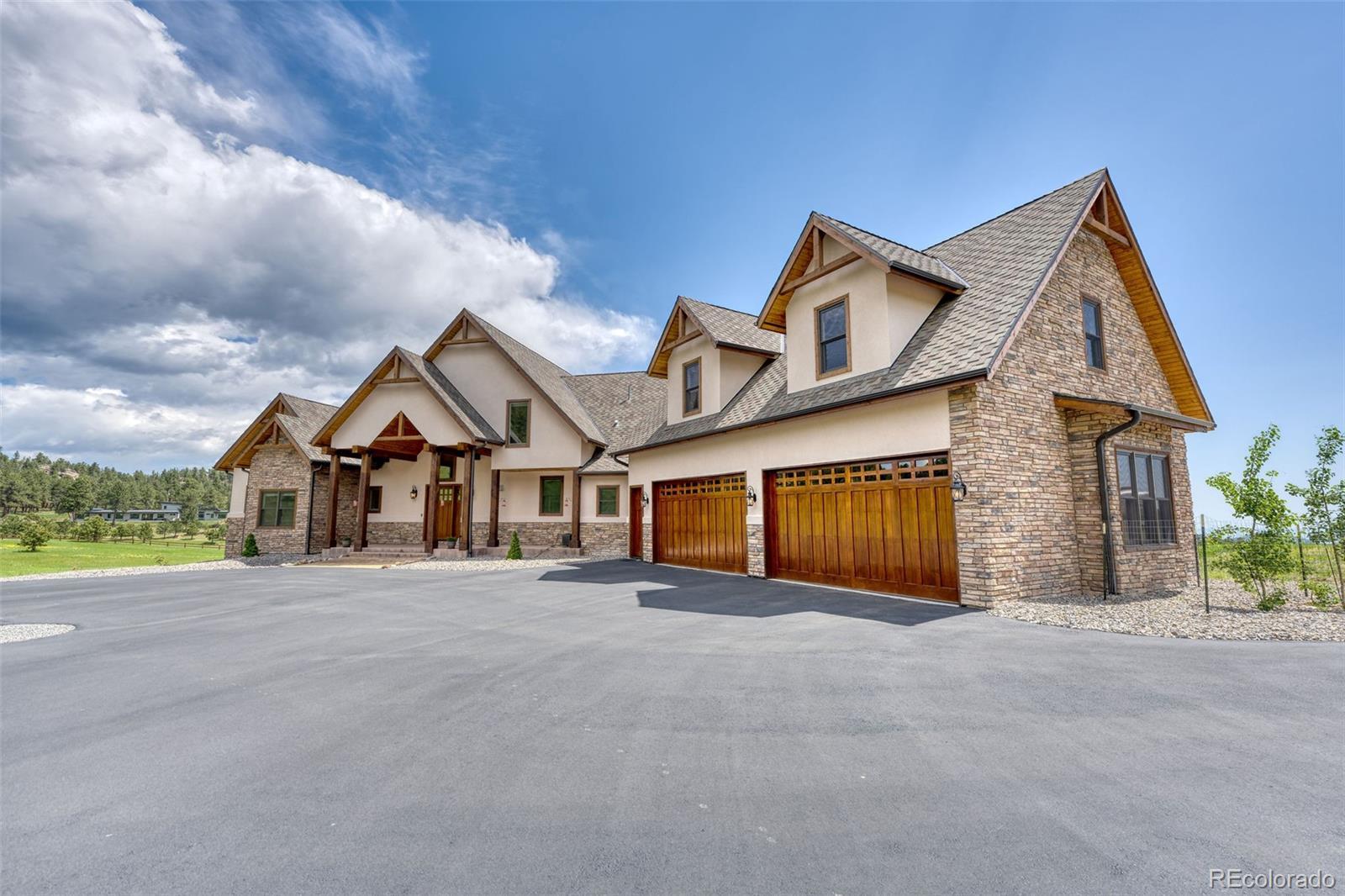 Mountain, meadow and city views. Additional Dwelling Unit or Mother in law suite above garage with private entrance. Situated at 8,200 ft, this home overlooks the twinkly city lights of Denver and surrounding cities in a beautiful mountain meadow which is home to abundant flora and fauna year-round. Built in 2018 by SonPointe Homes Builders, no detail was spared in it's construction. Every room features 10 ft ceilings and doors with molding details which gives the home a true, custom, high quality feel. Kitchen offers a large walk-in custom butlers pantry, custom cabinetry, granite counters and large kitchen island, great for entertaining guests or accommodating large gatherings. Vaulted ceilings in the spacious living area with stunning views of mountains, city and quaint neighboring pond. Large deck with plenty of room for your own personal touches. Windows are doors were all done using Sierra Pacific windows and doors with Low E glass. Step into your own private oasis with the primary suites vaulted ceilings, his and hers walk-in closets with custom organization, large soaking tub, dual sinks, and heated multi-head shower with detailed custom tile. Floors in all six bathrooms have programable heat thermostats. Tankless water heater, 120,000 btu propane furnace with 3.5T air conditioner. Enjoy the 35 foot deep 4 car heated garage for your cars and toys with an additional 50' RV pedestal with full 50A service, water and waste dump, 50 x 100 pad. Above the garage is an 950 sqft ADU with kitchenette, dining area, custom shelving, and cozy pellet stove. This flex space would be excellent for a mother in-law suite, guest house, office with private entrance. Every bedroom has it's own bathroom with plenty of closet space. Loft above living area includes cat walk with seating area and/or library. Upstairs bedroom would be great for another private office or crafting room with a huge walk-in closet and full bathroom. Huge unfinished walk-out basement.