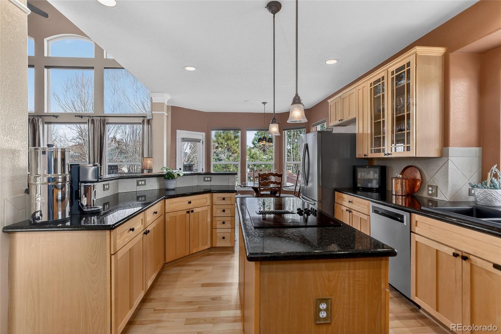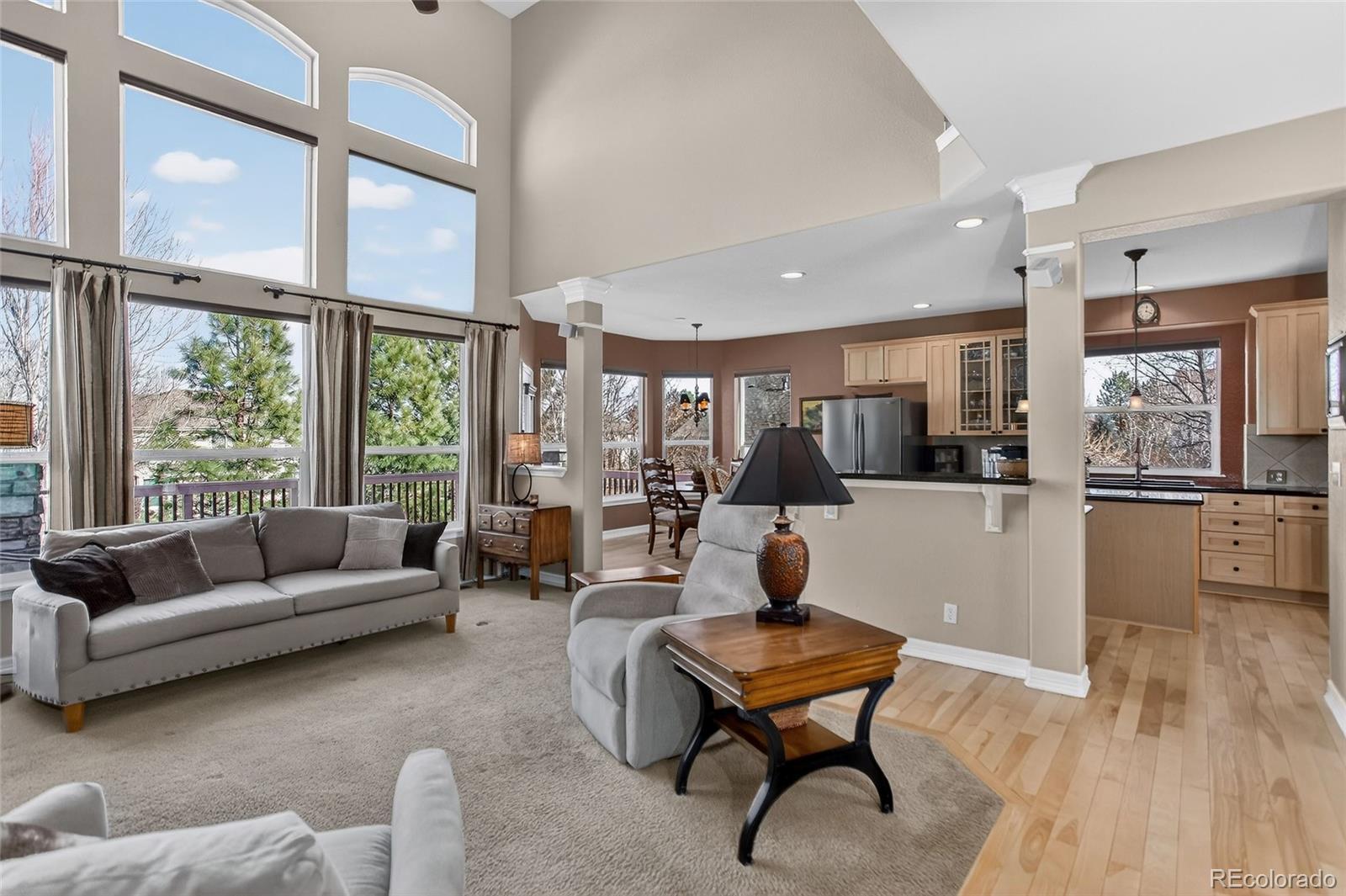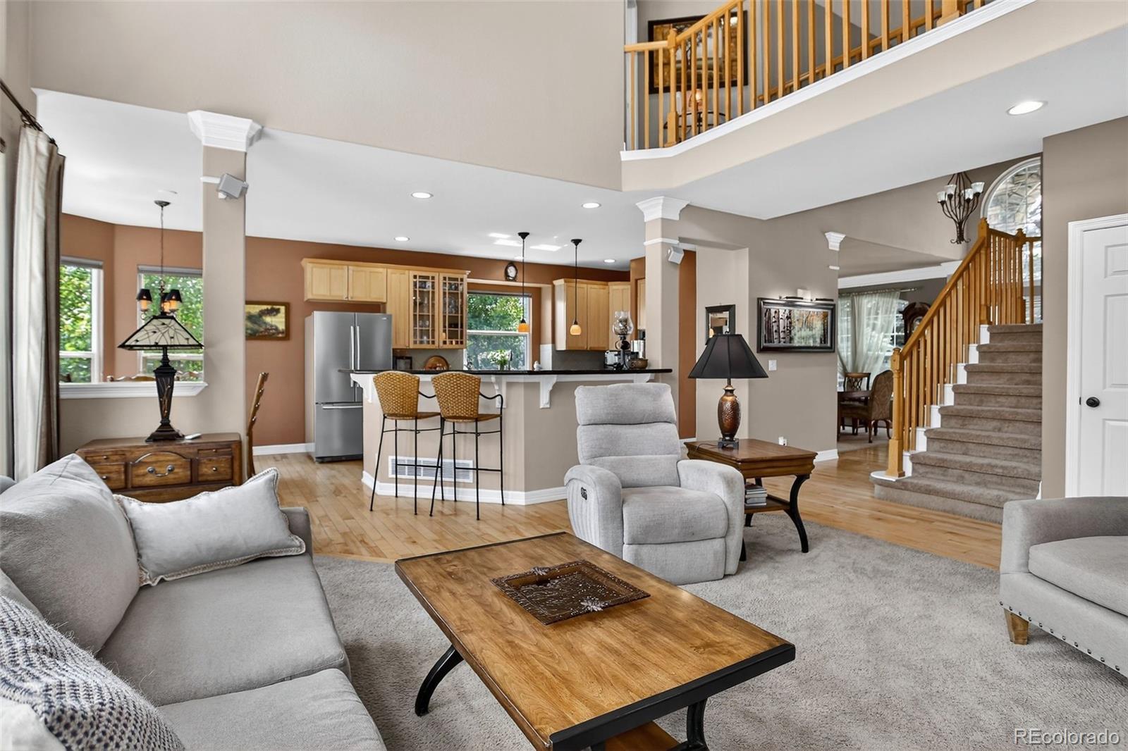 Tucked into a quiet cul-de-sac in Broomfield’s coveted Aspen Creek neighborhood, this home blends elegant design with scenic Colorado living in Broomfield, recently named the #1 best city to live in out west! The residence is defined by rustic elegance, highlighted by a soaring two-story family room with a dramatic stone fireplace with a log mantle and walls of windows that bathe the interior in natural light. The gourmet kitchen serves as the heart of the home, boasting slab granite countertops, modern stainless-steel appliances, and gleaming hardwood floors that flow throughout the main level. For those seeking flexibility, a dedicated study offers a quiet retreat for remote work, while the upstairs loft provides a versatile area for play or relaxation. The full basement provides lots of room for storage or expanded living area. Situated on a rare, oversized lot, the property offers a level of privacy and outdoor space that is increasingly hard to find. Step outside to the expansive deck, a true showstopper where privacy abounds in the summer months thanks to lush, mature landscaping and gorgeous maple trees. The location perfectly complements the home's interior, providing direct access to scenic trails and a short walk to the neighborhood pool and the highly regarded Aspen Creek K-8 School. With a 3-car garage offering space for all your outdoor toys and affordable HOA fees covering trash, recycling, and common amenities, this home delivers an unbeatable lifestyle in the region's premier community.