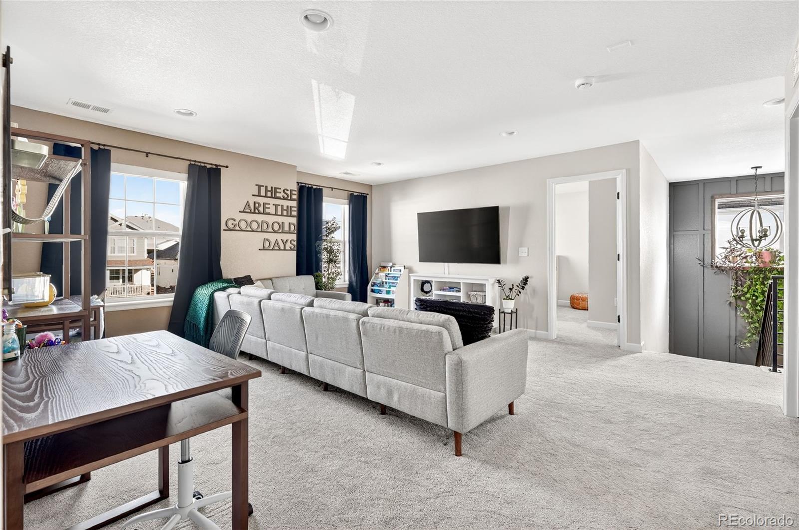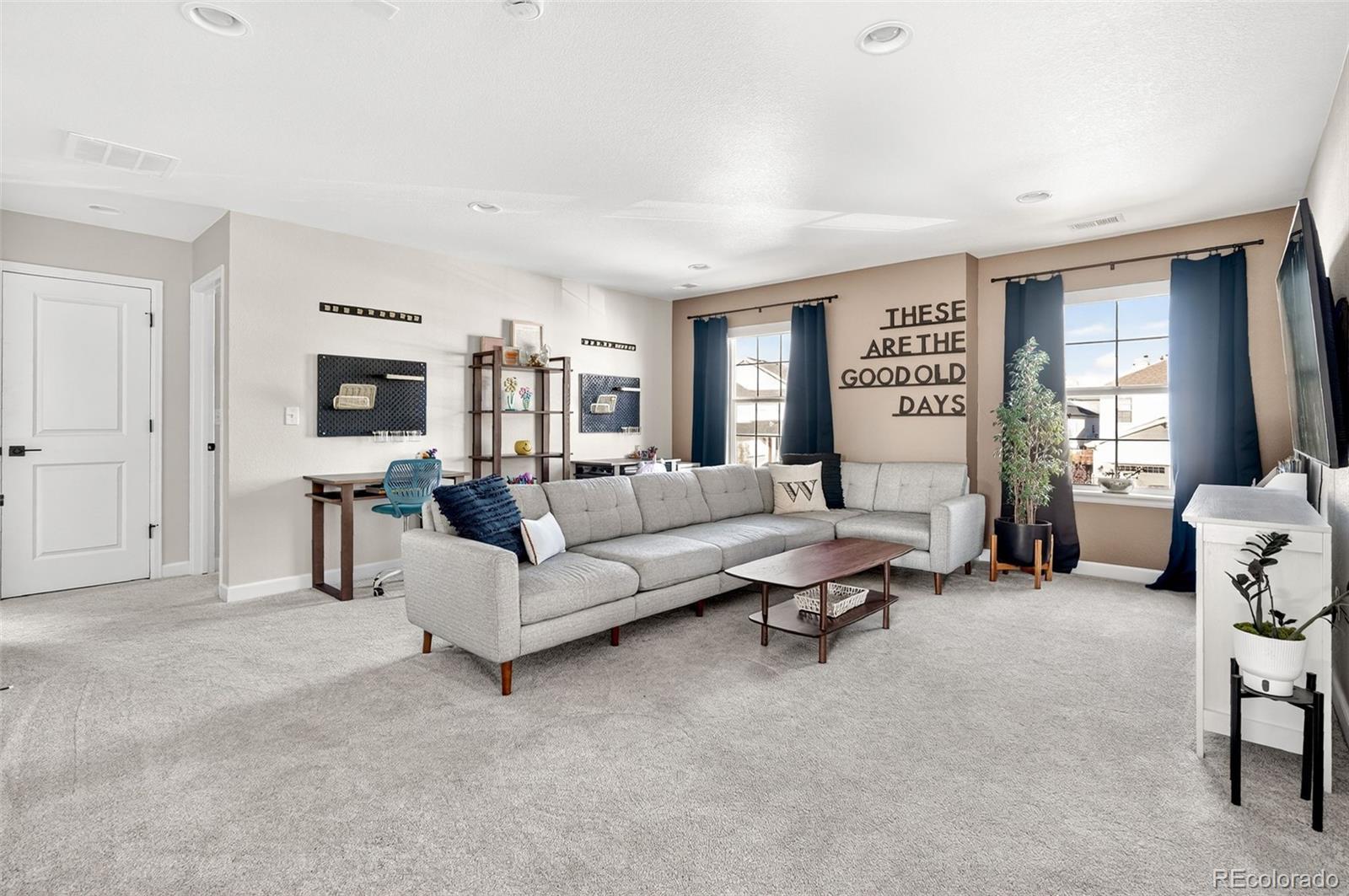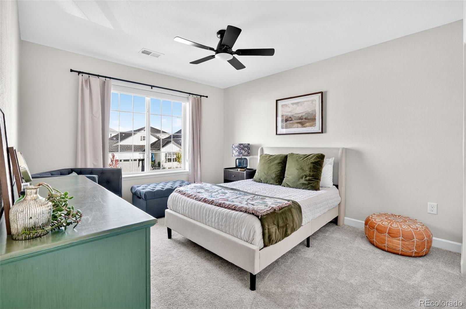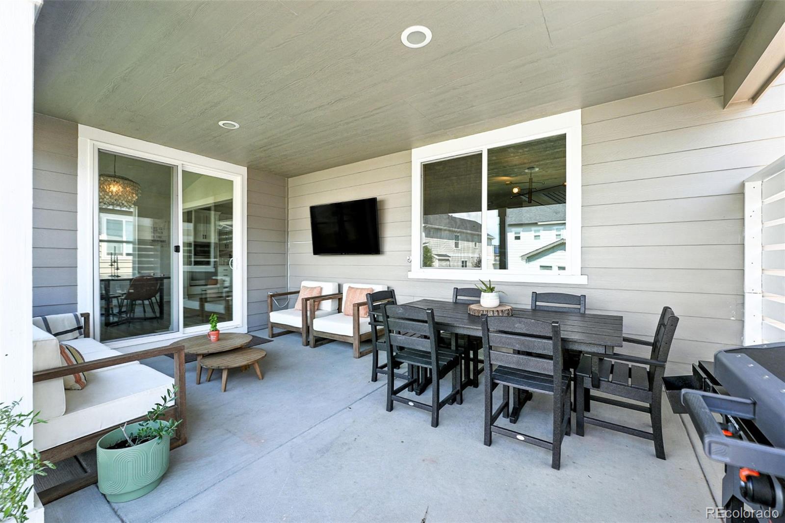 Set in the heart of Colliers Hill, this refined and move-in ready Hemingway model offers over 3,700 finished square feet of thoughtfully designed living space, blending elevated style with everyday functionality. The main floor features a private study framed by french doors and an open-concept layout ideal for entertaining, complete with a modern fireplace, upgraded designer lighting, and a sun-filled dining area that opens to the covered patio and fully landscaped backyard. The kitchen anchors the space with quartz countertops, stainless steel appliances, dedicated pantry storage, and a large center island perfect for hosting guests, casual family meals, and intimate dinners. Upstairs, you’ll find a spacious loft, three well-sized secondary bedrooms, and a serene primary suite with a large, custom walk-in closet and private en-suite bath. The finished basement adds flexible living space with a dedicated media and recreation area, guest bedroom, and a full bath, offering comfort and privacy for visitors or multigenerational living. Located just steps from Colliers Hill’s exceptional amenities- including two resort style pools, a state-of-the-art fitness center, clubhouse, miles of walking and biking trails, community parks, and top-rated St. Vrain Valley schools- this home offers the rare opportunity to enjoy a nearly new build with the added benefit of high-end finishes and a fully completed outdoor living space.
