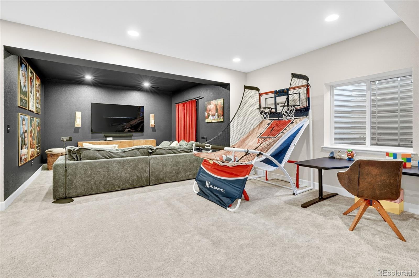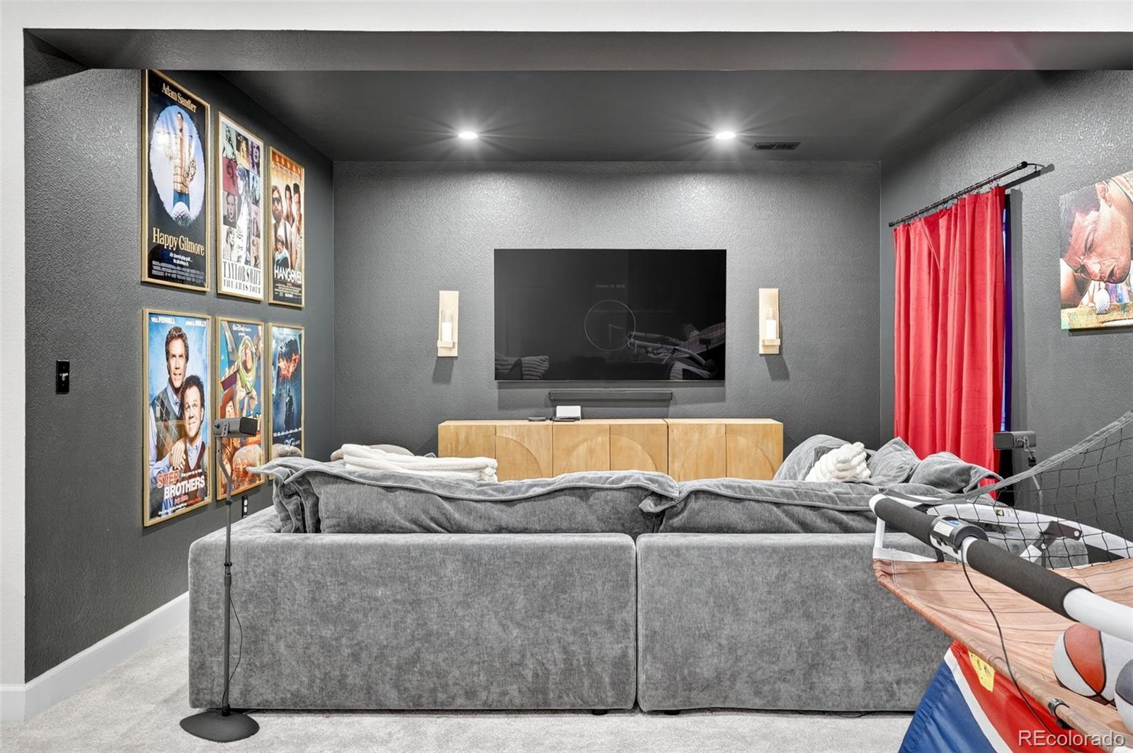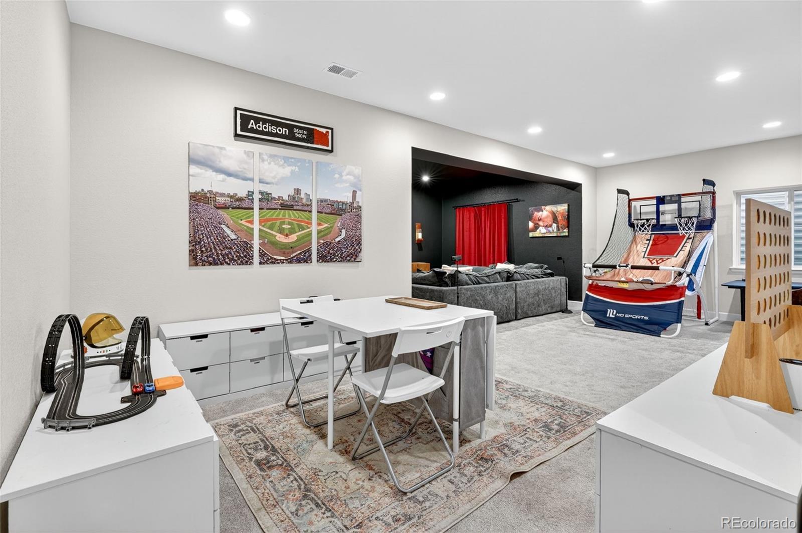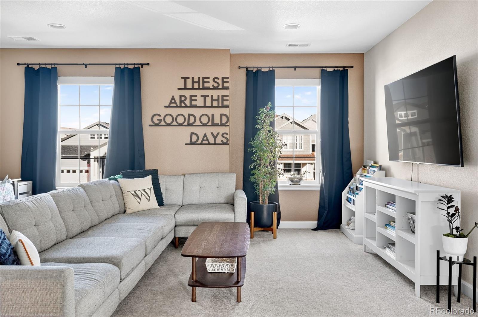 Set in the heart of Colliers Hill, this refined and move-in ready Hemingway model offers over 3,700 finished square feet of thoughtfully designed living space, blending elevated style with everyday functionality. The main floor features a private study framed by french doors and an open-concept layout ideal for entertaining, complete with a modern fireplace, upgraded designer lighting, and a sun-filled dining area that opens to the covered patio and fully landscaped backyard. The kitchen anchors the space with quartz countertops, stainless steel appliances, dedicated pantry storage, and a large center island perfect for hosting guests, casual family meals, and intimate dinners. Upstairs, you’ll find a spacious loft, three well-sized secondary bedrooms, and a serene primary suite with a large, custom walk-in closet and private en-suite bath. The finished basement adds flexible living space with a dedicated media and recreation area, guest bedroom, and a full bath, offering comfort and privacy for visitors or multigenerational living. Located just steps from Colliers Hill’s exceptional amenities- including two resort style pools, a state-of-the-art fitness center, clubhouse, miles of walking and biking trails, community parks, and top-rated St. Vrain Valley schools- this home offers the rare opportunity to enjoy a nearly new build with the added benefit of high-end finishes and a fully completed outdoor living space.