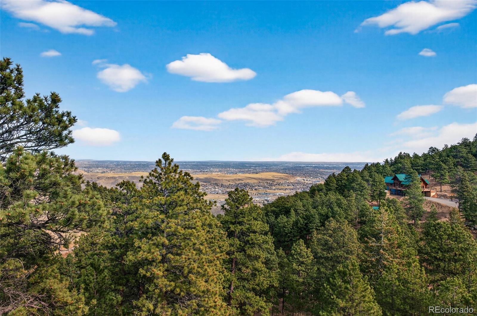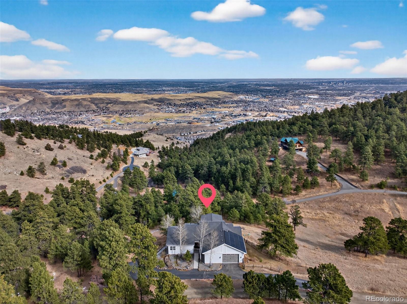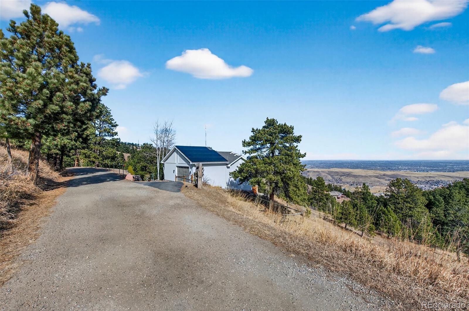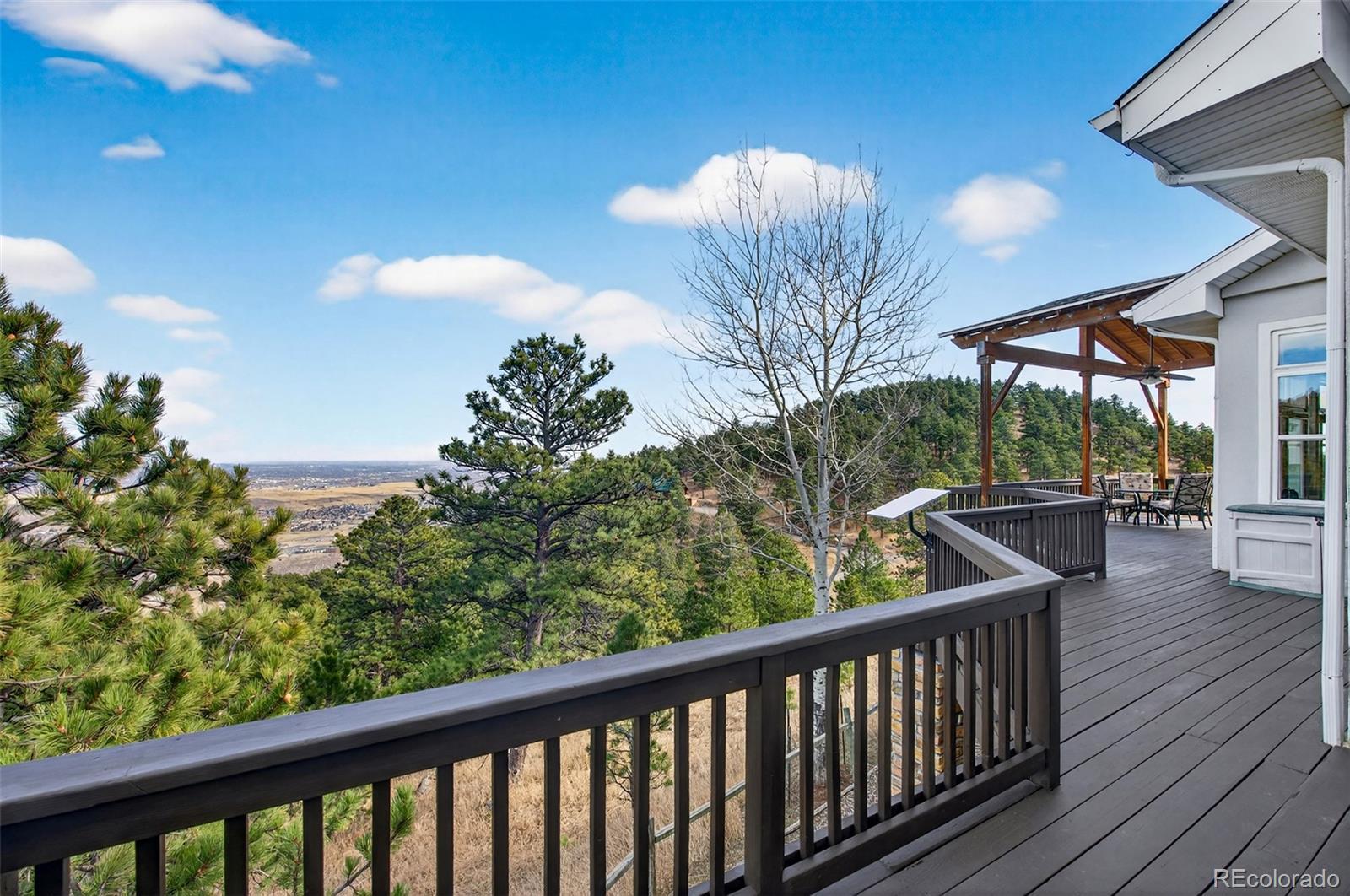 Welcome Home! Step inside and feel instantly at ease in this light-filled, thoughtfully designed residence. This rare ranch-style home is perfectly situated on over 2 private acres on a peaceful street, offering breathtaking, unobstructed views of Denver—from glowing sunrises to sparkling city lights at night. Built in 2000, this custom 4,768 sq ft stucco ranch showcases sleek design and quality craftsmanship with steel construction, soaring open-beam ceilings, and an expansive great room layout. Three sets of French doors seamlessly connect the interior to a large deck, creating an ideal setting for entertaining or simply soaking in the spectacular scenery. Refined finishes include a tiled entry, hardwood floors, granite surfaces, soft neutral hues, and two striking rock fireplaces. The open floor plan seamlessly connects the family room, dining area, and kitchen, creating an ideal space for both everyday living and entertaining. The dream kitchen anchors the home, while the main-floor primary suite offers a true retreat with a cozy two-sided fireplace shared with the well-appointed bath. The light-filled walkout lower level offers a generous recreation room with a convenient entertainer's bar, two well-appointed guest suites with two additional bathrooms (one ensuite), a second laundry area, and ample storage throughout. Just a short walk to Apex Park trails and open space, this exceptional home combines privacy, design, and unforgettable views—truly a one-of-a-kind opportunity. Oversized 2.5 car garage that has ample space for 3 vehicles and extra storage. Solar Generation System and Tesla Powerwall 3 40.5 kWh Electrical Backup Storage System (both fully paid off).