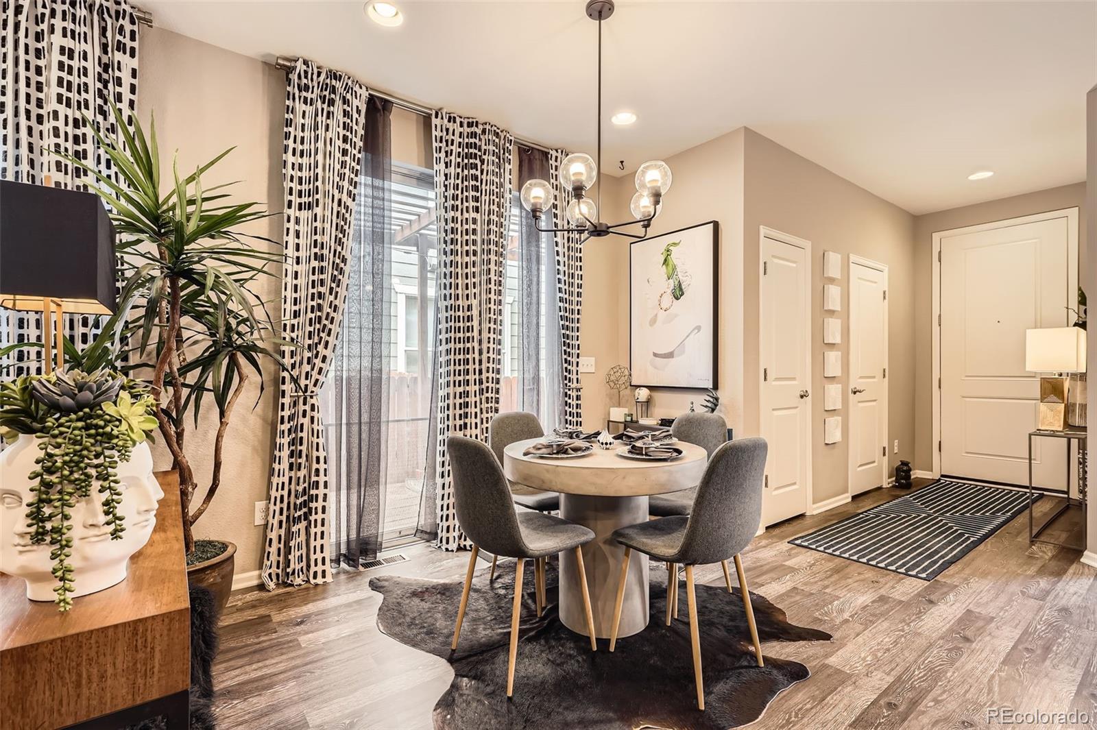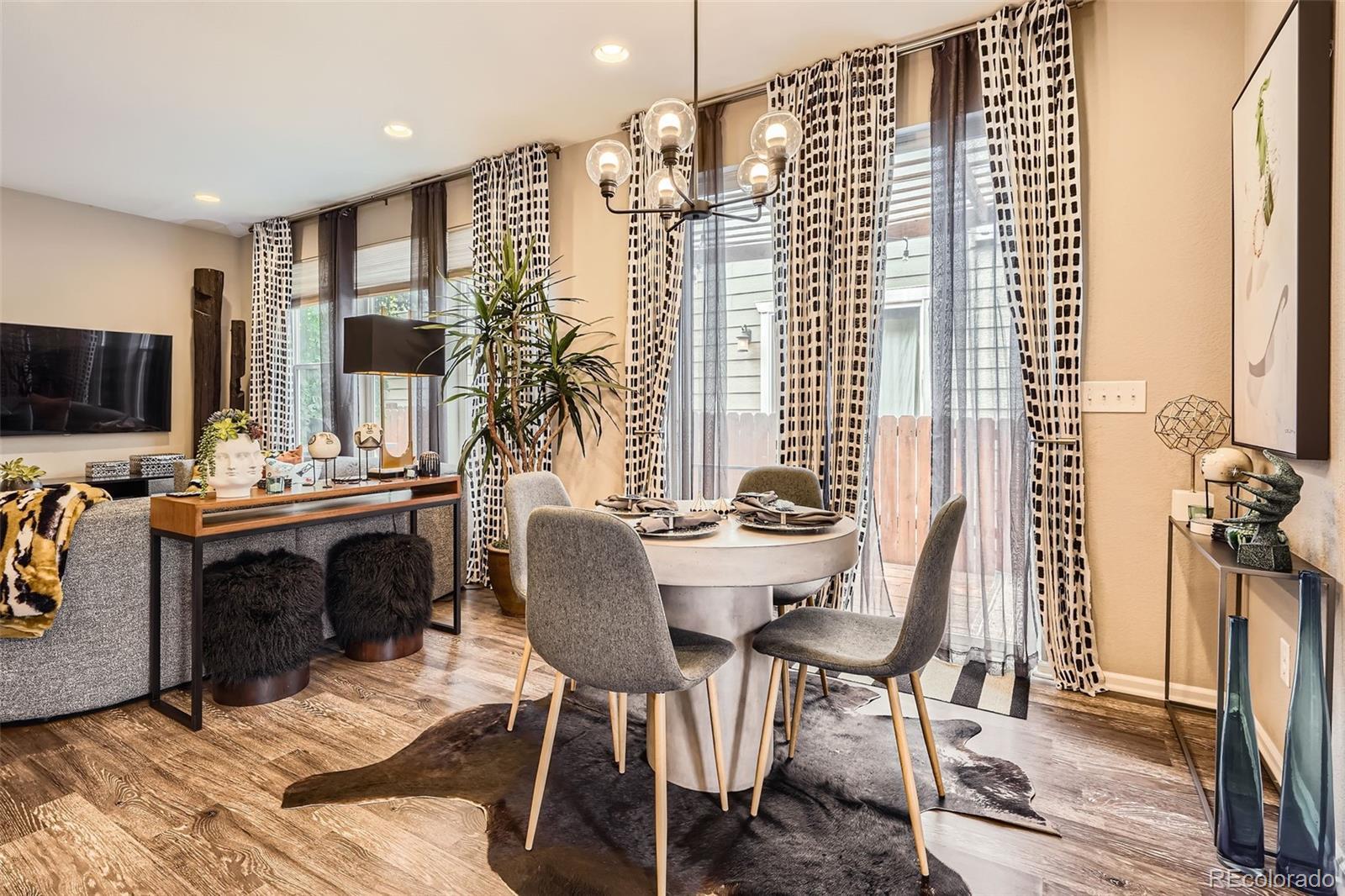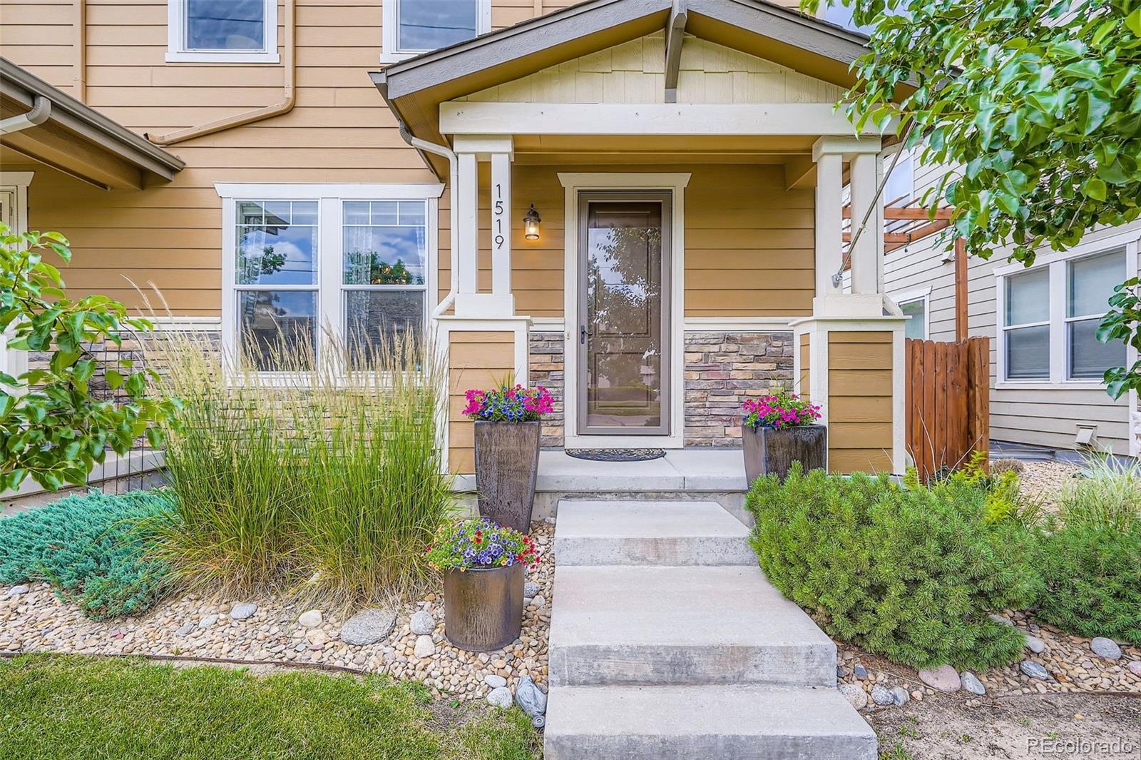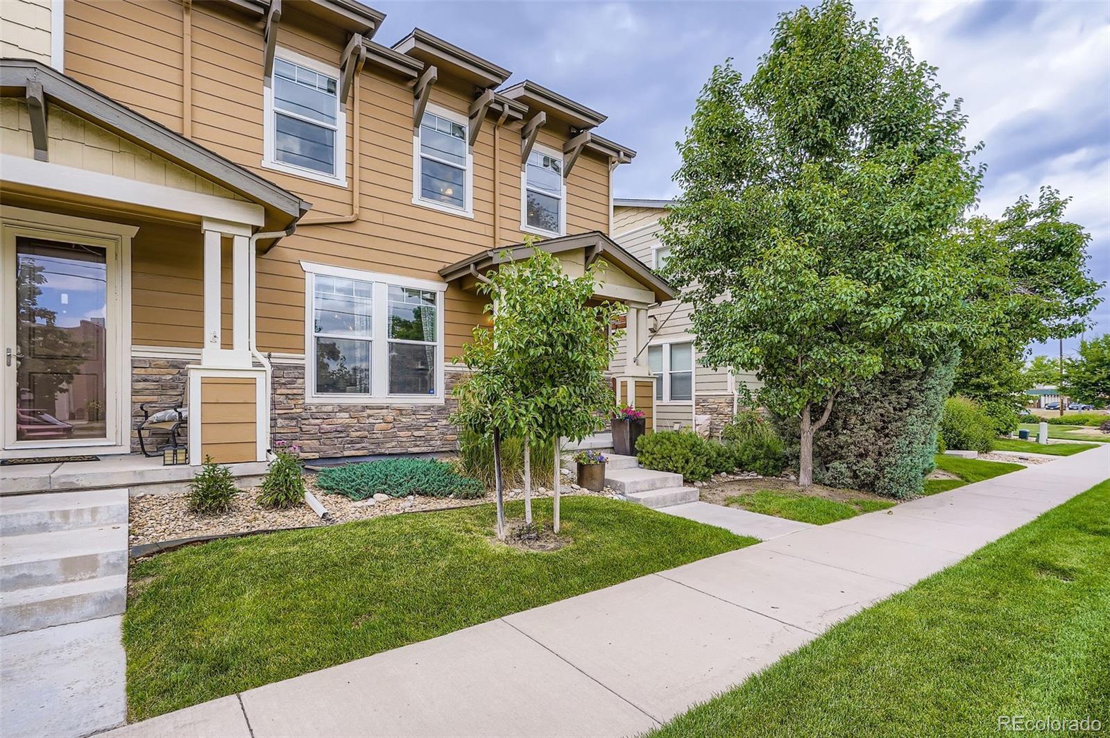 Welcome to this beautifully maintained two-story home, offering the largest floorplan in the community and thoughtfully designed for modern living, comfort, and flexibility. From the moment you enter, you’re welcomed by a generous main-floor living area that flows effortlessly into the open-concept kitchen and dining space—perfect for both entertaining and everyday life. The kitchen is a chef’s dream, featuring sleek granite countertops, rich dark wood cabinetry inducing a pantry, and a full suite of stainless steel appliances including a gas stove/oven/range. Adjacent to the dining area, sliding glass doors lead to a private, fenced-in deck with a charming pergola and mature privacy vine—an ideal setting for relaxing summer evenings or weekend gatherings. Also on the main level is a stylish designer half-bathroom and a bonus room with French doors—perfect for a home office, playroom, or formal dining room. Upstairs, you'll find three spacious bedrooms plus a versatile loft—ideal for a second living space, home office, or creative retreat. The primary suite is filled with natural light and offers a relaxing escape with its dual-sink vanity, tile flooring, and spacious en-suite bathroom. The upper-level laundry room adds everyday convenience, and newer carpet throughout the second floor enhances both comfort and style. The basement is unfinished and ready for your finishes. It offers a sump pump and rough-in plumbing. New water heater. Ideally located near grocery stores, restaurants, and public transportation, this home also offers walkable access to the newly renovated Cheyenne Arapaho Park—featuring a large green space, community garden, fenced dog park, and an impressive playground. Move-in ready and full of thoughtful upgrades, this home checks all the boxes. Don’t miss your chance—schedule your showing today before it’s gone!