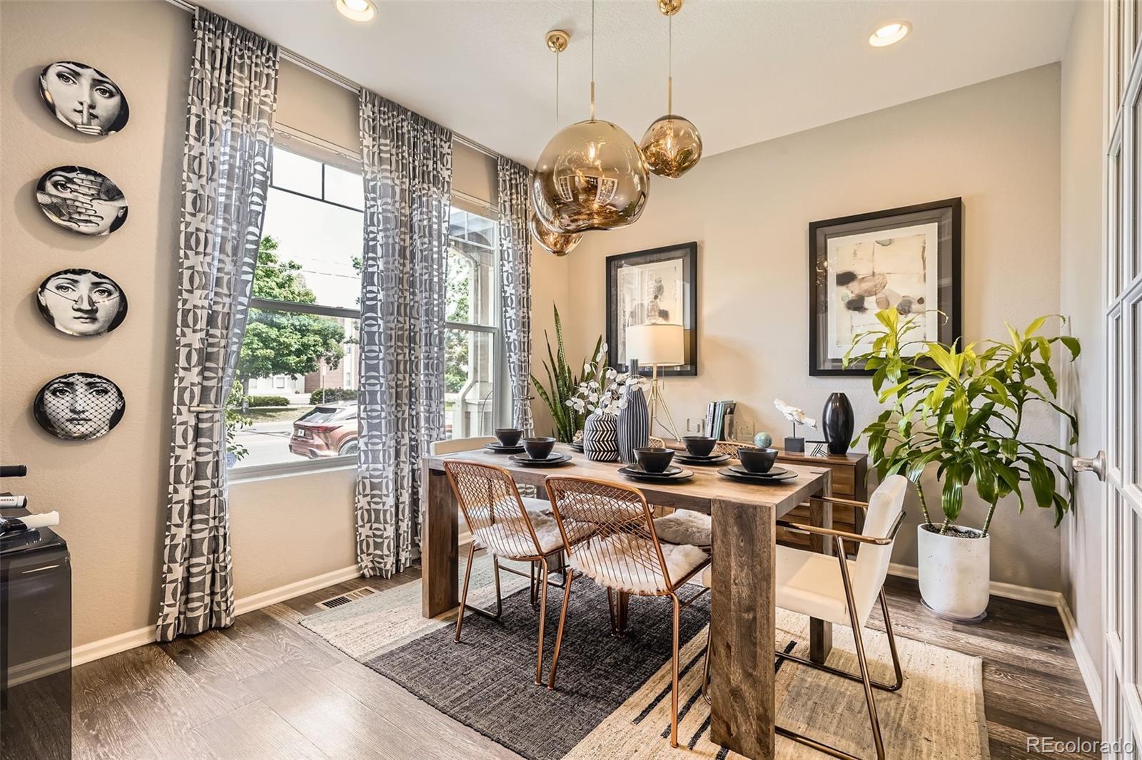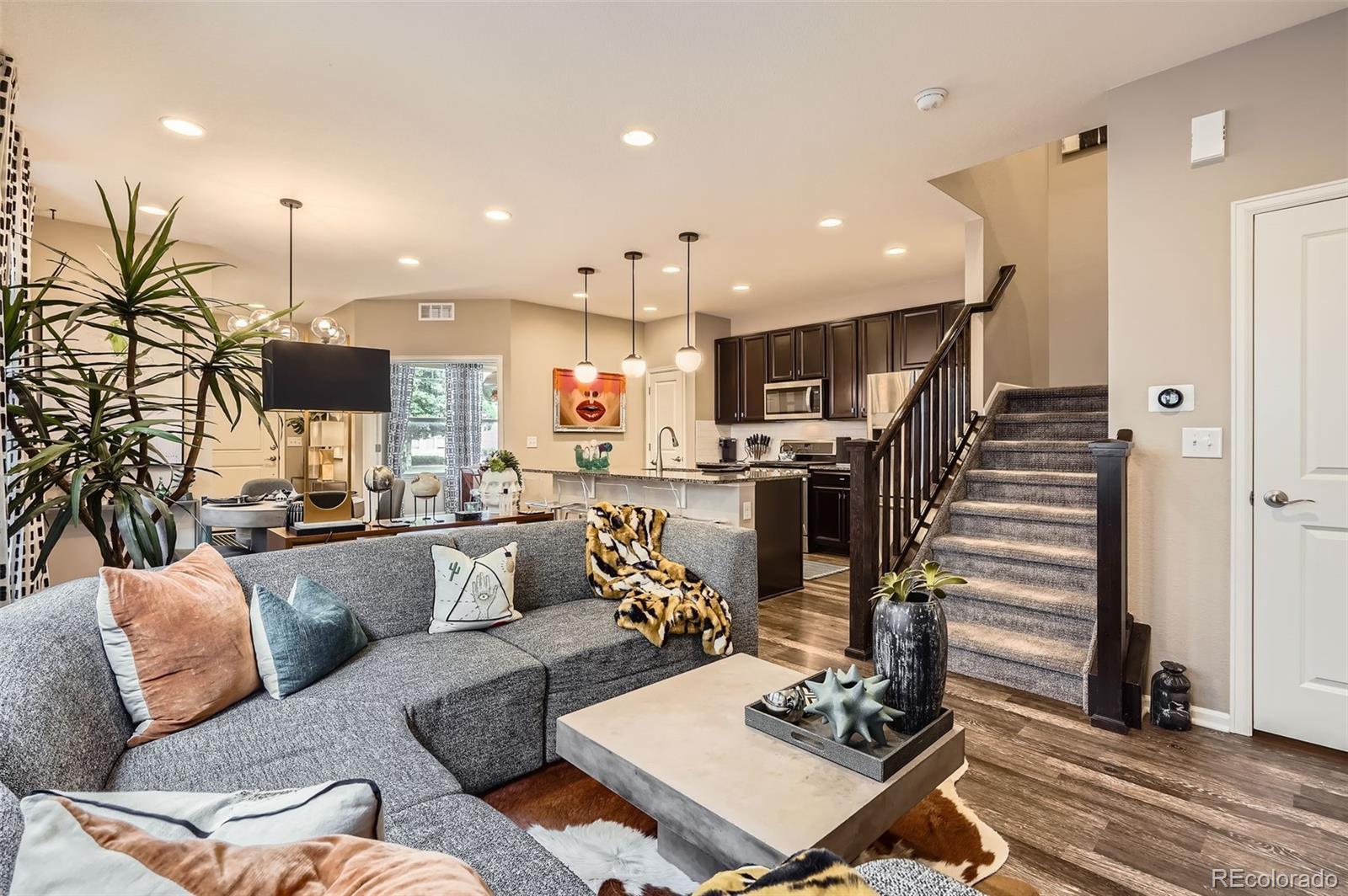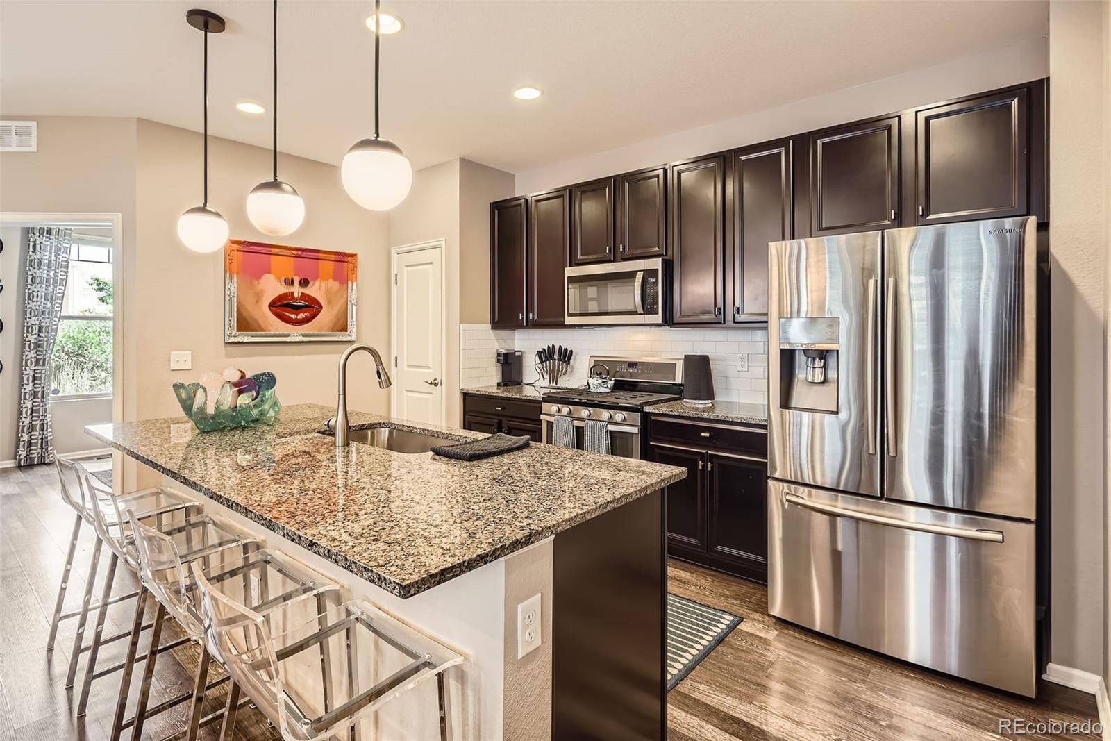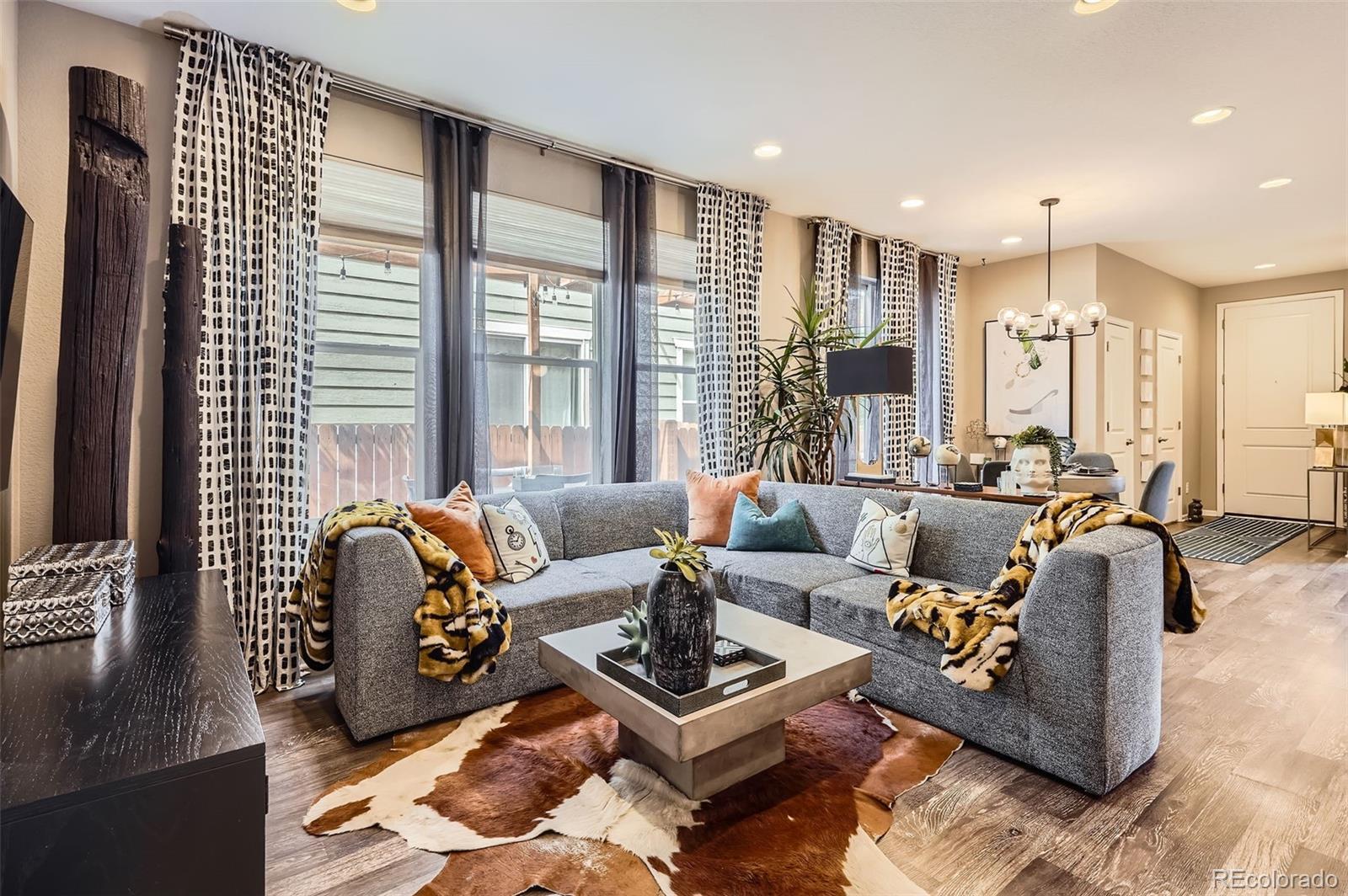 Welcome to this beautifully maintained two-story home, offering the largest floorplan in the community and thoughtfully designed for modern living, comfort, and flexibility. From the moment you enter, you’re welcomed by a generous main-floor living area that flows effortlessly into the open-concept kitchen and dining space—perfect for both entertaining and everyday life. The kitchen is a chef’s dream, featuring sleek granite countertops, rich dark wood cabinetry inducing a pantry, and a full suite of stainless steel appliances including a gas stove/oven/range. Adjacent to the dining area, sliding glass doors lead to a private, fenced-in deck with a charming pergola and mature privacy vine—an ideal setting for relaxing summer evenings or weekend gatherings. Also on the main level is a stylish designer half-bathroom and a bonus room with French doors—perfect for a home office, playroom, or formal dining room. Upstairs, you'll find three spacious bedrooms plus a versatile loft—ideal for a second living space, home office, or creative retreat. The primary suite is filled with natural light and offers a relaxing escape with its dual-sink vanity, tile flooring, and spacious en-suite bathroom. The upper-level laundry room adds everyday convenience, and newer carpet throughout the second floor enhances both comfort and style. The basement is unfinished and ready for your finishes. It offers a sump pump and rough-in plumbing. New water heater. Ideally located near grocery stores, restaurants, and public transportation, this home also offers walkable access to the newly renovated Cheyenne Arapaho Park—featuring a large green space, community garden, fenced dog park, and an impressive playground. Move-in ready and full of thoughtful upgrades, this home checks all the boxes. Don’t miss your chance—schedule your showing today before it’s gone!