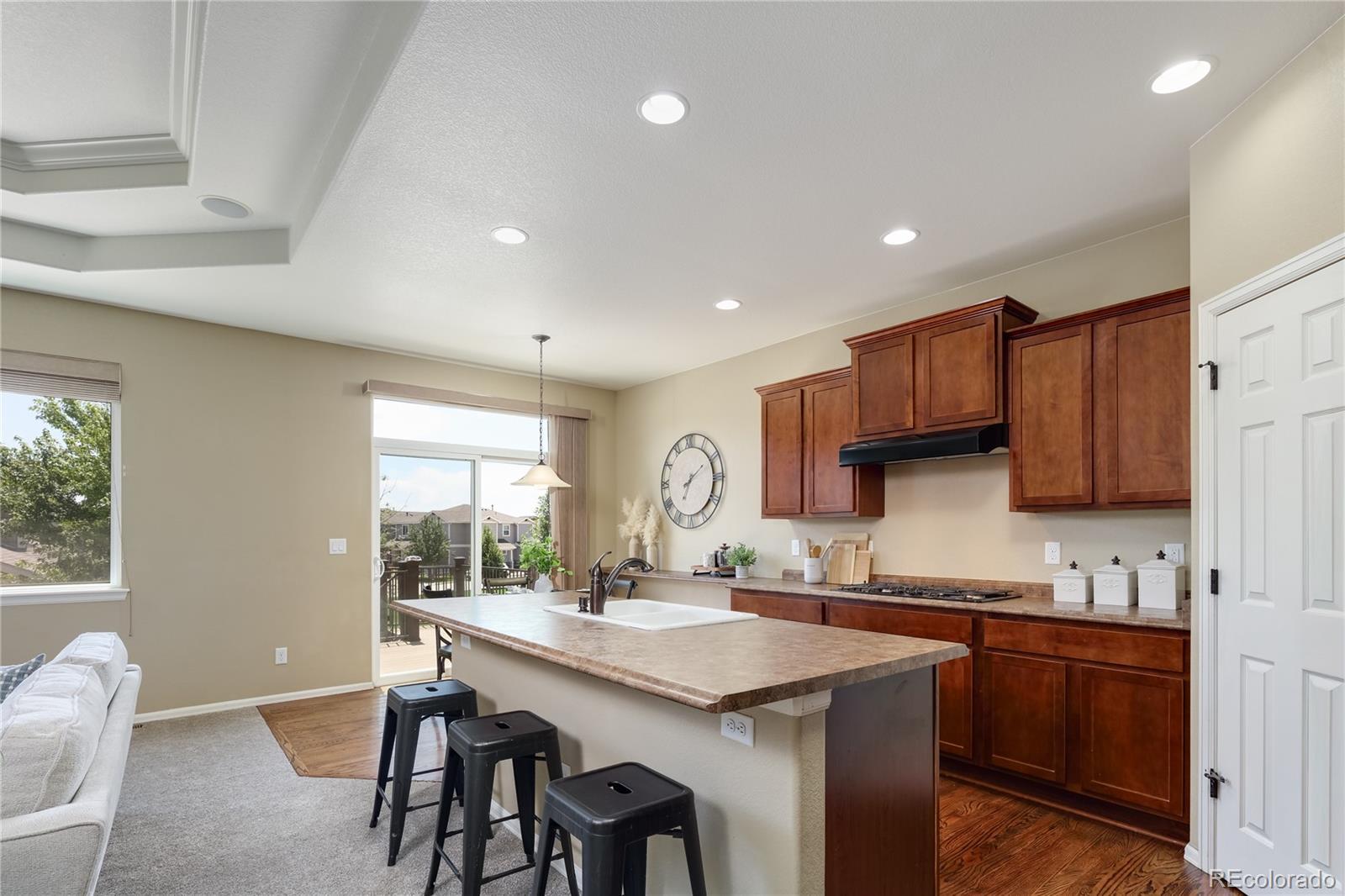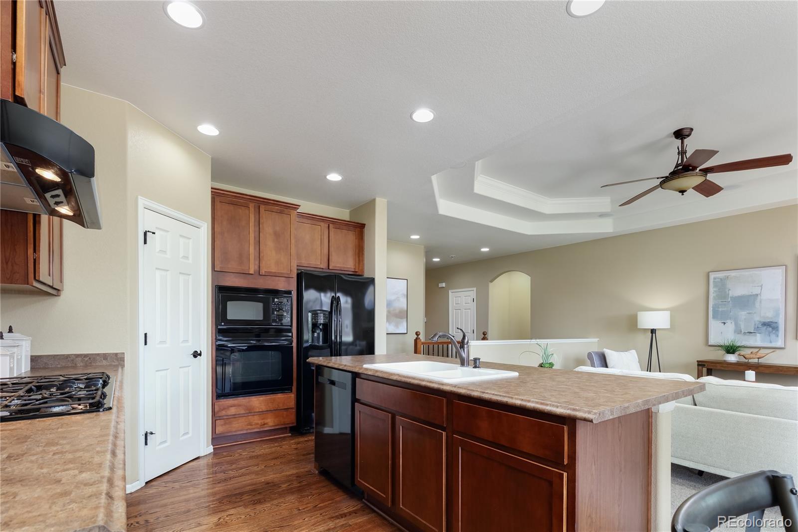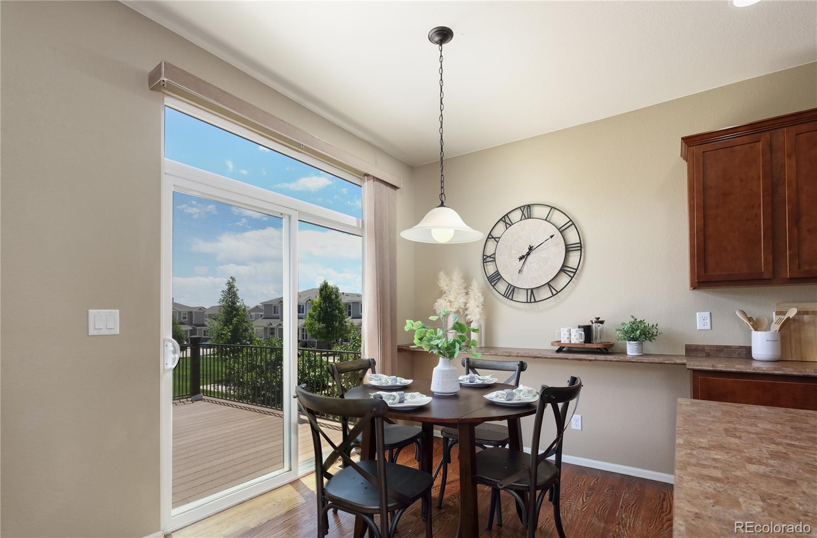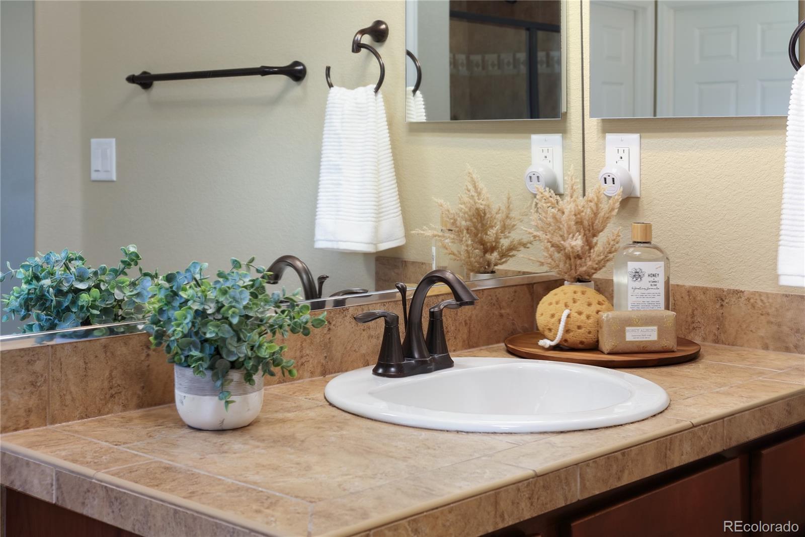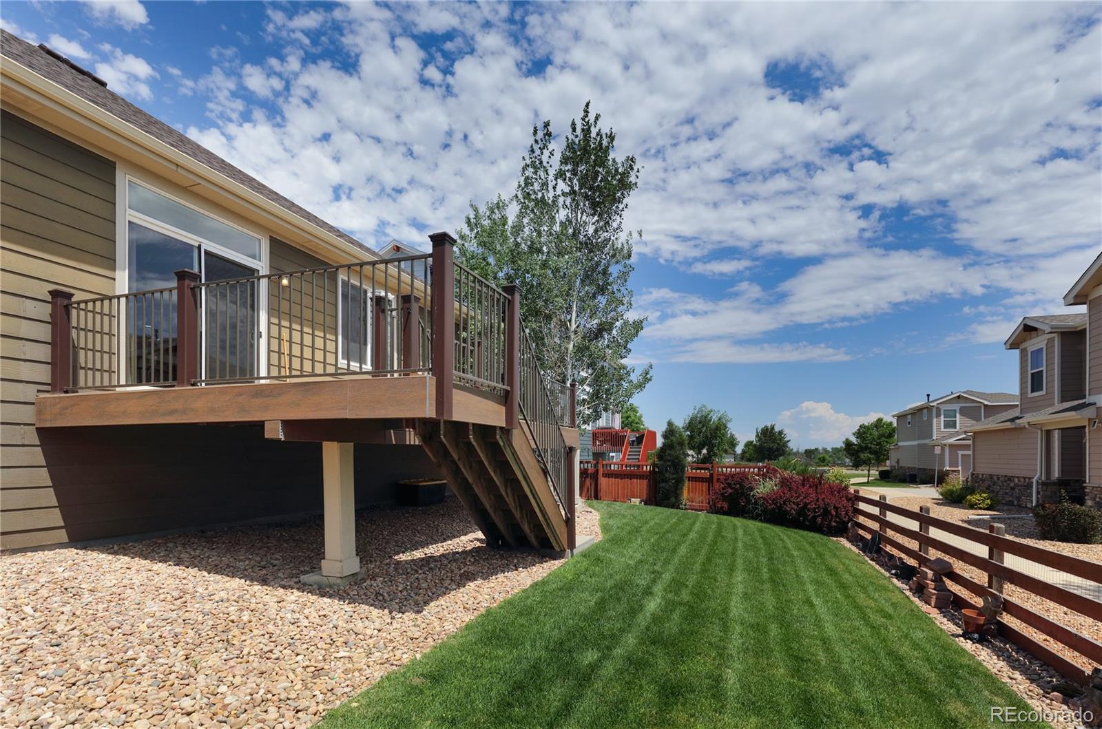 Welcome home to this cheerful 4-bedroom, 3-bath ranch in the friendly Wyndham Hill neighborhood! This home has all the right vibes- soaring ceilings and filled with natural light. Entertaining is easy and everyday living is a joy. Whip up your favorite meals in the large kitchen with hardwood floors which includes an island perfect for coffee chats or after-school snacks. For those special occasions, the formal dining room and butler's pantry fit the bill for hosting holiday get togethers or casual movie night. When it's time to unwind, the main level primary suite offers a calm, comfortable retreat. Your ensuite bathroom has two vanities, a jetted soaking tub and roomy walk-in closet. Main level laundry? Yep, we've got that! Need space to spread out with those projects or create a kid cave? The unfinished basement is a ready-made do-it-all zone. Movie marathons, guest sleepovers, workout goals you might actually stick to- there's a place for it here. Enjoy Colorado's 300 days of sunshine on the huge back deck with a space made for summer BBQs, spectacular mountain views, and evenings under the stars. Recent upgrades, including a new roof (2023), recently serviced furnace & A/C, and an active radon mitigation system with sump pit and pump. Located close to neighborhood trails, a community pool, and quick access to I-25, this home delivers comfort, convenience, and a new place to call home. It's Time to Come Home.