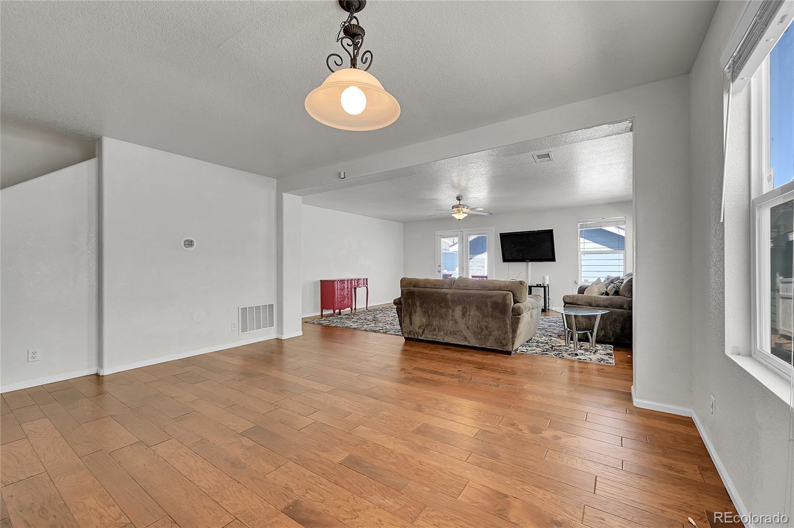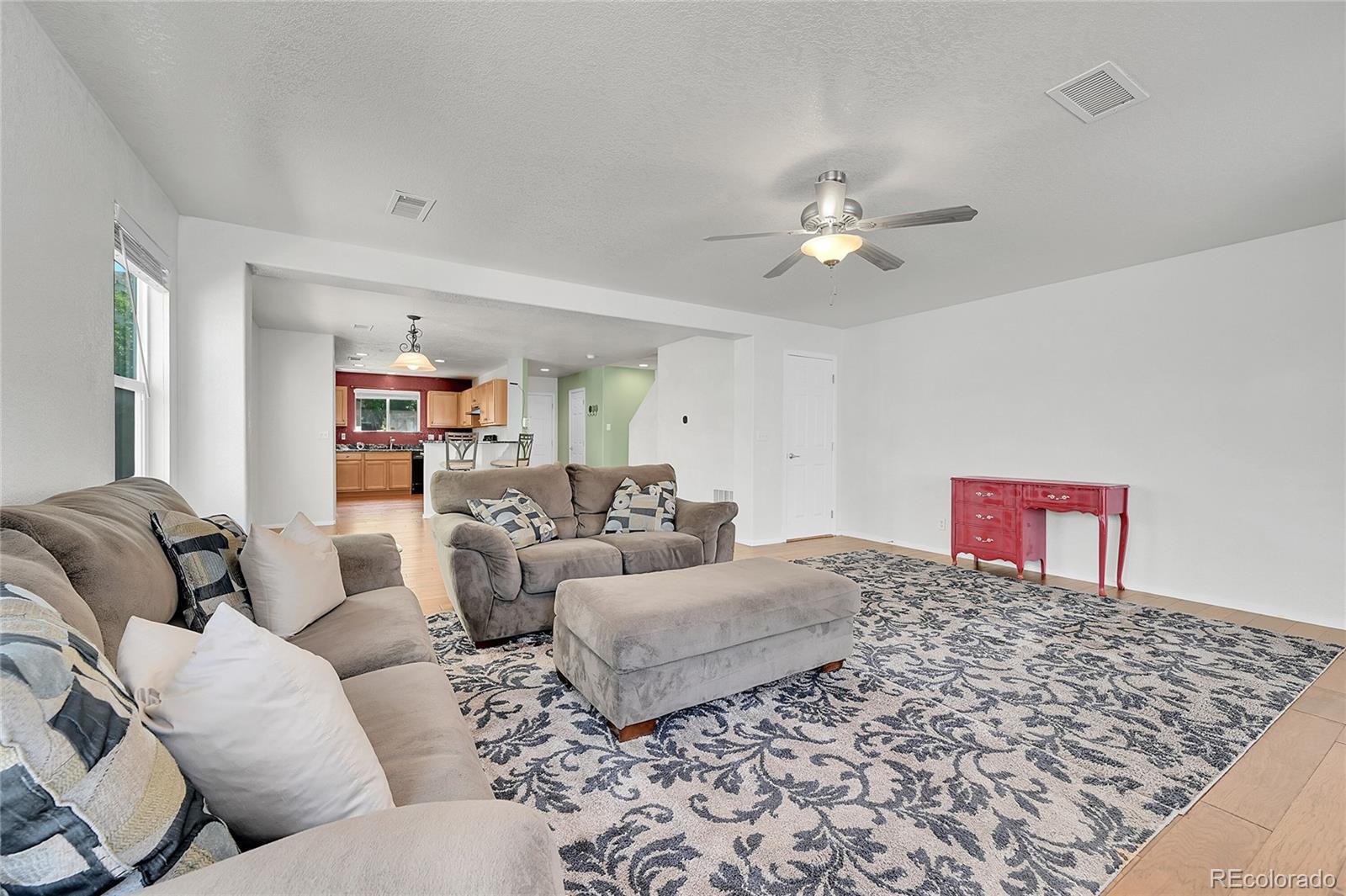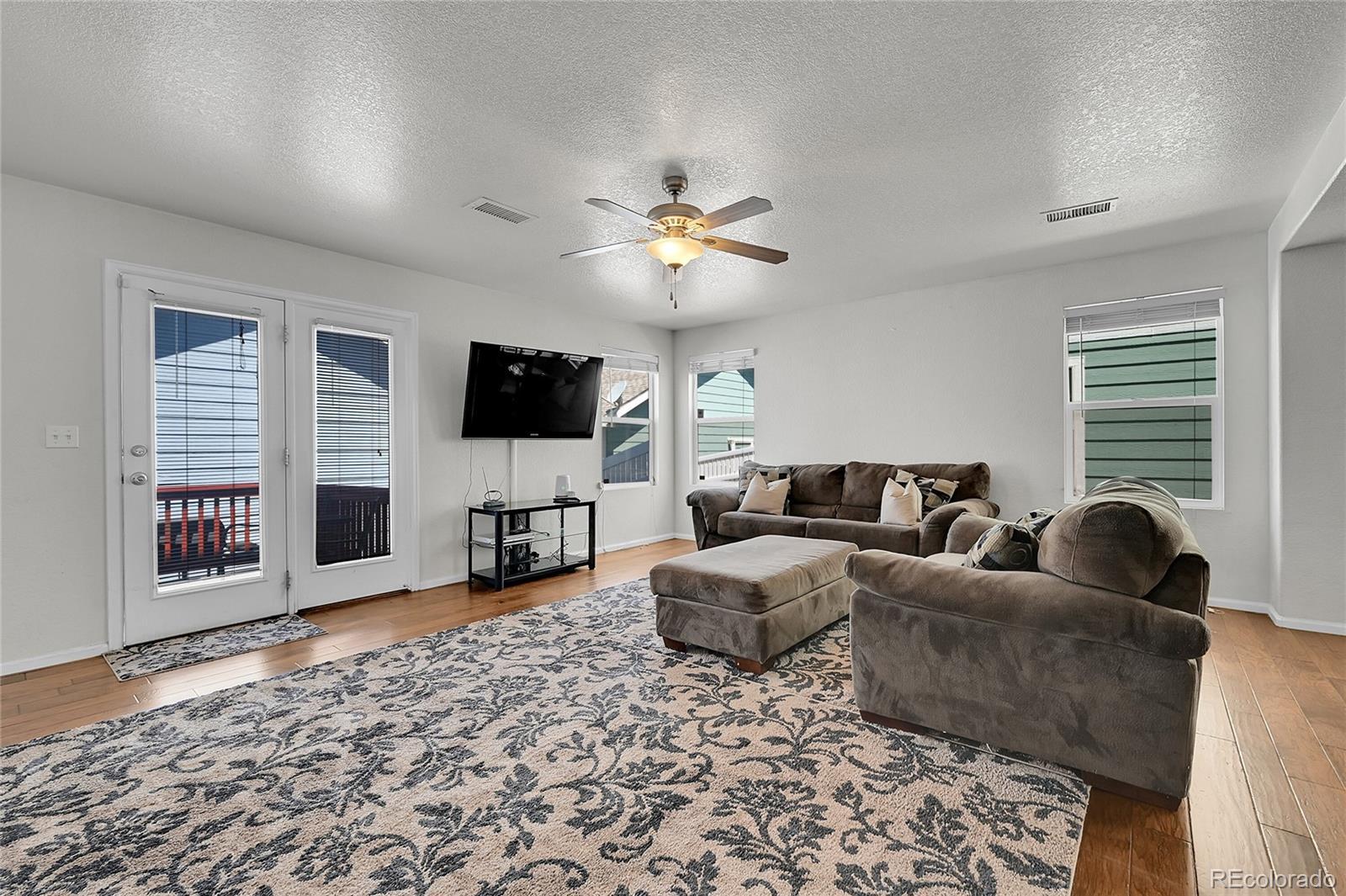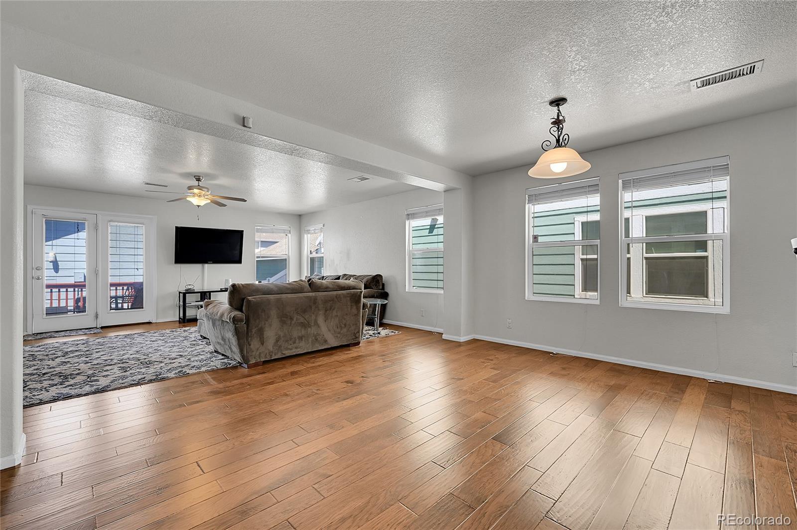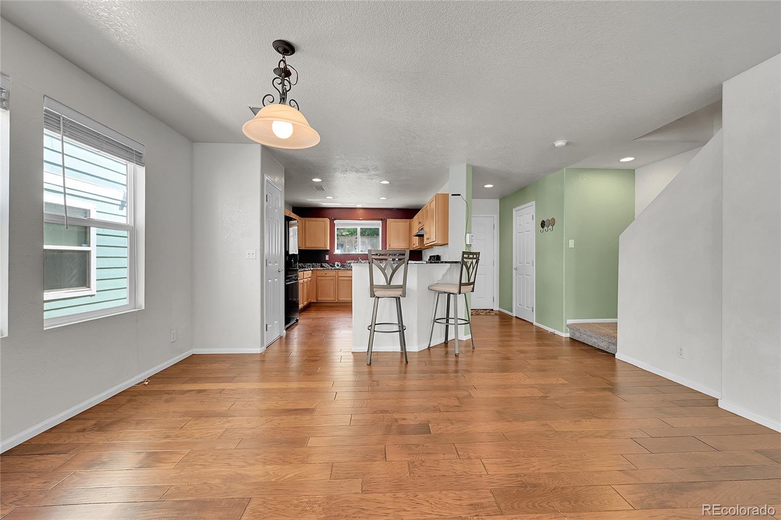 Welcome Home to this spacious and bright end unit. This home features 3 Bedrooms, 3 Baths, 2 Car Garage, and a fenced yard! . Lots of Natural light and an open concept floor plan. Gorgeous pre-finished hardwood flooring throughout the main floor including the entry, kitchen, dining, and living areas. The large main floor living space lends well to entertaining and relaxing with friends and family. The laundry room and 3 bedrooms are located upstairs, including a large primary suite with a walk-in closet and an attached full bathroom. Upstairs has new carpet. The exterior features a trex deck and fenced area/yard which boarders the two car heated detached garage. Air-conditioning, washer/dryer and all appliances are included as well as all window treatments. Great access to public transportation including Light Rail and Park & Ride. Just minutes from DIA with quick access to I-70, E-470, Pena Blvd, and Green Valley Golf Course! *New roof and gutters are currently being installed, please excuse their dust.
