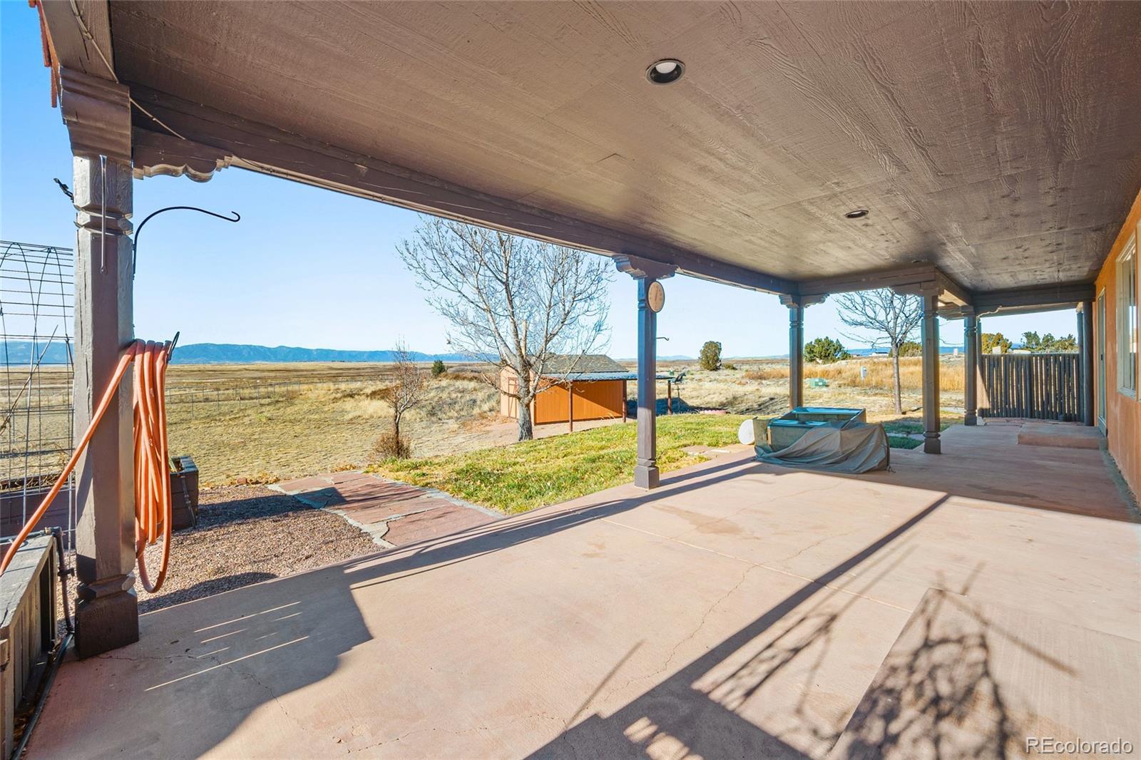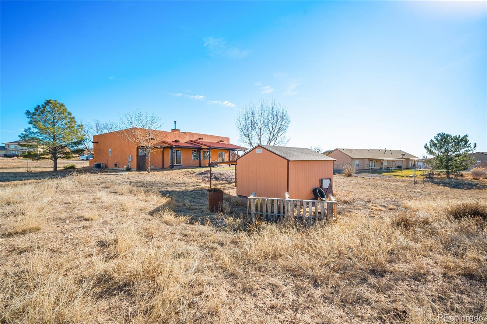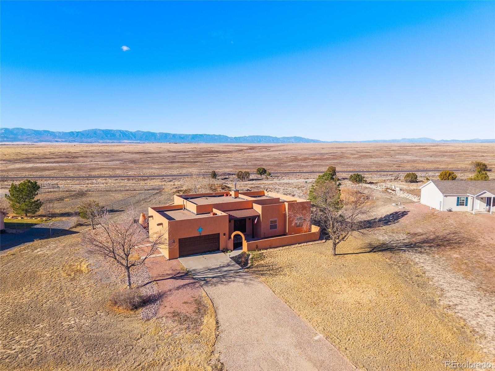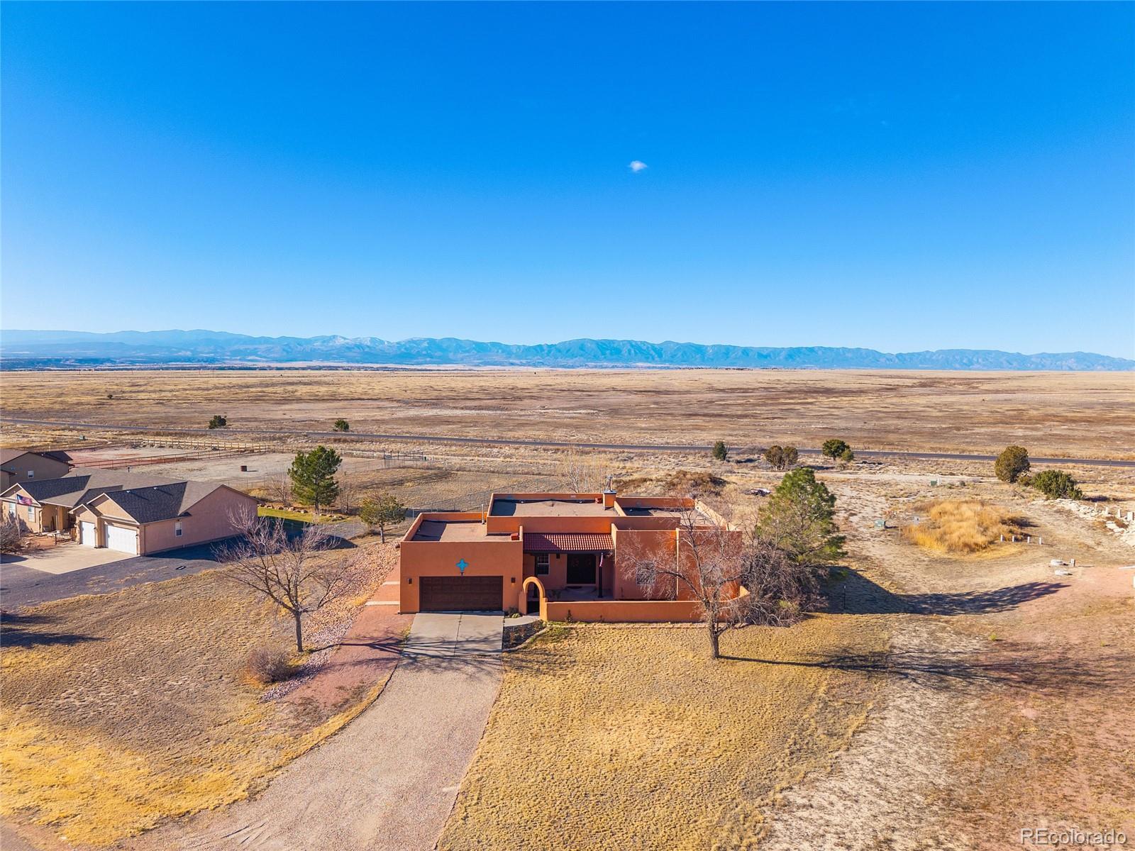 Stunning Santa Fe–style home on 1.03 acres in Pueblo West Acreage, featuring million-dollar mountain views and exceptional privacy backing to Walker Ranch. This Southwestern-inspired property offers a charming courtyard entry with stone pathways, rock accents, garden space, and a covered back porch overlooking open meadows and the mountains beyond. A separate outdoor seating area with a chimenea is perfect for enjoying iconic Colorado sunsets. Inside, nearly 1,900 sq. ft. of comfortable living space blends timeless character with modern updates. The spacious living room is centered around a wood-burning stove, while the kitchen features a raised breakfast bar, abundant cabinetry, pantry, and nearly new appliances. The dining area opens directly to the back porch for seamless indoor-outdoor living. The private primary suite includes a five-piece bath with walk-in shower, large walk-in closet, and direct porch access. Two additional bedrooms share a full bath, ideal for guests, a home office, or studio space. The two-car attached garage offers extensive cabinetry and a work area. Additional storage includes a 12’ x 16’ shed with small carport. Located in a quiet neighborhood with easy Highway 50 access to Pueblo and Cañon City, this property offers space, privacy, and unforgettable views—classic Pueblo West living at its finest.