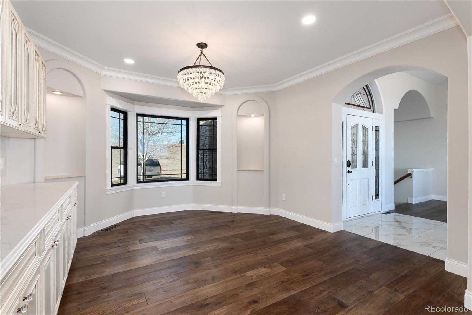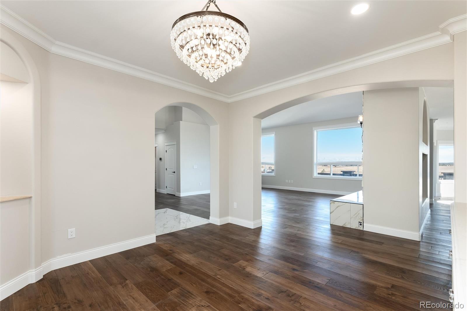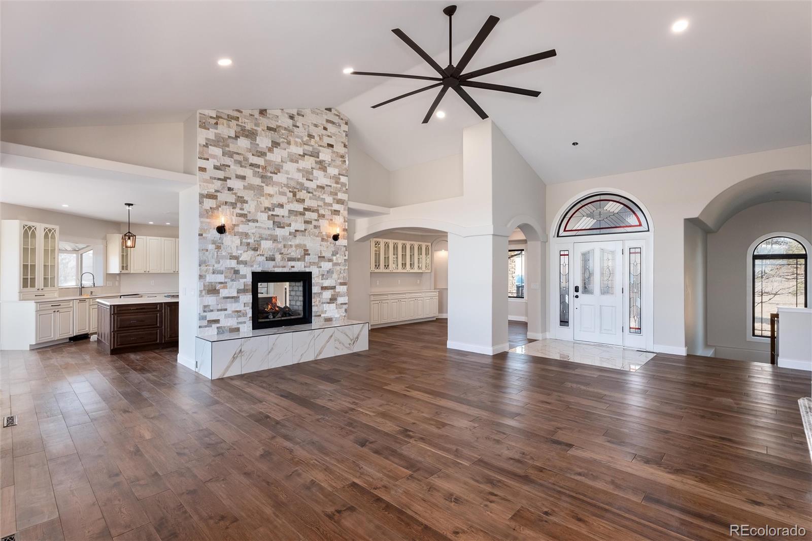 Step inside this beautiful walkout ranch, quiet luxury surrounded by nature. Conveniently located just minutes from Parker and Elizabeth. Meticulously remodeled in 2025, this home shows like new with exceptional craftsmanship and high-end finishes throughout. The open floor plan greets you with vaulted ceilings, rich walnut wood floors, a double-sided fireplace, and a sleek wet bar with multi-zone wine refrigerator, and ice maker—ideal for entertaining. The gourmet kitchen is equipped with top-of-the-line appliances, including a Wolf range, Viking barn-door oven, and a chef’s prep sink at the garden window, custom cabinetry, quartz countertops, a huge walk-in pantry, and a dedicated European coffee bar. The spacious formal dining room, with custom built-ins and a stunning chandelier is perfect for holidays and special occasions. The main-level primary suite is a peaceful retreat—imagine waking to open-space views and unwinding in the spa-like bath including, an air soaking tub, and walk-in shower. A second main-level bedroom or office adds flexible living for today’s lifestyle. Downstairs, guests or family can enjoy their own space in the newly carpeted walkout basement, featuring four bedrooms, two bathrooms, a separate laundry room and a large great room with a wet bar—ideal for movie nights, game days, or extended stays. Enjoy peace and privacy on the expansive back deck, perfect for outdoor dining or watching wildlife. The interior recently underwent a top-to-bottom transformation including new hardwood floors and carpet, new front windows, new doors, insulated garage doors, all-new kitchen and bathrooms, an impact-resistant roof, new gutters, two tankless water heaters, two high-efficiency furnaces, air conditioning on both levels, and a natural gas generator. Don’t miss this rare opportunity to own a truly exceptional home—where luxury, comfort, and location come together.