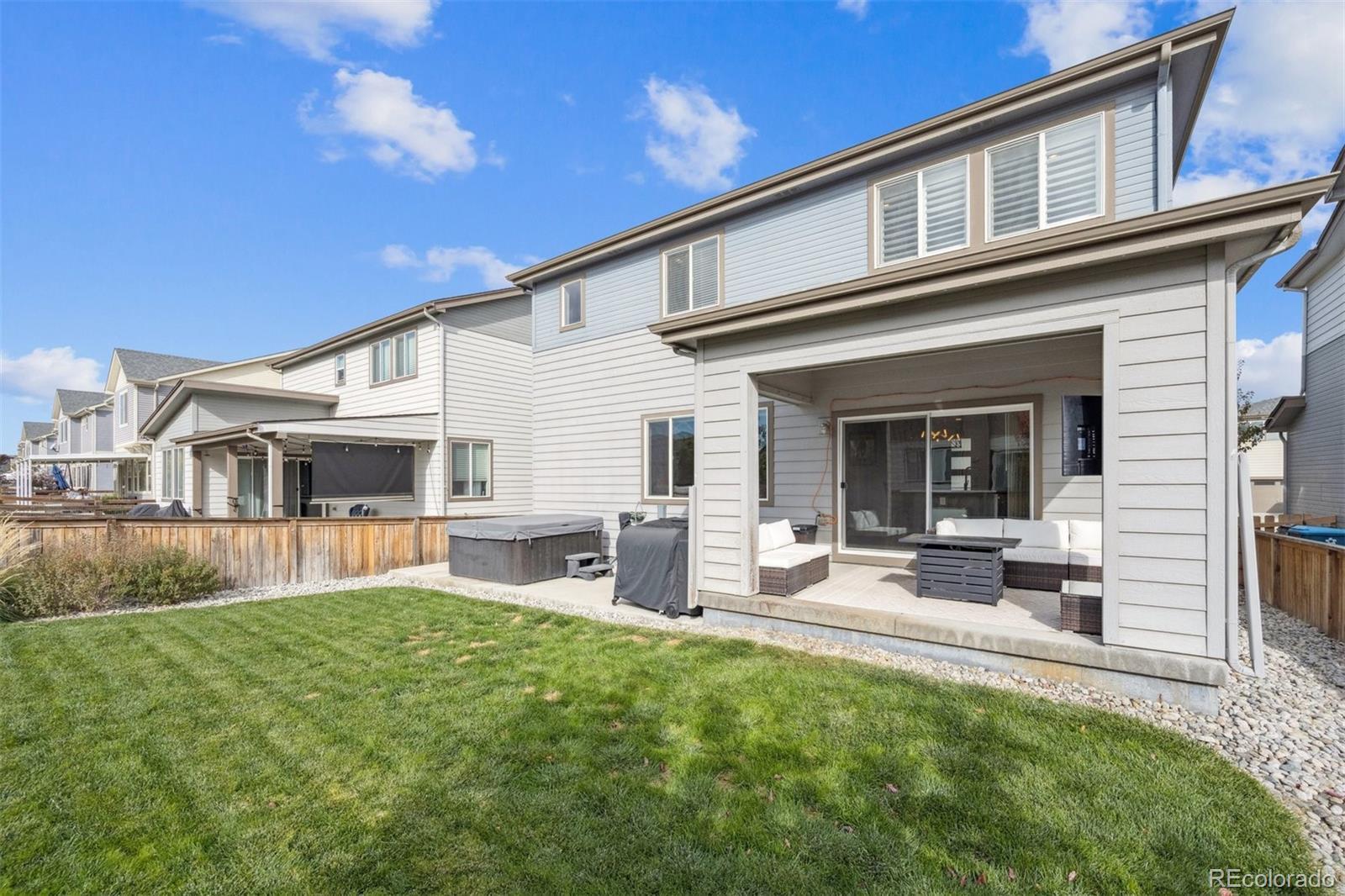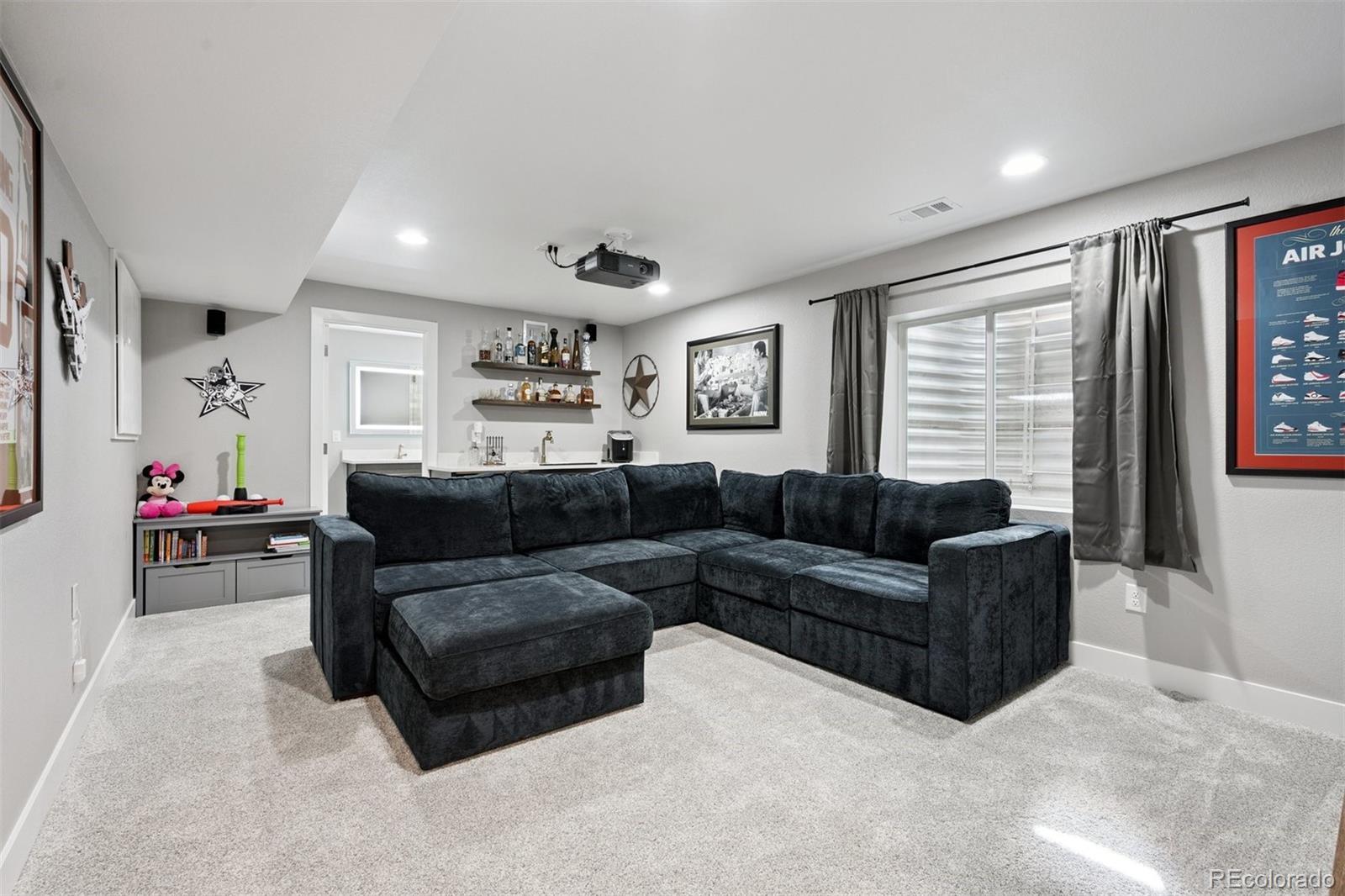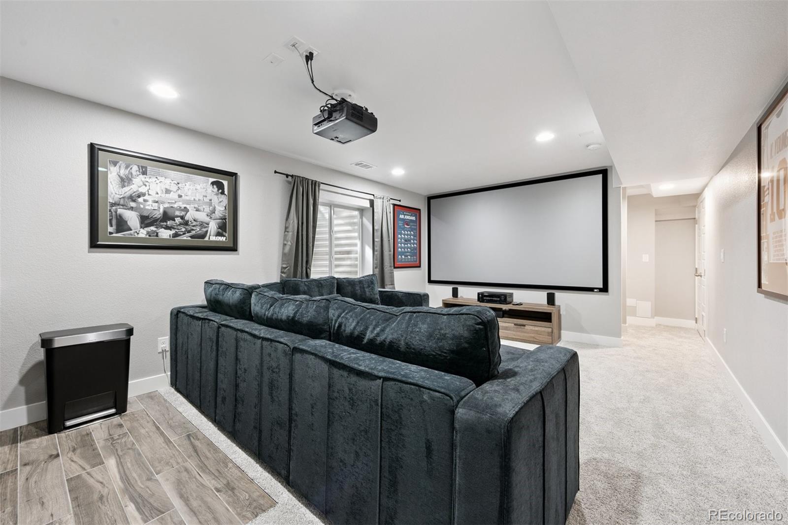 Welcome to this elegant contemporary home in the highly sought-after Reunion community, offering parks, lakes, and a state-of-the-art recreation center with basketball courts, fitness facilities, a kids’ center, and pools. The inviting covered front porch leads into a bright open layout with 9’ ceilings, laminate hardwood flooring, modern lighting, and ceiling fans in the living room and master bedroom. The kitchen features a large island with quartz countertops, shaker-style cabinets with soft-close doors and drawers, high-end appliances including a GE 5-burner gas stove and oven and an upgraded LG refrigerator. Plantation shutters enhance the bathrooms and master bedroom, while modern/industrial lighting, canned lighting, and dimmer switches create ambiance throughout. Downstairs, enjoy an incredible finished basement designed for entertaining—whether it’s game night, movie marathons, or hosting friends, this basement offers a wet bar with a 179-can or 46-bottle wine and beverage refrigerator, elegant 3/4 bath, and a negotiable home theater system with 120” screen, 4K projector, and surround sound. Once Upstairs, enjoy a spacious loft that provides versatile space for an office, gaming, or recreation. The backyard is a true retreat featuring a 6-person hot tub with LED lighting and Bluetooth speakers, a 9’ x 15’ covered patio, meticulous landscaped yard with large built-in planter boxes and 6-zone irrigation sprinkler system. Additional outdoor features include the customizable JellyFish exterior lighting system. Other highlights include an oversized 2-car garage with epoxy flooring, keyless front door, Navien tankless water heater, water softener, large crawl space for storage, a fully integrated Ring camera system covering the front door, garage, and backyard/sliding glass door. This exceptional property combines contemporary elegance, high-end finishes, and thoughtful upgrades for style, functionality, and ultimate comfort. Come make this house your home!