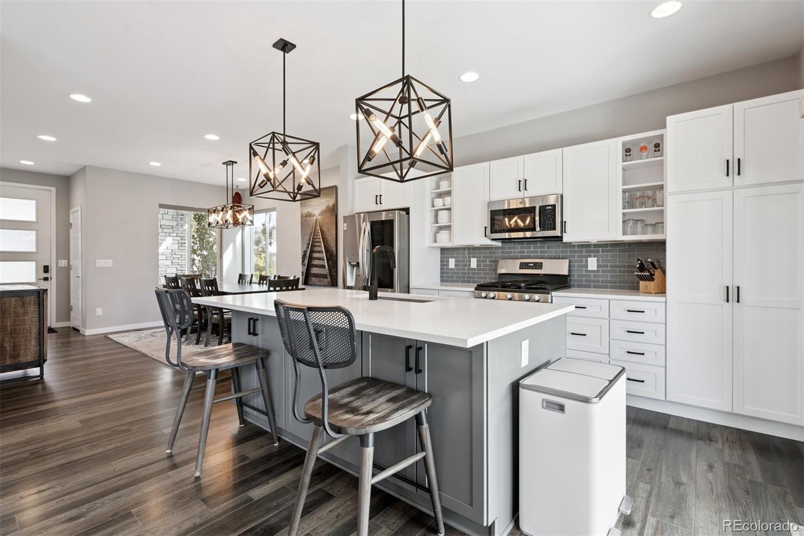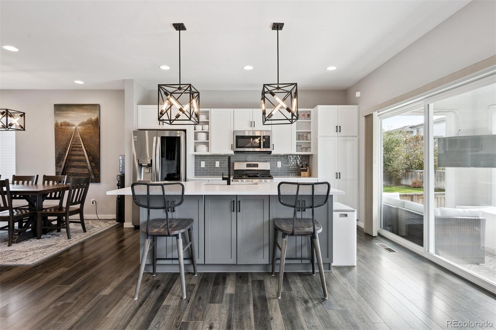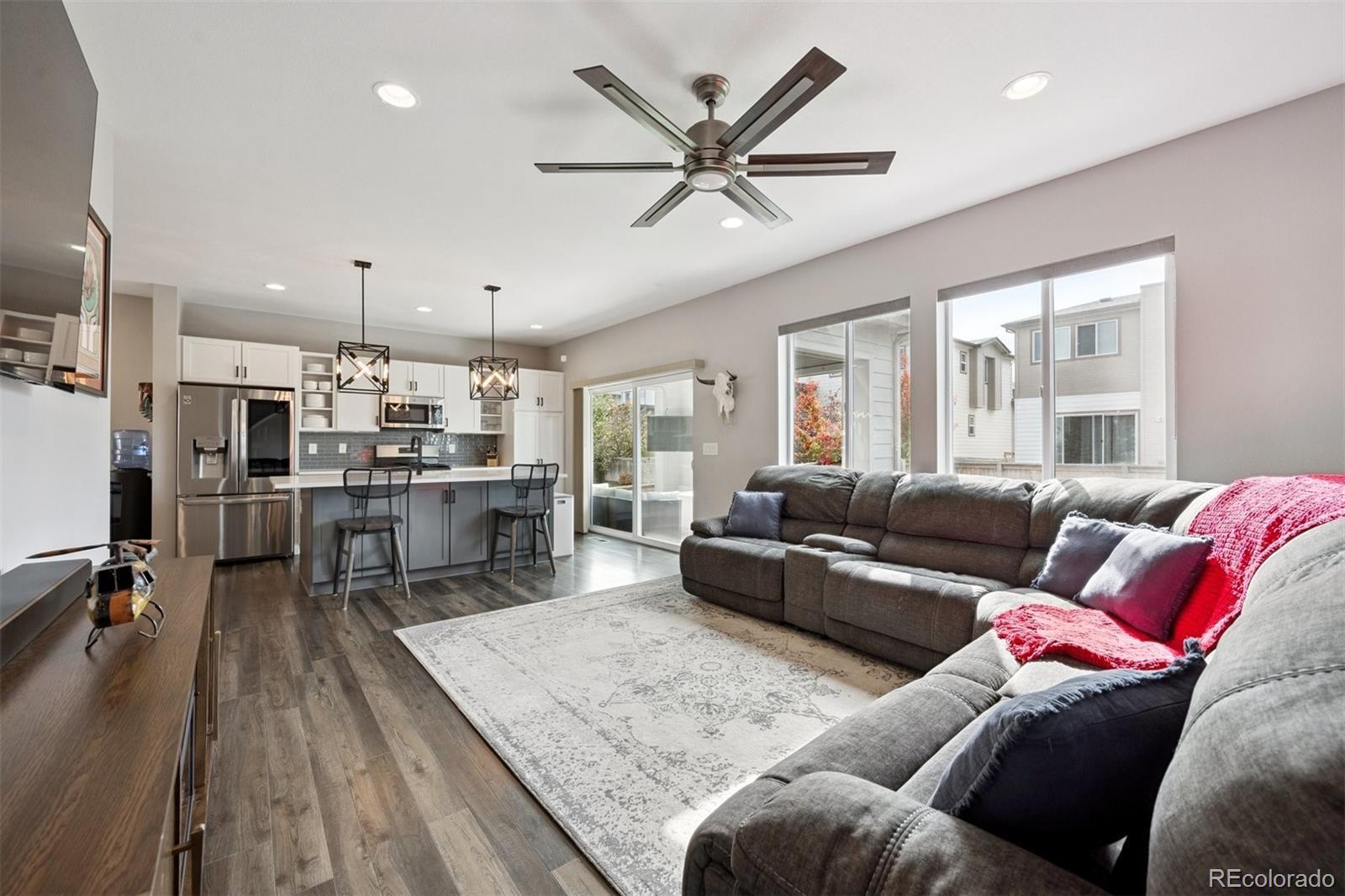 Welcome to this elegant contemporary home in the highly sought-after Reunion community, offering parks, lakes, and a state-of-the-art recreation center with basketball courts, fitness facilities, a kids’ center, and pools. The inviting covered front porch leads into a bright open layout with 9’ ceilings, laminate hardwood flooring, modern lighting, and ceiling fans in the living room and master bedroom. The kitchen features a large island with quartz countertops, shaker-style cabinets with soft-close doors and drawers, high-end appliances including a GE 5-burner gas stove and oven and an upgraded LG refrigerator. Plantation shutters enhance the bathrooms and master bedroom, while modern/industrial lighting, canned lighting, and dimmer switches create ambiance throughout. Downstairs, enjoy an incredible finished basement designed for entertaining—whether it’s game night, movie marathons, or hosting friends, this basement offers a wet bar with a 179-can or 46-bottle wine and beverage refrigerator, elegant 3/4 bath, and a negotiable home theater system with 120” screen, 4K projector, and surround sound. Once Upstairs, enjoy a spacious loft that provides versatile space for an office, gaming, or recreation. The backyard is a true retreat featuring a 6-person hot tub with LED lighting and Bluetooth speakers, a 9’ x 15’ covered patio, meticulous landscaped yard with large built-in planter boxes and 6-zone irrigation sprinkler system. Additional outdoor features include the customizable JellyFish exterior lighting system. Other highlights include an oversized 2-car garage with epoxy flooring, keyless front door, Navien tankless water heater, water softener, large crawl space for storage, a fully integrated Ring camera system covering the front door, garage, and backyard/sliding glass door. This exceptional property combines contemporary elegance, high-end finishes, and thoughtful upgrades for style, functionality, and ultimate comfort. Come make this house your home!