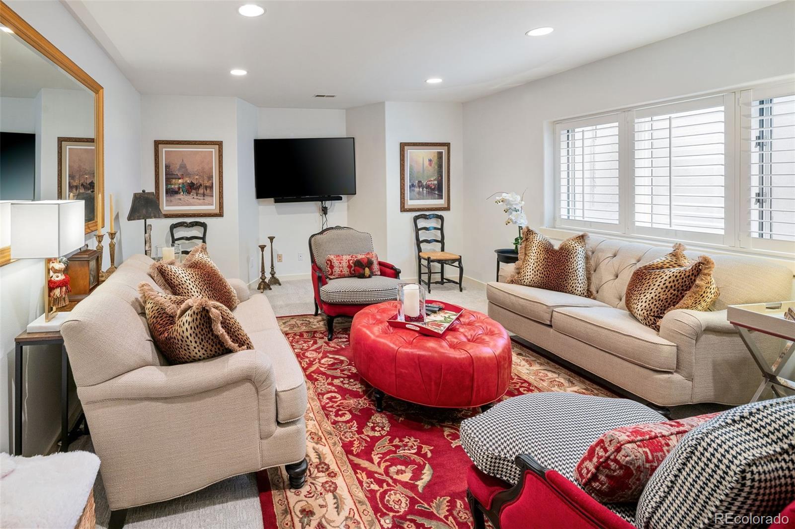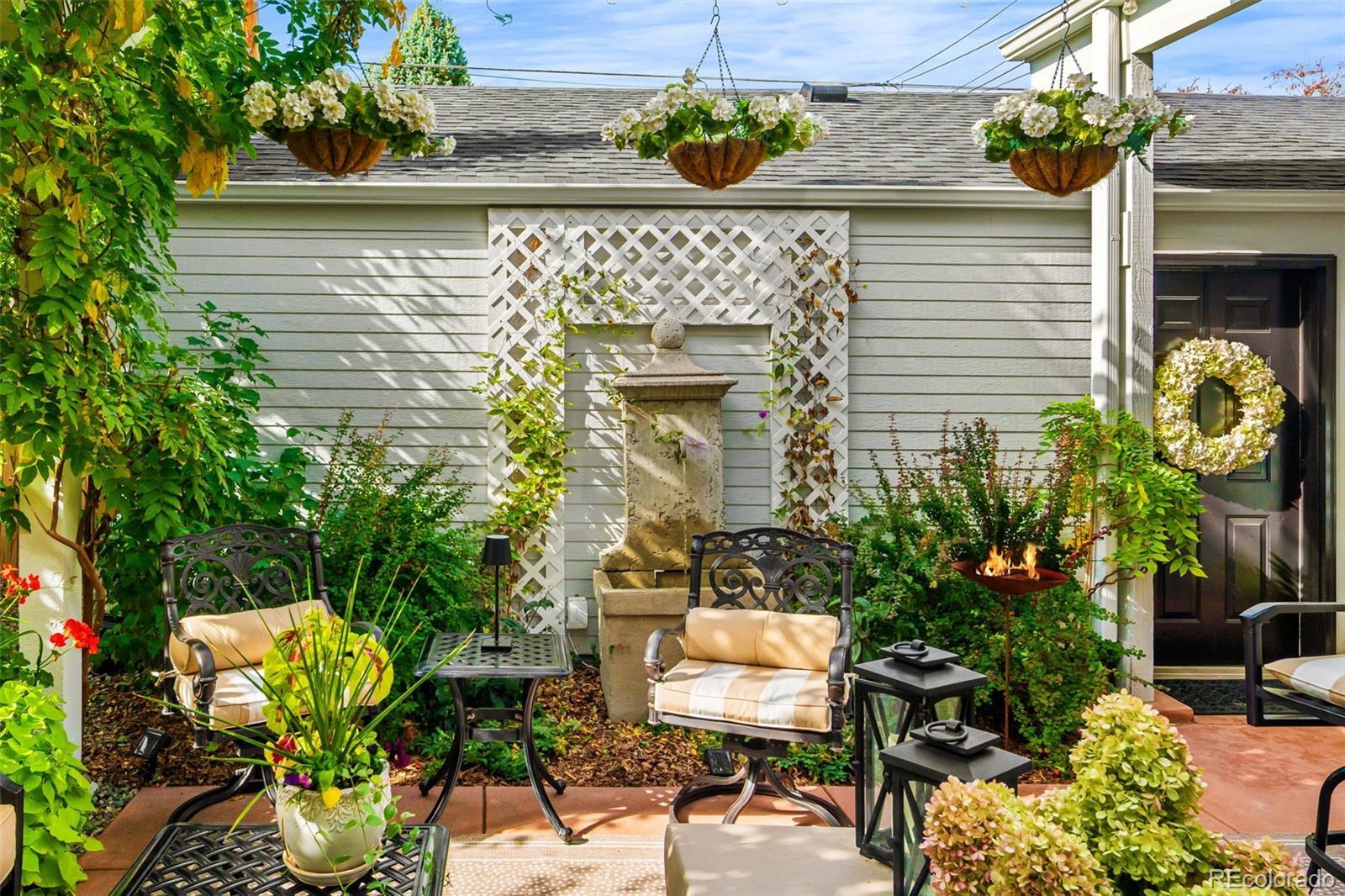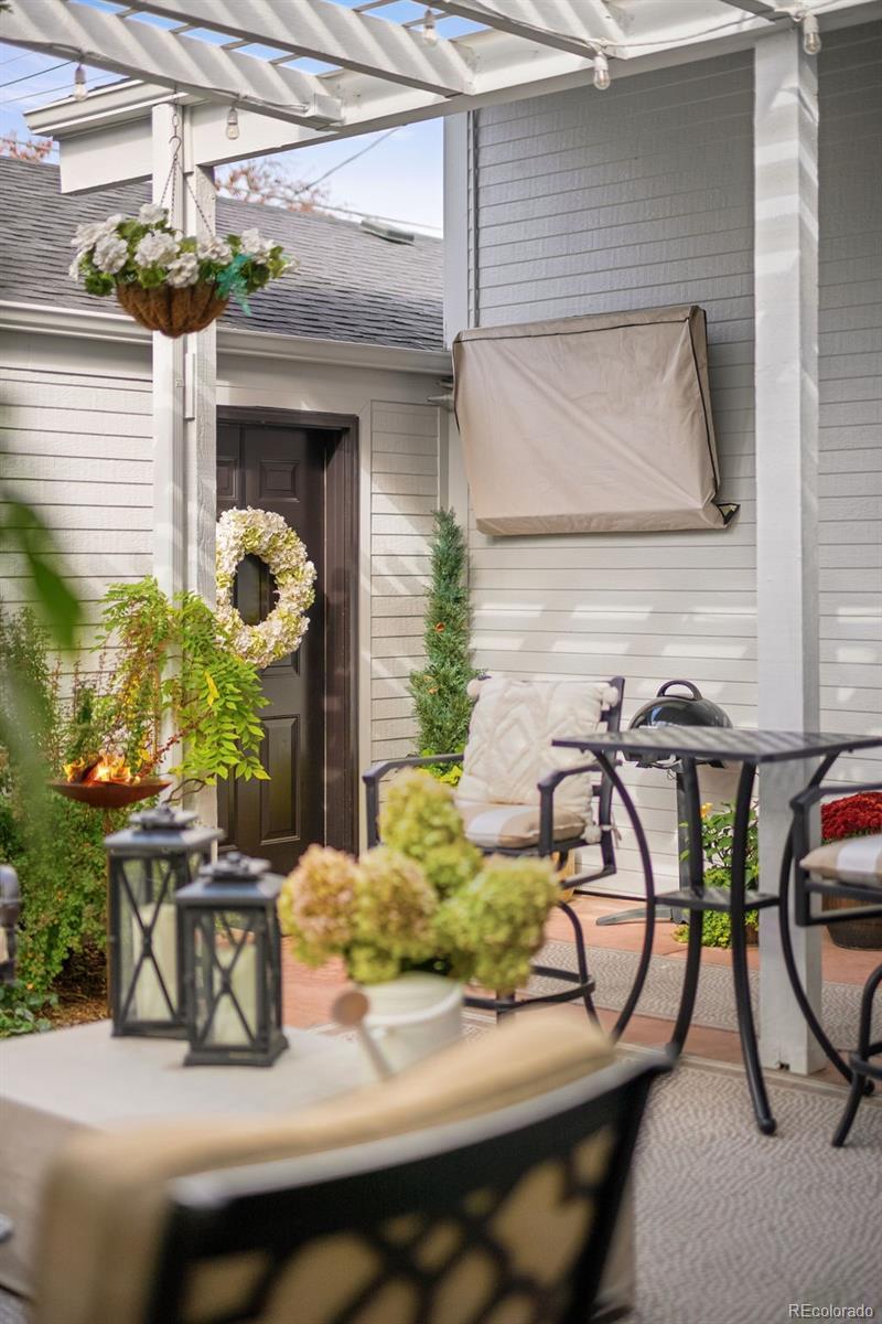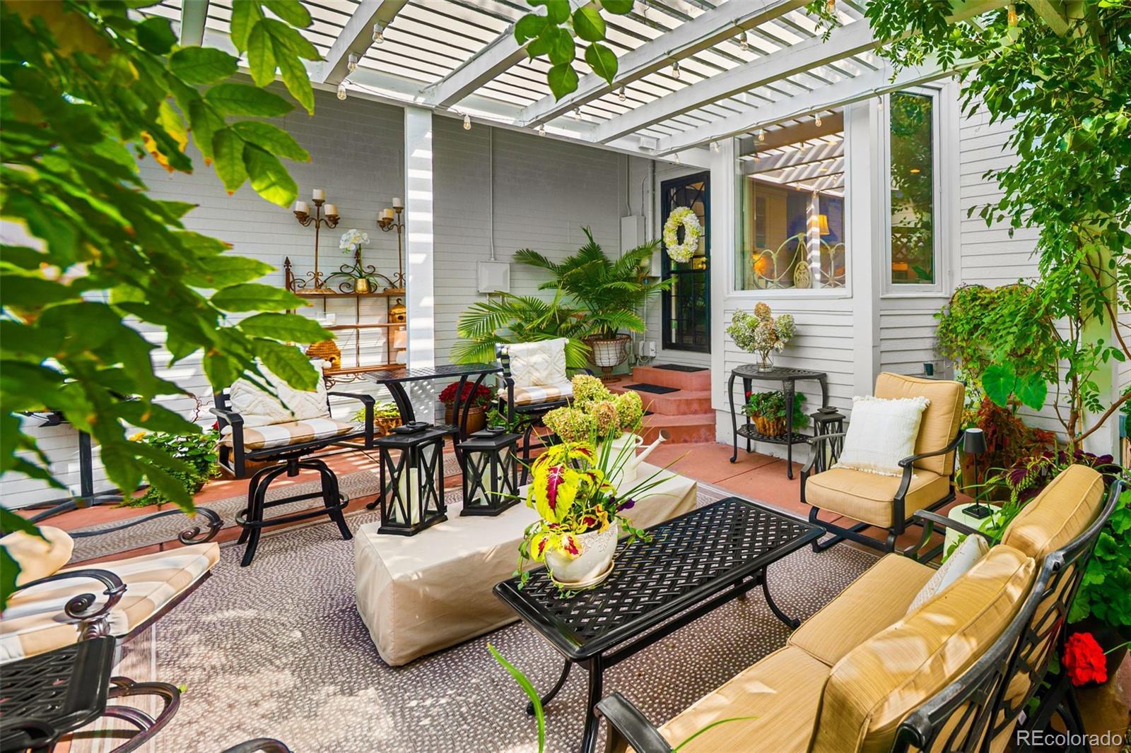Sophisticated sanctuary in the heart of Cherry Creek North full of exceptional upgrades making this home one of a kind. Welcome to a gorgeous, meticulously maintained townhome offering refined living and a private outdoor oasis—nestled among mature trees and lush landscaping. Step inside to a spacious, light-filled interior where rich hardwood floors flow seamlessly throughout the main level. The living room exudes warmth and elegance with soaring ceilings, crown molding, a cozy gas fireplace, plantation shutters and abundant natural light. A built-in sound system adds ambiance throughout the home. The gourmet kitchen is a chef’s dream, featuring a large Quartzite Island with counter seating, premium Thermador appliances, bay window. and dazzling new Schonbek crystal chandeliers. Adjacent to the kitchen, a versatile bonus space awaits—perfect for a formal dining room, home office or space to unwind, already plumbed for a wet bar. Step outside to your secluded patio retreat, ideal for entertaining or unwinding. Enjoy the firepit, tranquil water feature, outdoor TV, and a beautifully lit pergola surrounded by manicured landscaping. A newly installed 7.5 -foot privacy fence completes this serene escape. Upstairs, the expansive primary suite offers a peaceful haven with high cathedral ceilings, a charming window seat, ceiling fan, and generous closet space. The luxurious ensuite bath features heated tile floors, a soaking tub, dual vanities, and a spacious walk-in shower and skylight —your personal spa after a long day. A stunning secondary bedroom completes the upper level, boasting vaulted beamed ceilings, natural lighting and a sleek ensuite bath your guests will never want to leave. The finished lower level includes high ceilings, light-filled secondary guest bedroom, large family room (or non-conforming fourth bedroom), a remodeled full bath, and laundry room with new washer and dryer. Ample closets and storage as well for all of your extras.