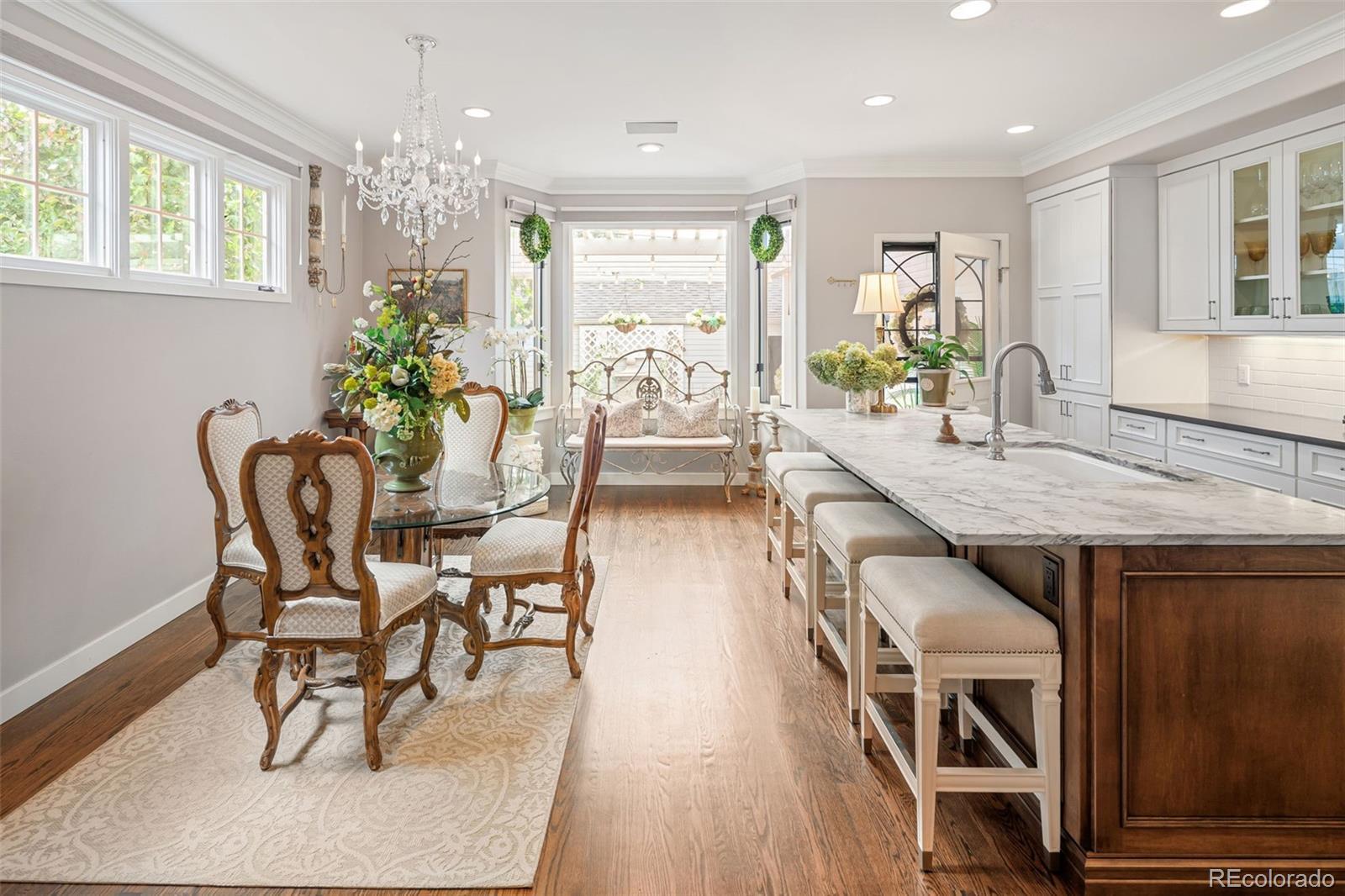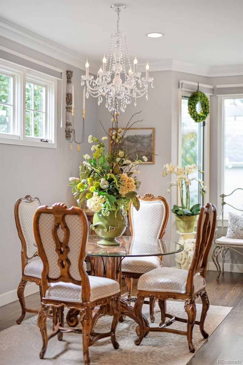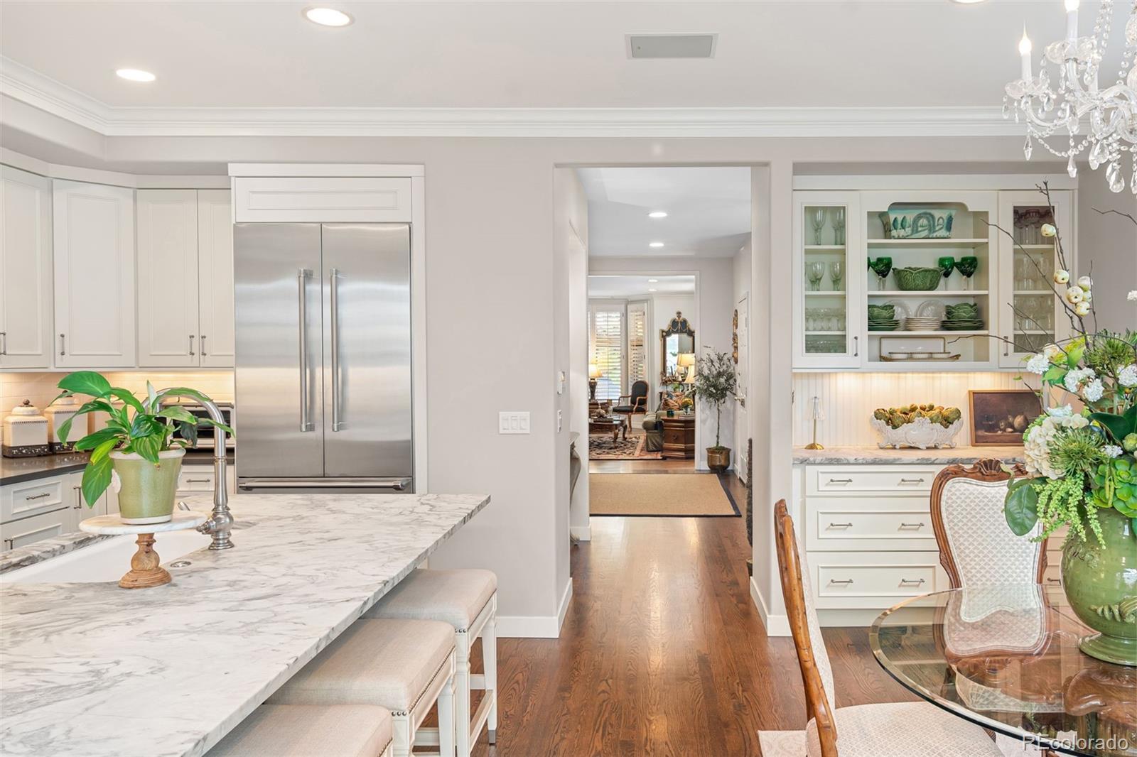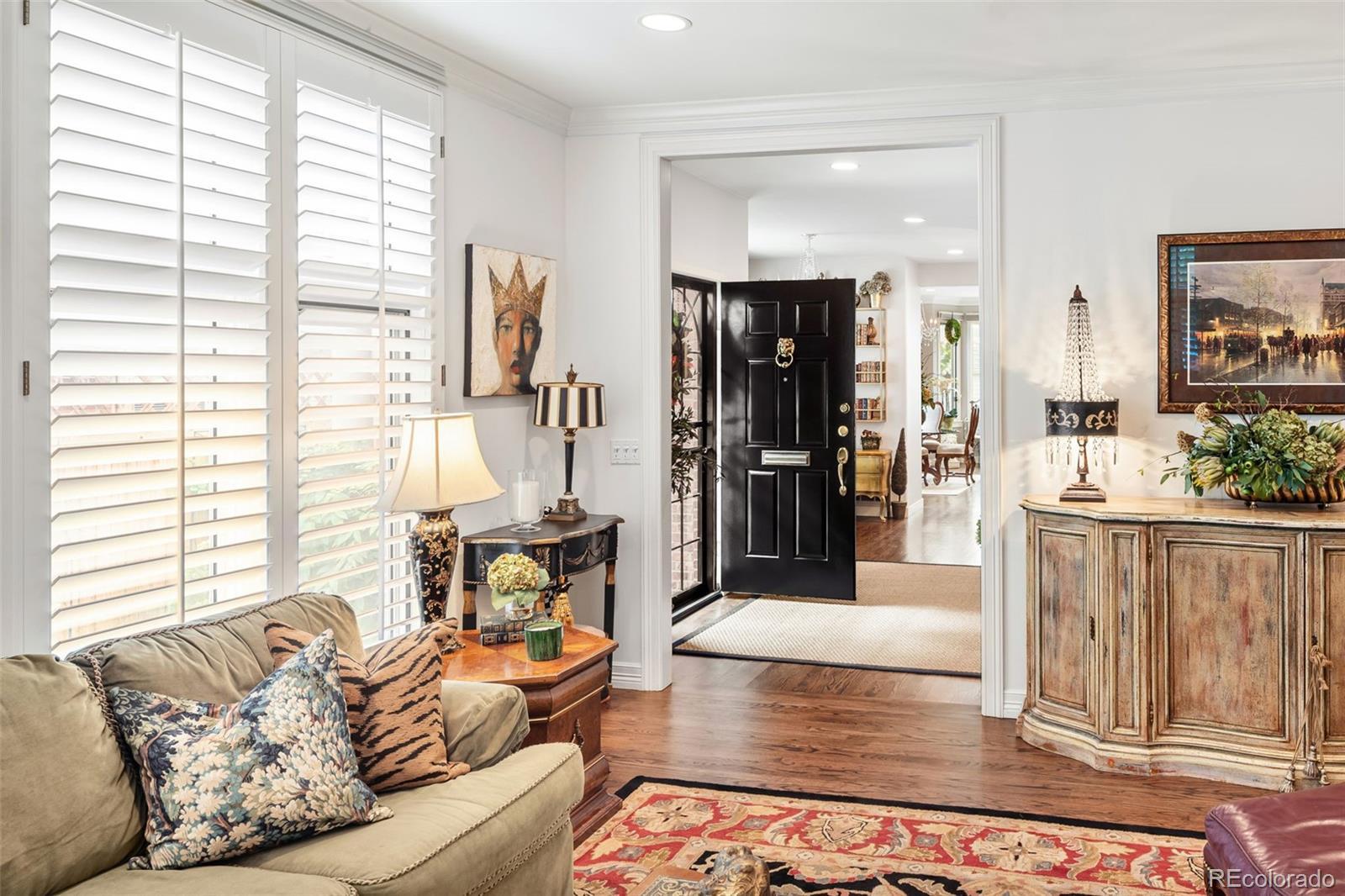Sophisticated sanctuary in the heart of Cherry Creek North full of exceptional upgrades making this home one of a kind. Welcome to a gorgeous, meticulously maintained townhome offering refined living and a private outdoor oasis—nestled among mature trees and lush landscaping. Step inside to a spacious, light-filled interior where rich hardwood floors flow seamlessly throughout the main level. The living room exudes warmth and elegance with soaring ceilings, crown molding, a cozy gas fireplace, plantation shutters and abundant natural light. A built-in sound system adds ambiance throughout the home. The gourmet kitchen is a chef’s dream, featuring a large Quartzite Island with counter seating, premium Thermador appliances, bay window. and dazzling new Schonbek crystal chandeliers. Adjacent to the kitchen, a versatile bonus space awaits—perfect for a formal dining room, home office or space to unwind, already plumbed for a wet bar. Step outside to your secluded patio retreat, ideal for entertaining or unwinding. Enjoy the firepit, tranquil water feature, outdoor TV, and a beautifully lit pergola surrounded by manicured landscaping. A newly installed 7.5 -foot privacy fence completes this serene escape. Upstairs, the expansive primary suite offers a peaceful haven with high cathedral ceilings, a charming window seat, ceiling fan, and generous closet space. The luxurious ensuite bath features heated tile floors, a soaking tub, dual vanities, and a spacious walk-in shower and skylight —your personal spa after a long day. A stunning secondary bedroom completes the upper level, boasting vaulted beamed ceilings, natural lighting and a sleek ensuite bath your guests will never want to leave. The finished lower level includes high ceilings, light-filled secondary guest bedroom, large family room (or non-conforming fourth bedroom), a remodeled full bath, and laundry room with new washer and dryer. Ample closets and storage as well for all of your extras.