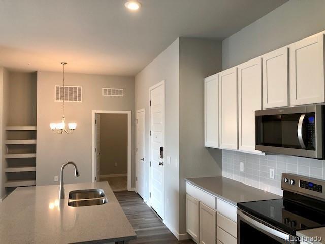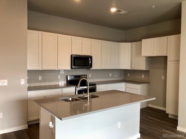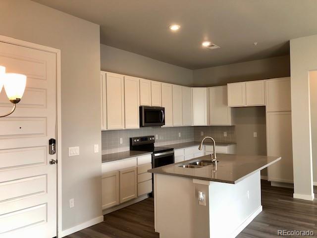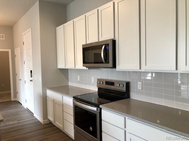 This newly constructed home is ready for immediate move-ins - an unbeatable and spacious West facing enclosed balcony overlooking the Cherry Creek Trail System. This home is a corner unit on the main level of the building - no stairs and has abundant natural light from all windows in the home. “Silverton White” - this stunning design package features modern white cabinetry and striking quartz countertops in kitchen. Contemporary open floor plan. Primary suite features walk-in closet, large shower, and double sinks. Luxury vinyl plank flooring in kitchen, living, and dining areas. Bathrooms and laundry room feature elegant 12”x24” tile. Enjoy the community park, BBQ and fire pit area, and quick access to Westcreek Dog Park, Cherry Creek Trail, DTC, Main Street Parker, Castle Rock and Denver. Open community parking, limited number of one-bay garages available for additional purchase price. Building has an elevator. Fantastic Parker location! Open house every Saturday and Sunday 12pm - 3pm. Don’t miss out on the new reduced pricing good through 2/28/2023. Prices and incentives are contingent upon buyer closing a loan with builders affiliated lender and are subject to change at any time.