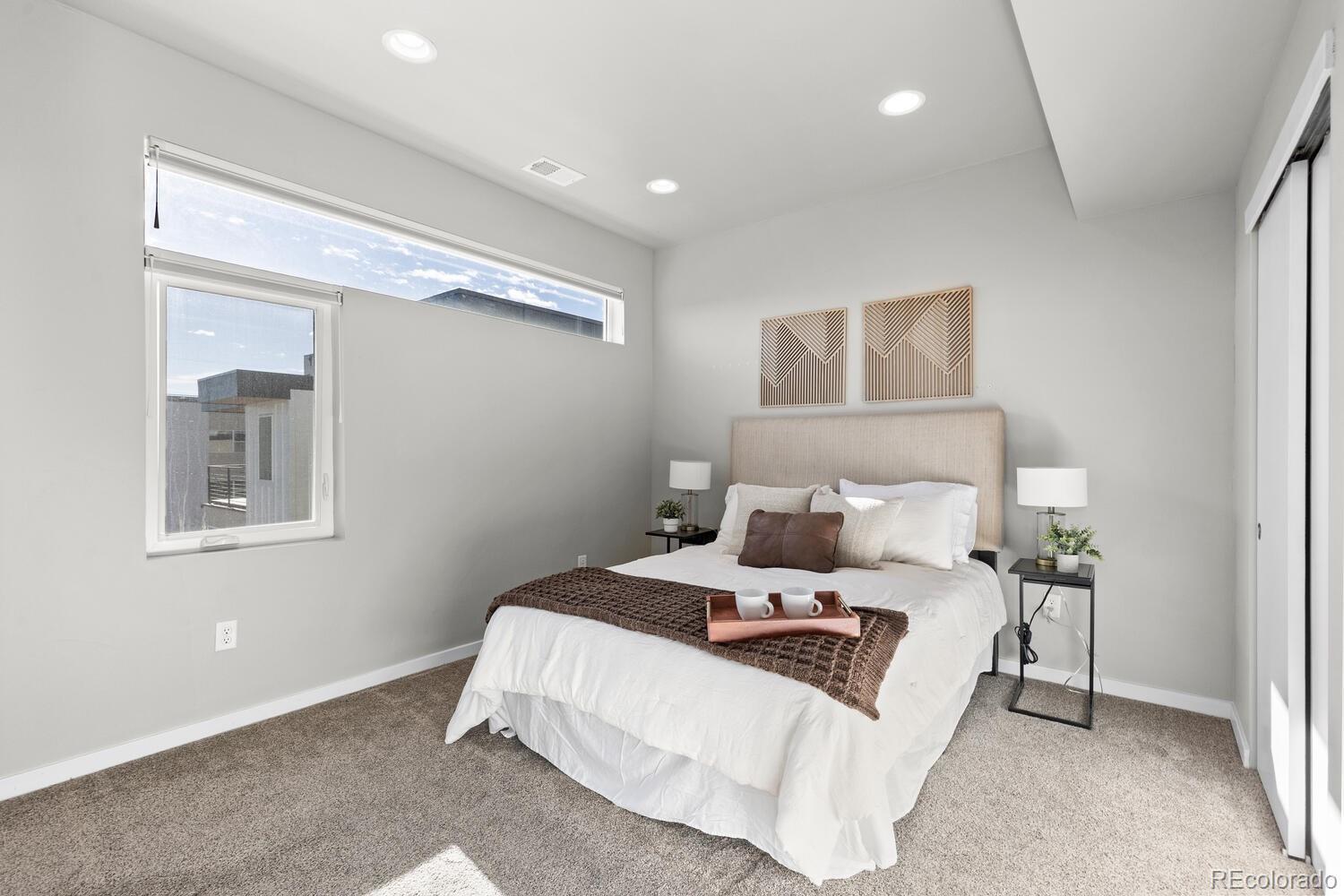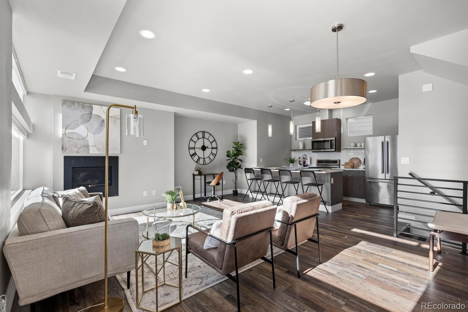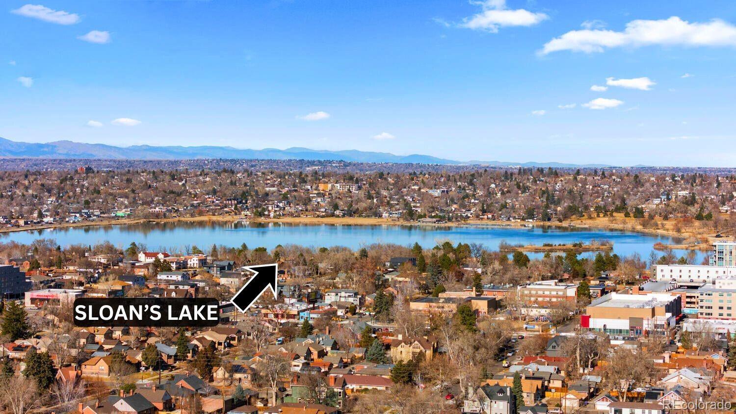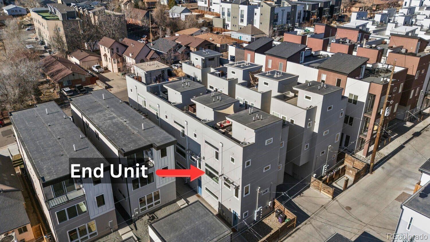 Modern End-Unit Townhome w/ HUGE Rooftop Deck & Unobstructed Mountain Views & City Views, Designer Finishes, & 1-car attached garage in Sloan’s Lake area. Refined, multi-level living in an exceptional location- low-traffic cul-de-sac just 1/2 a block from Dry Gulch Trail & light rail. Attached garage provides space for exercise equipment, etc, & add’l standing-height storage space for gear & essentials. Ground floor entry provides garage access as well as a convenient 1/2 bath. Main living floor dazzles w/ a dramatic great room featuring a wall of windows—flooding the space with natural light—9’ ceilings, and sleek gas fireplace. Faux wood LVP flooring and troweled wall texture create a seamless, contemporary backdrop, while top-down/bottom-up tension shades ($2,860 upgrade) diffuse sunlight for the perfect ambiance any time of day. A versatile nook provides flexible space for dining or work-from-home lifestyle, enhanced by sleek recessed lighting and striking modern metal stair railing. Gourmet kitchen w/ European flat-door cabinets, floating shelving, classic subway tile backsplash, quartz countertops, large eat-in peninsula, & KitchenAid stainless-steel appliance suite, includes: 5-burner gas range w/ warming zone & warming drawer; vented hood; and a large, single-basin undermount sink—all beautifully illuminated by two elevated windows. Upstairs, the primary bedroom, complete with ensuite bath boasts large, glass-enclosed shower, modern floating vanity, solid surface countertops, & undermount sink. Spacious 2nd bedroom includes its own ensuite for flexible living options. Full-sized in-unit laundry (W/D included). Private rooftop deck, w/panoramic mountain and city views. Upgraded, lockable privacy fence & gated alley entrance. Add’l highlights include: Quiet, end-unit location for max privacy; Upgraded window blinds throughout; Rare proximity to trails, parks, & light rail—just 1/2 block away; Easy access to major Denver attractions, shops, restaurants, & more.