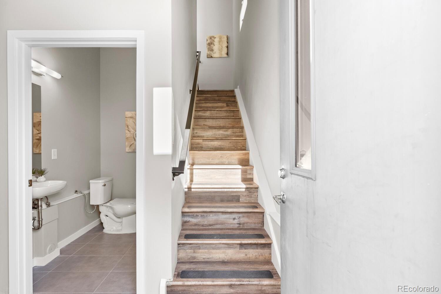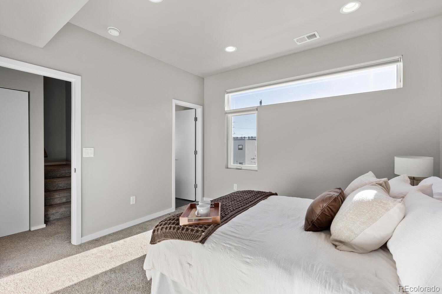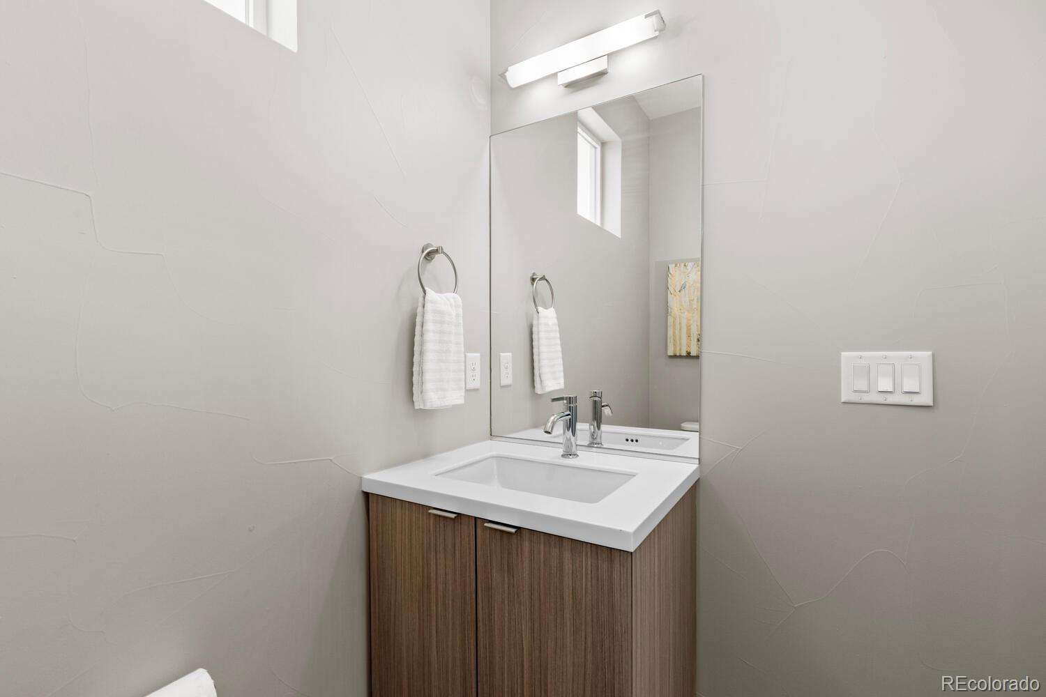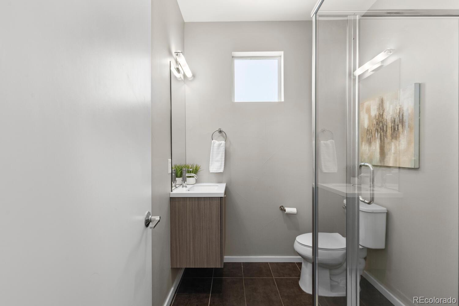Modern End-Unit Townhome w/ HUGE Rooftop Deck & Unobstructed Mountain Views & City Views, Designer Finishes, & 1-car attached garage in Sloan’s Lake area. Refined, multi-level living in an exceptional location- low-traffic cul-de-sac just 1/2 a block from Dry Gulch Trail & light rail. Attached garage provides space for exercise equipment, etc, & add’l standing-height storage space for gear & essentials. Ground floor entry provides garage access as well as a convenient 1/2 bath. Main living floor dazzles w/ a dramatic great room featuring a wall of windows—flooding the space with natural light—9’ ceilings, and sleek gas fireplace. Faux wood LVP flooring and troweled wall texture create a seamless, contemporary backdrop, while top-down/bottom-up tension shades ($2,860 upgrade) diffuse sunlight for the perfect ambiance any time of day. A versatile nook provides flexible space for dining or work-from-home lifestyle, enhanced by sleek recessed lighting and striking modern metal stair railing. Gourmet kitchen w/ European flat-door cabinets, floating shelving, classic subway tile backsplash, quartz countertops, large eat-in peninsula, & KitchenAid stainless-steel appliance suite, includes: 5-burner gas range w/ warming zone & warming drawer; vented hood; and a large, single-basin undermount sink—all beautifully illuminated by two elevated windows. Upstairs, the primary bedroom, complete with ensuite bath boasts large, glass-enclosed shower, modern floating vanity, solid surface countertops, & undermount sink. Spacious 2nd bedroom includes its own ensuite for flexible living options. Full-sized in-unit laundry (W/D included). Private rooftop deck, w/panoramic mountain and city views. Upgraded, lockable privacy fence & gated alley entrance. Add’l highlights include: Quiet, end-unit location for max privacy; Upgraded window blinds throughout; Rare proximity to trails, parks, & light rail—just 1/2 block away; Easy access to major Denver attractions, shops, restaurants, & more.