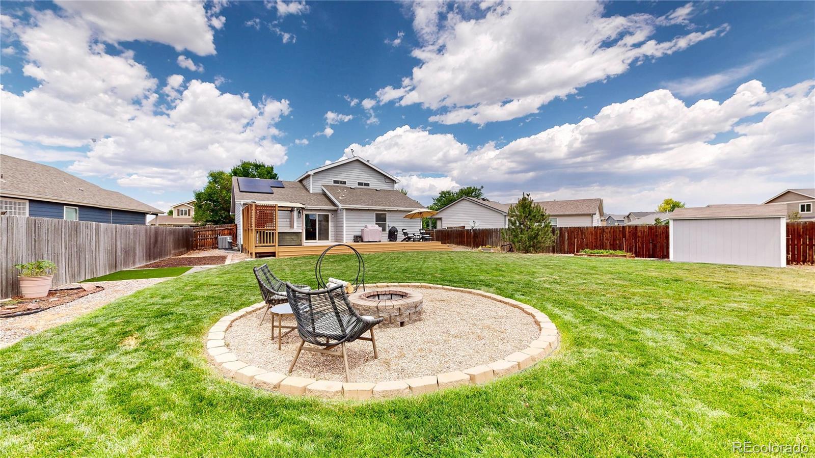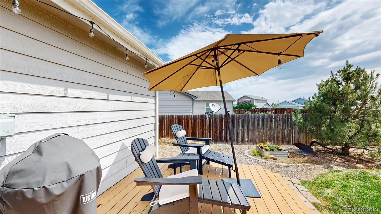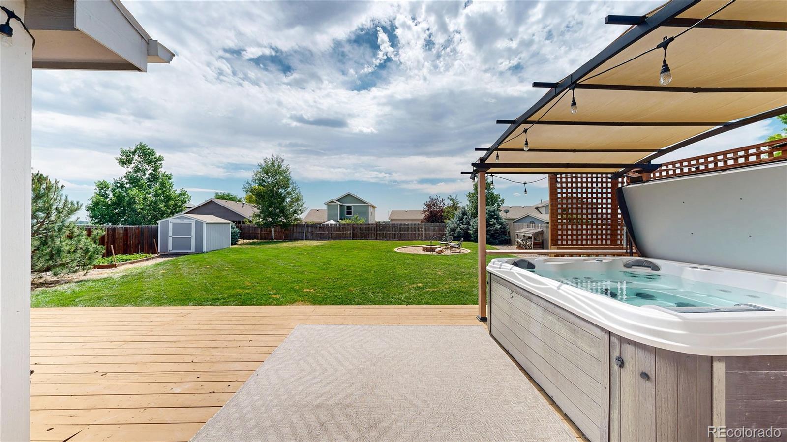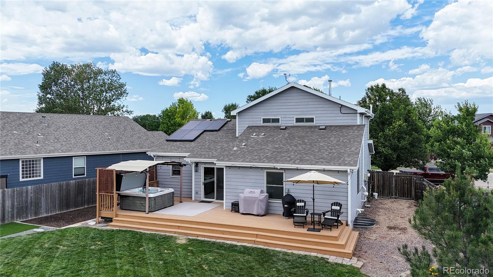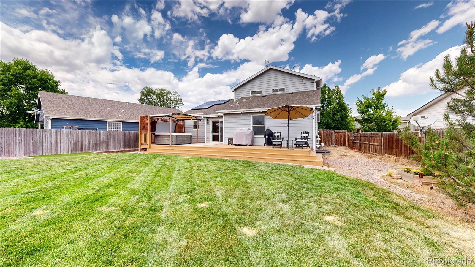 Nestled on one of the largest lots in the neighborhood, this stunning two-story home offers an inviting blend of comfort and modern updating. As you step inside, you're greeted by beamed ceilings, an open-concept floorplan, and a main floor primary suite that create an atmosphere of warmth and sophistication. The luxury vinyl flooring flows seamlessly throughout the main level, providing both durability and elegance. The heart of the home is the chef's kitchen featuring a large farmhouse sink, gas cooktop, generous cabinet space, and an expansive island that is perfect for gatherings and entertaining. The main-floor primary suite provides a private retreat, complete with ample natural light and an ensuite bath designed for relaxation. Venture upstairs to discover a loft area and two secondary bedrooms and full hall bath. The finished basement is truly a highlight, boasting a massive recreation area that comes alive with an electric fireplace and custom wood wall paneling. The wet bar, complete with a kegerator, ensures you're ready to host friends and family for game or movie night. The true showstopper is the backyard oasis where unwinding and entertainment seamlessly intertwine. The spacious deck beckons for al fresco dining, while the hot tub invites you to soak under the stars. Gather around the fire pit with loved ones to share stories and create memories. A new roof, new HVAC, Renewal by Andersen windows, upgraded sprinkler system, fully paid solar system, and Level II vehicle charger complete the package. With no metro district and conveniently close to parks, Milliken Waterworks Pool, and other amenities, this home offers the best of both worlds: the vibrancy of nearby attractions and the peace of a quiet neighborhood. It's all here!