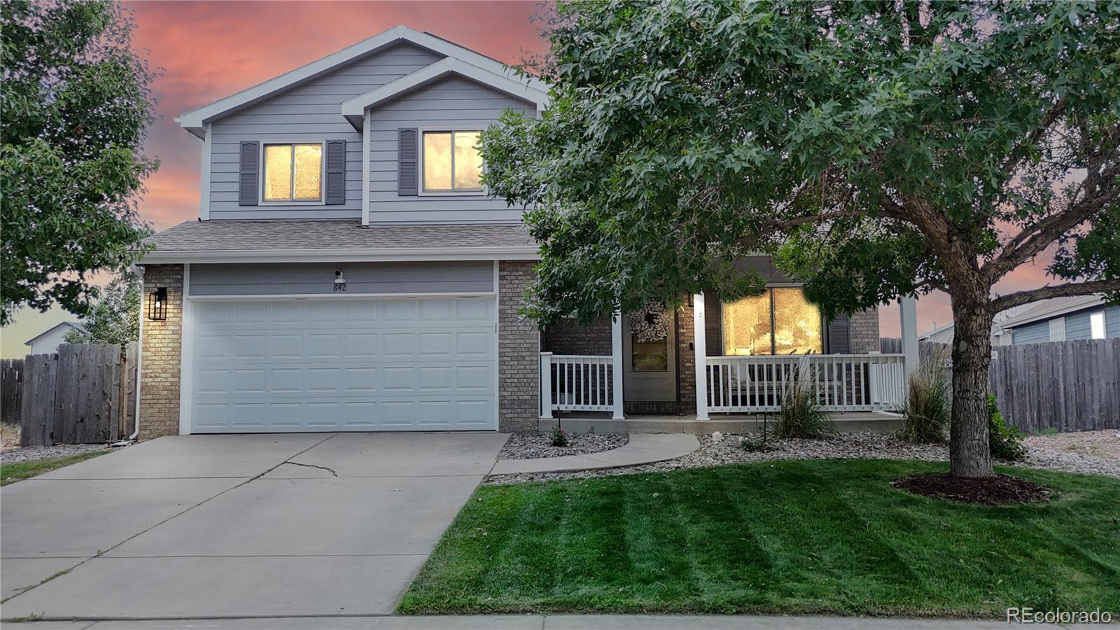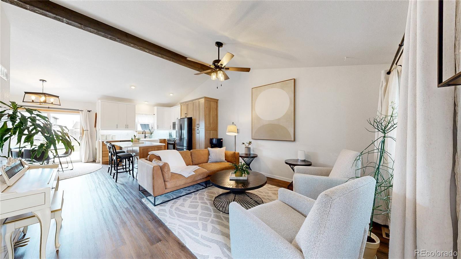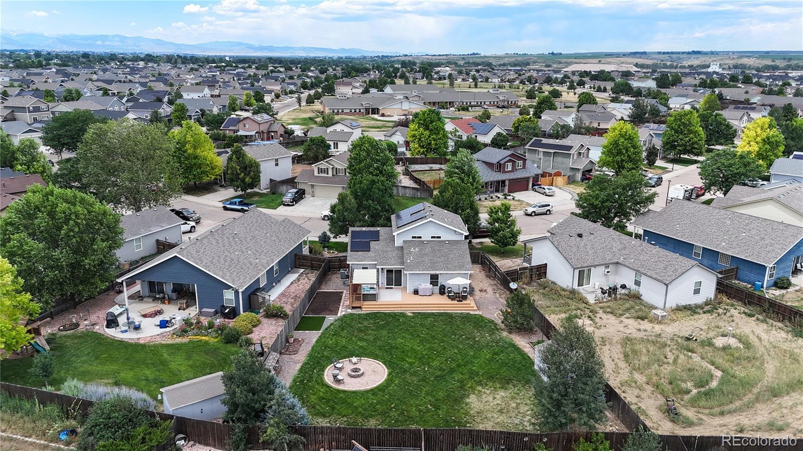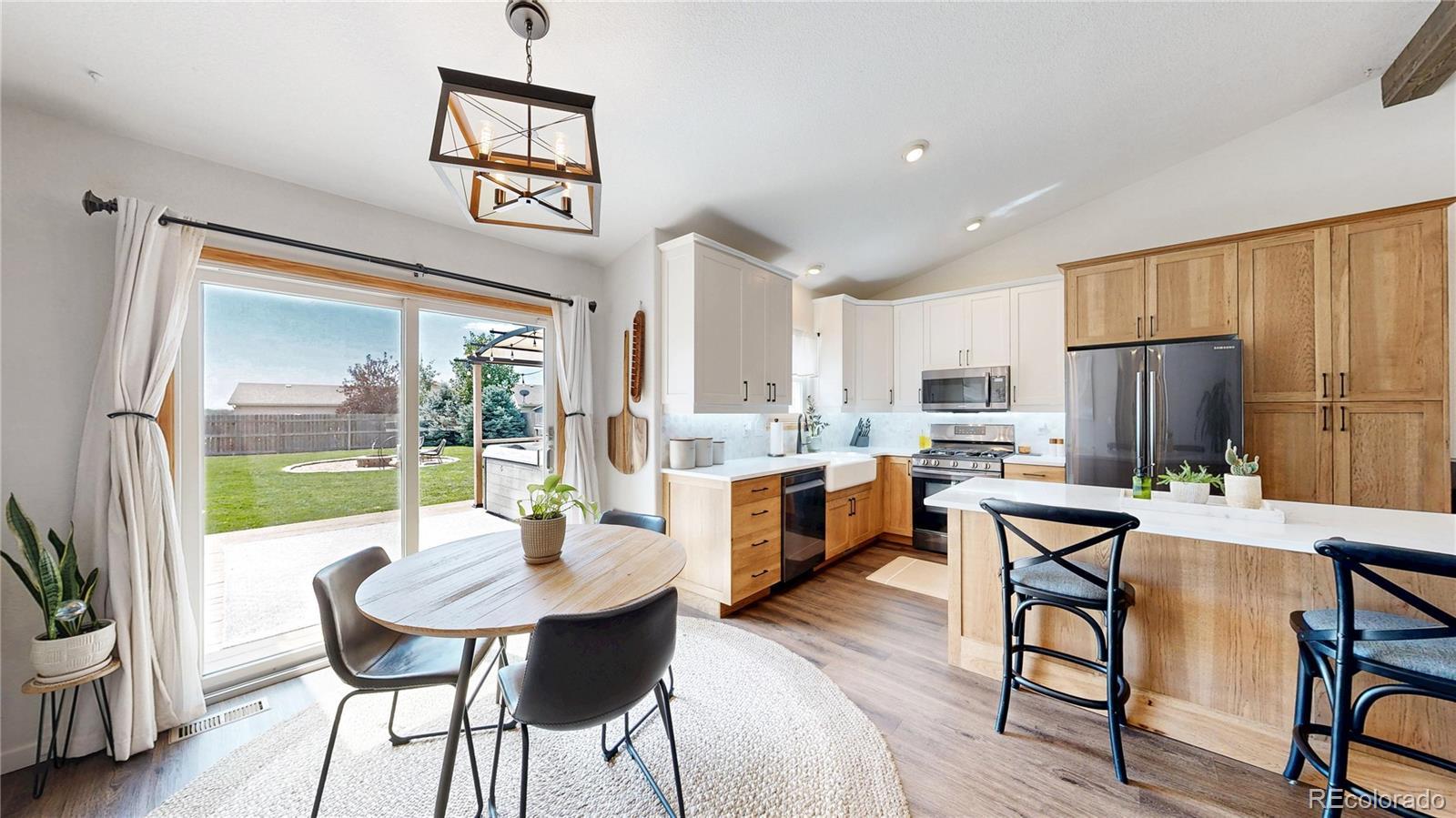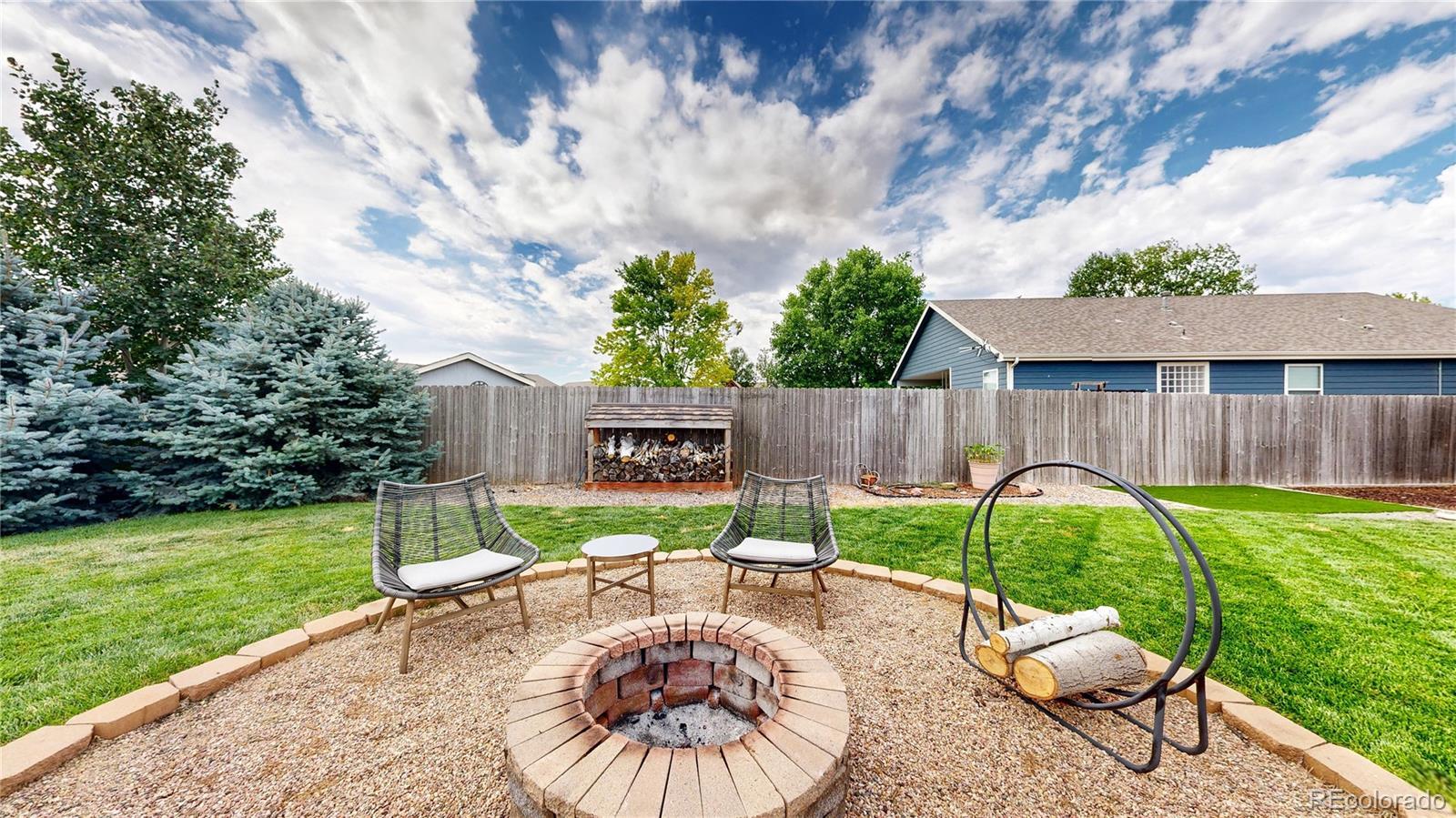Nestled on one of the largest lots in the neighborhood, this stunning two-story home offers an inviting blend of comfort and modern updating. As you step inside, you're greeted by beamed ceilings, an open-concept floorplan, and a main floor primary suite that create an atmosphere of warmth and sophistication. The luxury vinyl flooring flows seamlessly throughout the main level, providing both durability and elegance. The heart of the home is the chef's kitchen featuring a large farmhouse sink, gas cooktop, generous cabinet space, and an expansive island that is perfect for gatherings and entertaining. The main-floor primary suite provides a private retreat, complete with ample natural light and an ensuite bath designed for relaxation. Venture upstairs to discover a loft area and two secondary bedrooms and full hall bath. The finished basement is truly a highlight, boasting a massive recreation area that comes alive with an electric fireplace and custom wood wall paneling. The wet bar, complete with a kegerator, ensures you're ready to host friends and family for game or movie night. The true showstopper is the backyard oasis where unwinding and entertainment seamlessly intertwine. The spacious deck beckons for al fresco dining, while the hot tub invites you to soak under the stars. Gather around the fire pit with loved ones to share stories and create memories. A new roof, new HVAC, Renewal by Andersen windows, upgraded sprinkler system, fully paid solar system, and Level II vehicle charger complete the package. With no metro district and conveniently close to parks, Milliken Waterworks Pool, and other amenities, this home offers the best of both worlds: the vibrancy of nearby attractions and the peace of a quiet neighborhood. It's all here!