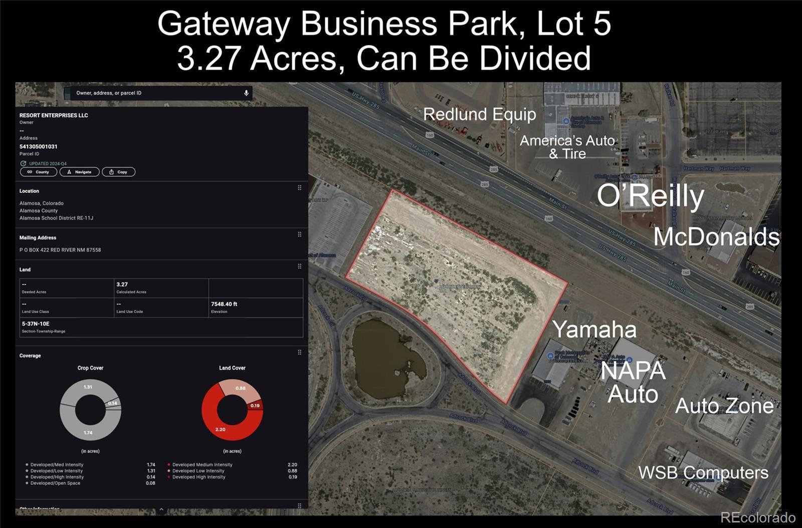 Do not miss this commercial opportunity in Alamosa Gateway's up and coming business park. This large vacant lot lends itself to many types of business possibilities. The property can also be divided into smaller parcels subject to city regulations. Wide open high visibility from Hwy 160 with a traffic count of approximately 9,000 cars per day. Easy access off the highway on a lighted and paved road allowing for easy delivery access off Adcock Circle. This commercial opportunity is ideal for future development or planed commercial spaces on a 3.26 acre lot. Zoned Commercial Business allowing for a multitude of uses.
