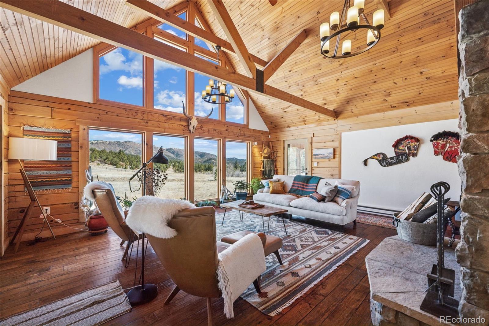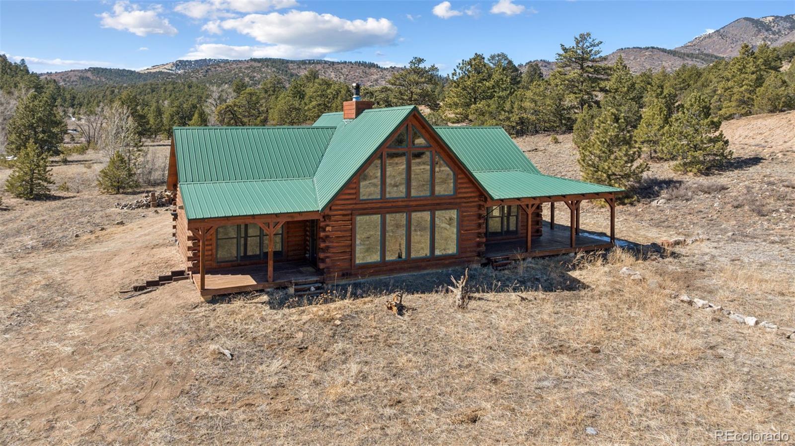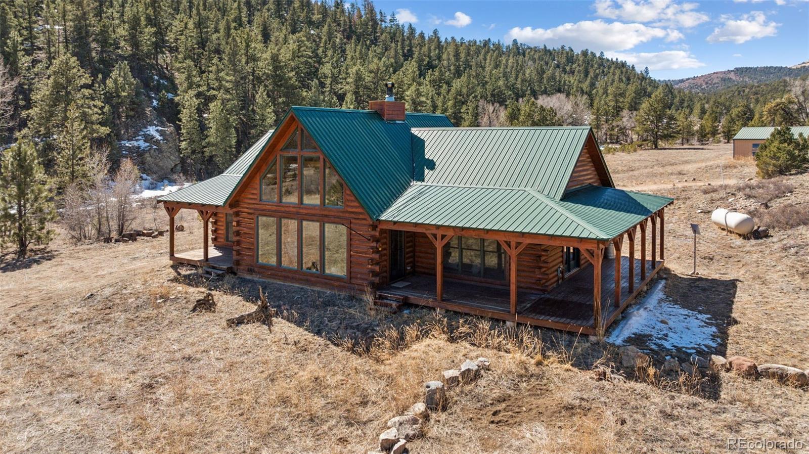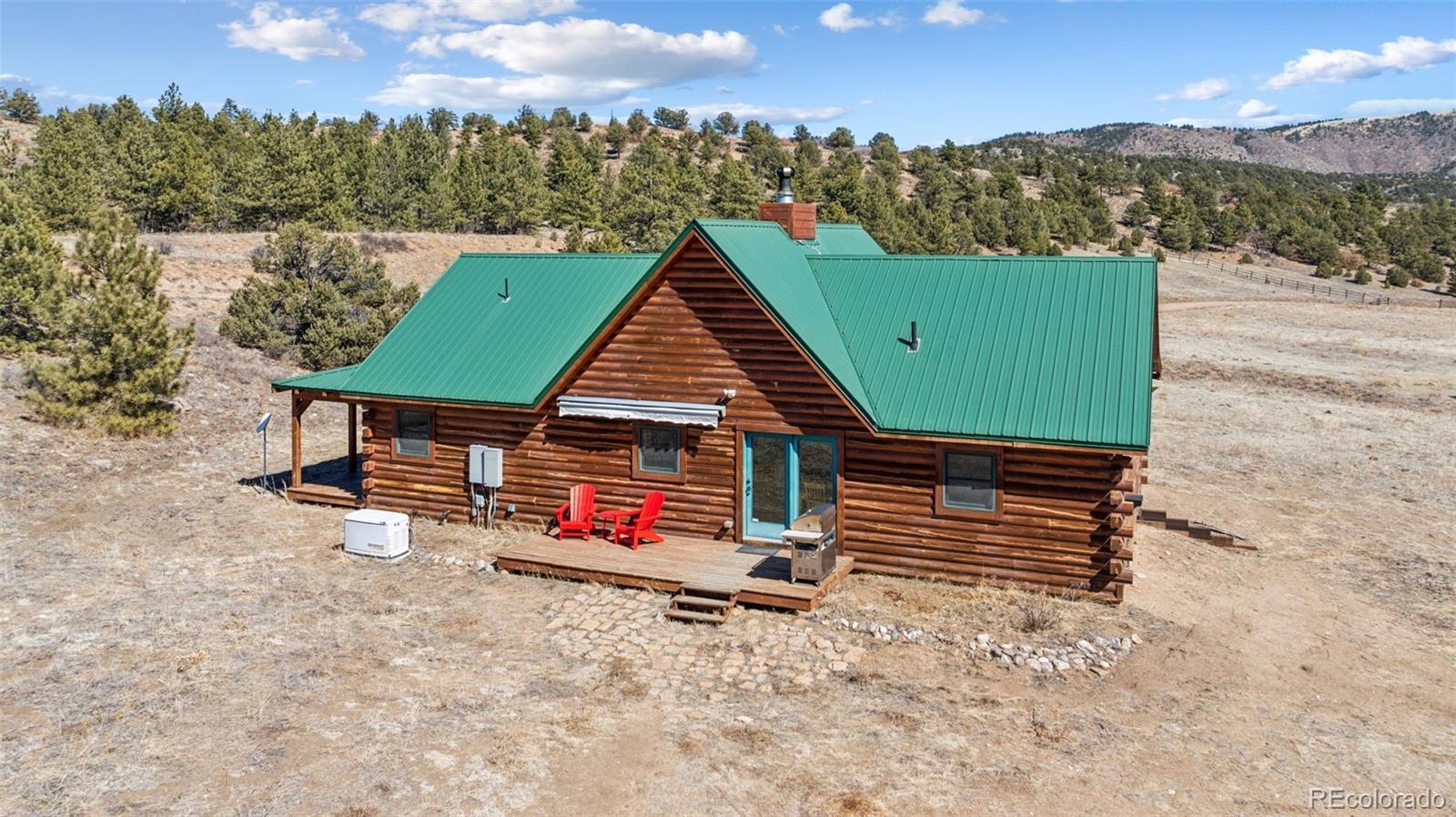 Modern Log Home on 35 Acres with Unmatched Views & Privacy. Nestled within a gated mountain subdivision, this modern log home offers the perfect blend of rustic charm and contemporary comfort—all set on an expansive 35-acre lot with panoramic views of forested mountain peaks and Colorado’s famously blue skies. With private access to thousands of acres of public BLM land, outdoor adventure is just steps away. Crafted with high-quality D-log construction, this home retains classic log cabin appeal while delivering the energy efficiency of modern design. Step inside to a warm, inviting living room with a soaring vaulted ceiling, cozy fireplace, and massive windows that frame awe-inspiring mountain views. The custom kitchen boasts granite countertops, stainless steel sink and appliances, and a spacious walk-in pantry/laundry room. The large primary bedroom suite is a true retreat, complete with a fully remodeled spa-like bathroom featuring a marble double vanity, a luxurious travertine tile shower, heated floors, and a heated towel rack. Guests will enjoy the comfort of the second bedroom with easy access to the beautifully updated main hall bathroom—also finished with travertine tile and marble accents. Recent upgrades include a gas forced air furnace, Cellphone booster, new ceiling fans, window blinds and a whole-house backup generator—ensuring comfort and peace of mind year-round. Step outside to enjoy over 430 sq ft of covered decking, plus an 8x24 rear deck with a motorized awning ideal for morning coffee or evening stargazing. Relax as you listen to wild turkeys in the spring and elk bugling in the fall, right from your deck. The property also features a 24x30 detached garage. Located just minutes from Cañon City and only 1.5 hours from Monarch and Breckenridge ski resorts. The ideal balance of seclusion, convenience, and year-round adventure.