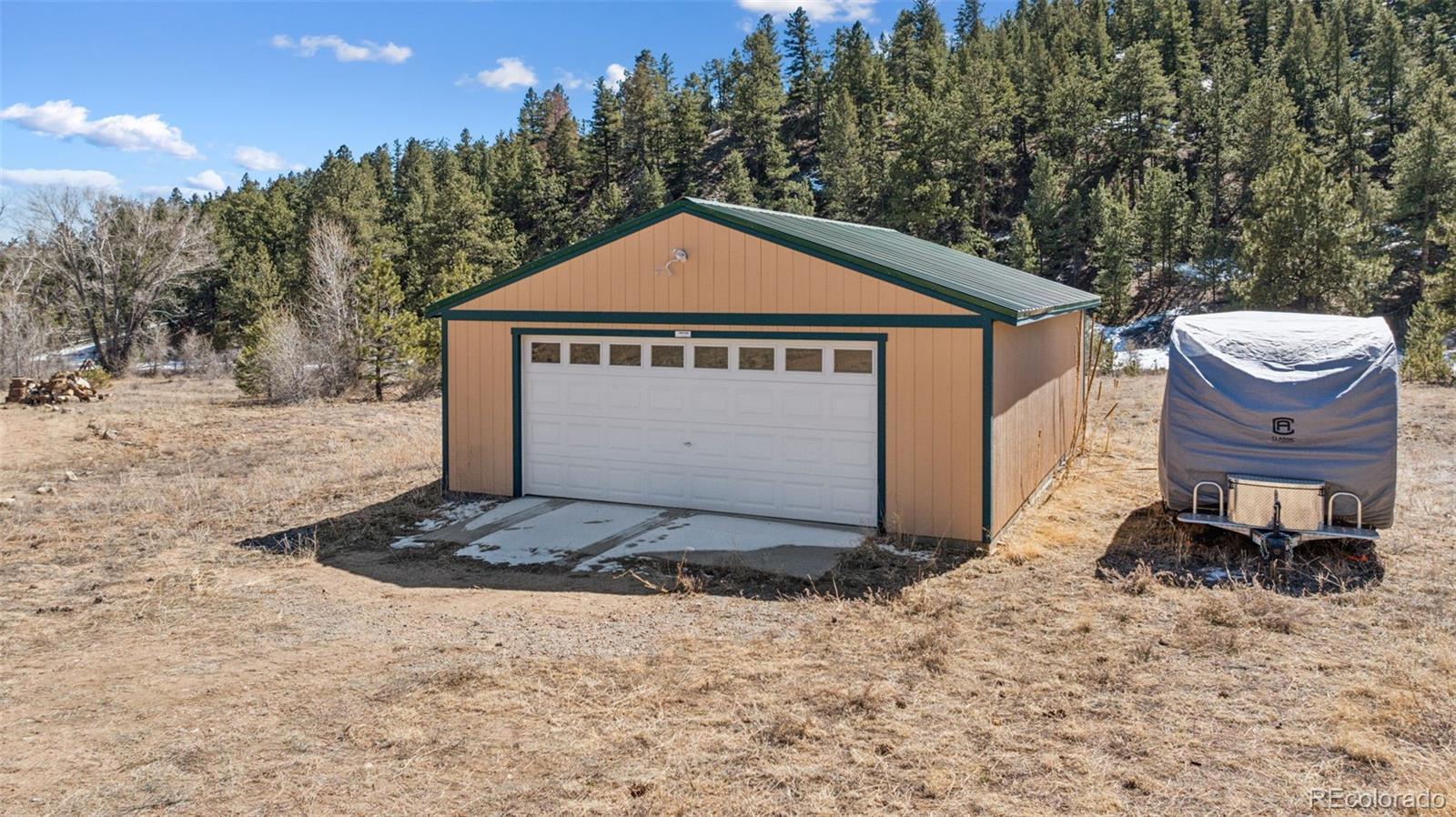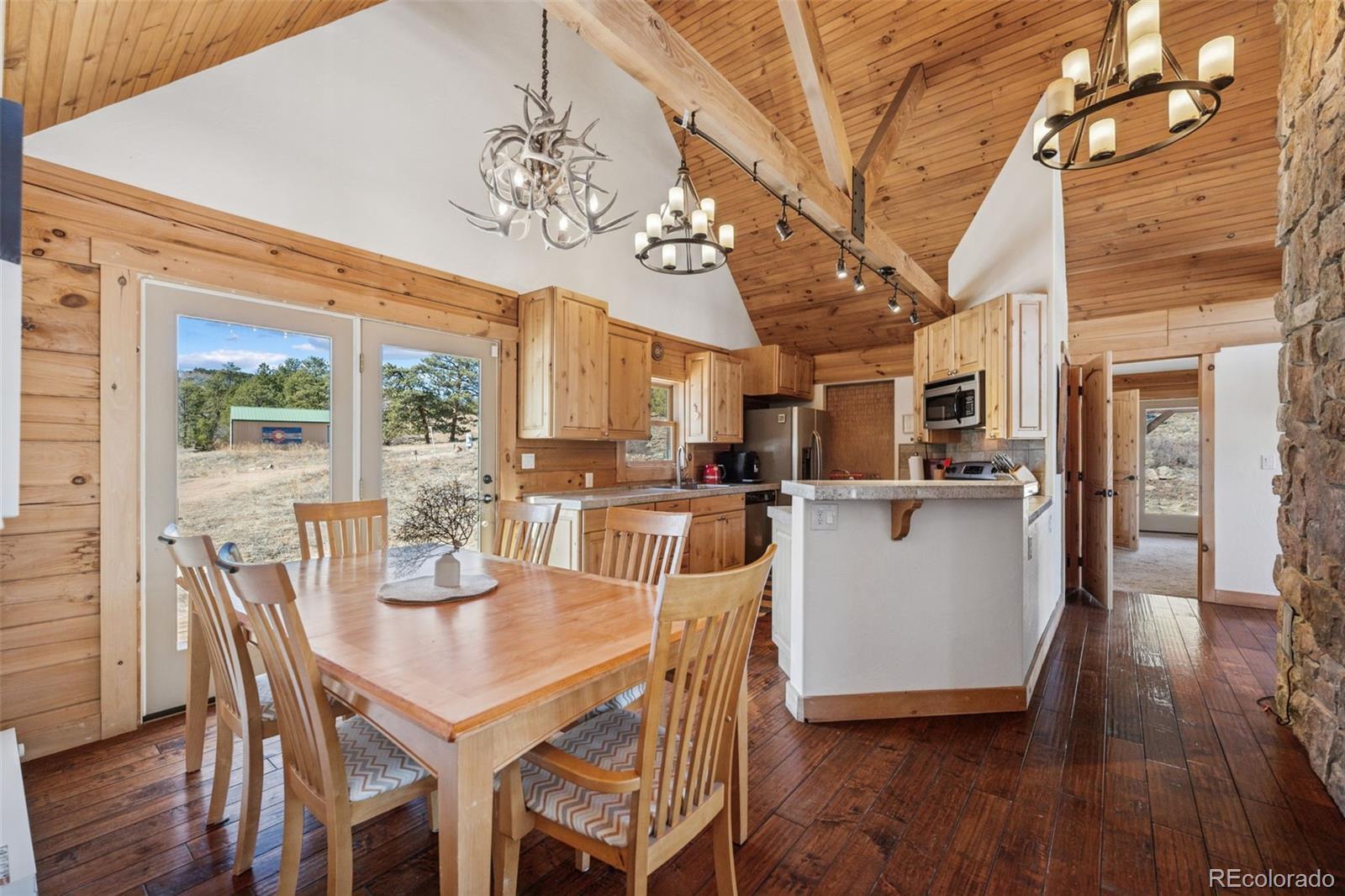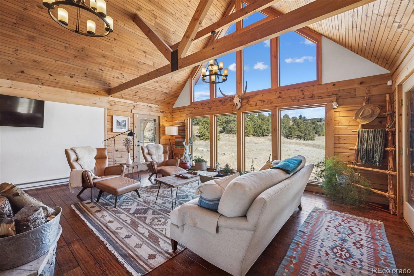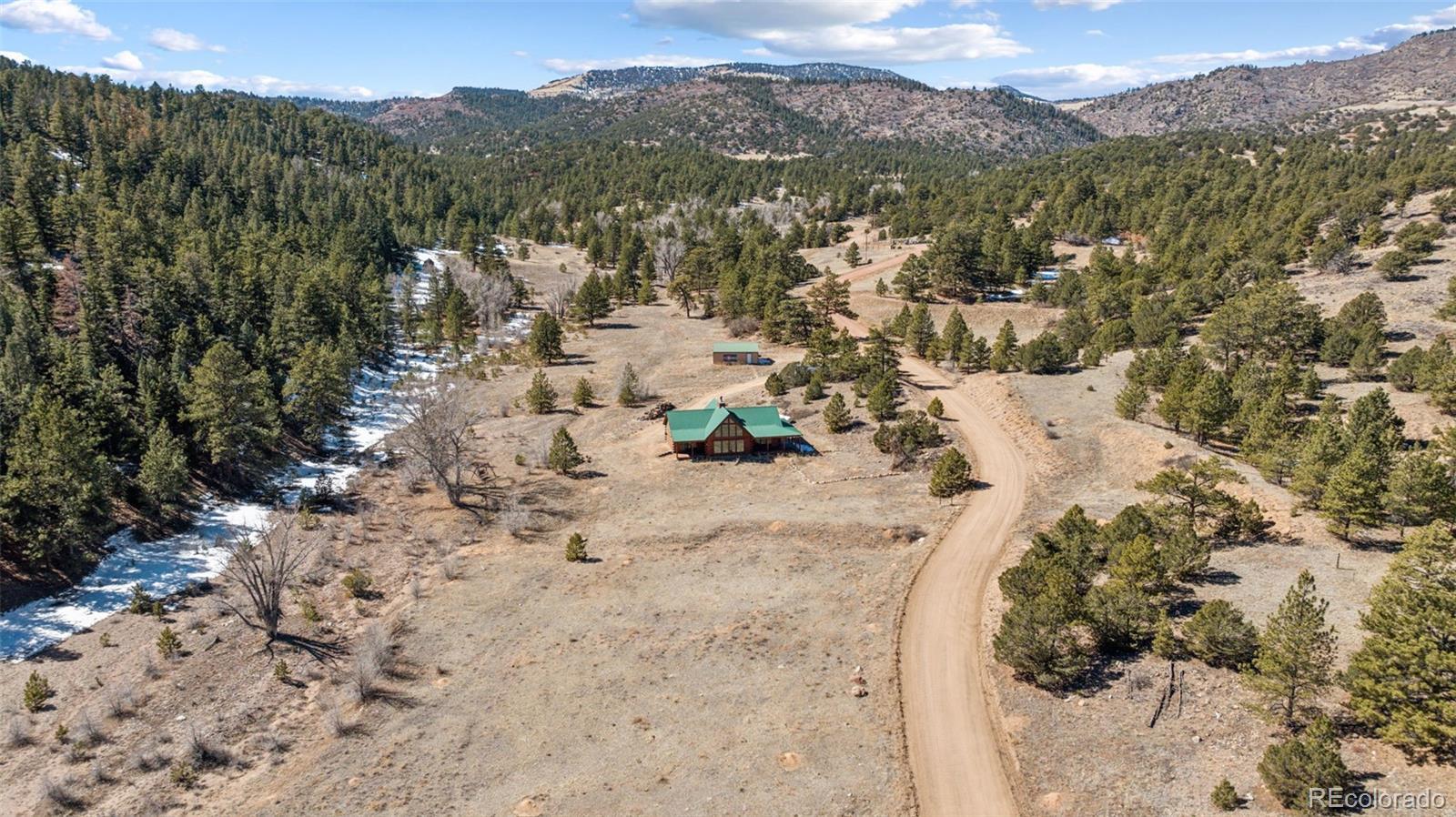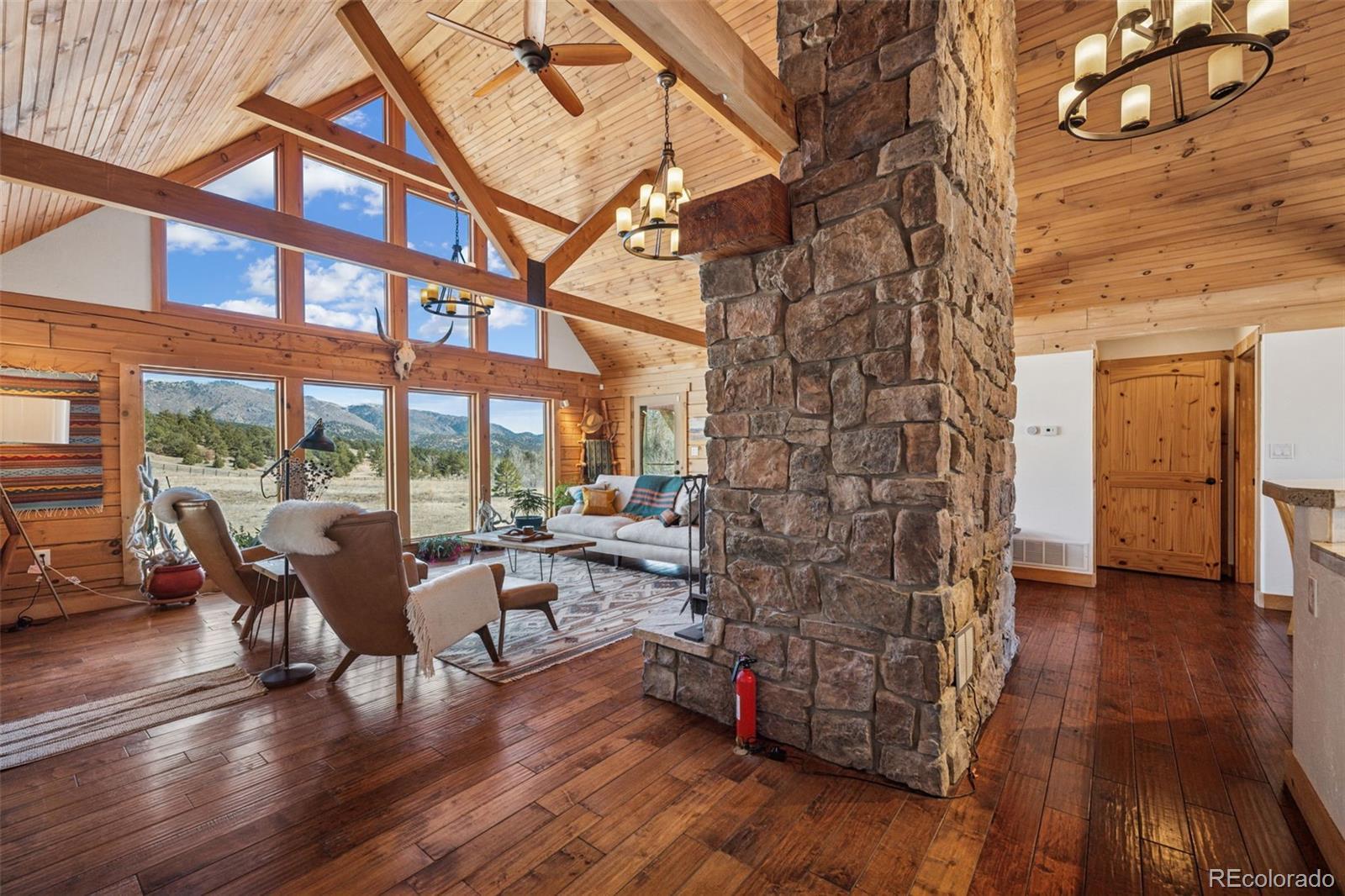 Modern Log Home on 35 Acres with Unmatched Views & Privacy. Nestled within a gated mountain subdivision, this modern log home offers the perfect blend of rustic charm and contemporary comfort—all set on an expansive 35-acre lot with panoramic views of forested mountain peaks and Colorado’s famously blue skies. With private access to thousands of acres of public BLM land, outdoor adventure is just steps away. Crafted with high-quality D-log construction, this home retains classic log cabin appeal while delivering the energy efficiency of modern design. Step inside to a warm, inviting living room with a soaring vaulted ceiling, cozy fireplace, and massive windows that frame awe-inspiring mountain views. The custom kitchen boasts granite countertops, stainless steel sink and appliances, and a spacious walk-in pantry/laundry room. The large primary bedroom suite is a true retreat, complete with a fully remodeled spa-like bathroom featuring a marble double vanity, a luxurious travertine tile shower, heated floors, and a heated towel rack. Guests will enjoy the comfort of the second bedroom with easy access to the beautifully updated main hall bathroom—also finished with travertine tile and marble accents. Recent upgrades include a gas forced air furnace, Cellphone booster, new ceiling fans, window blinds and a whole-house backup generator—ensuring comfort and peace of mind year-round. Step outside to enjoy over 430 sq ft of covered decking, plus an 8x24 rear deck with a motorized awning ideal for morning coffee or evening stargazing. Relax as you listen to wild turkeys in the spring and elk bugling in the fall, right from your deck. The property also features a 24x30 detached garage. Located just minutes from Cañon City and only 1.5 hours from Monarch and Breckenridge ski resorts. The ideal balance of seclusion, convenience, and year-round adventure.