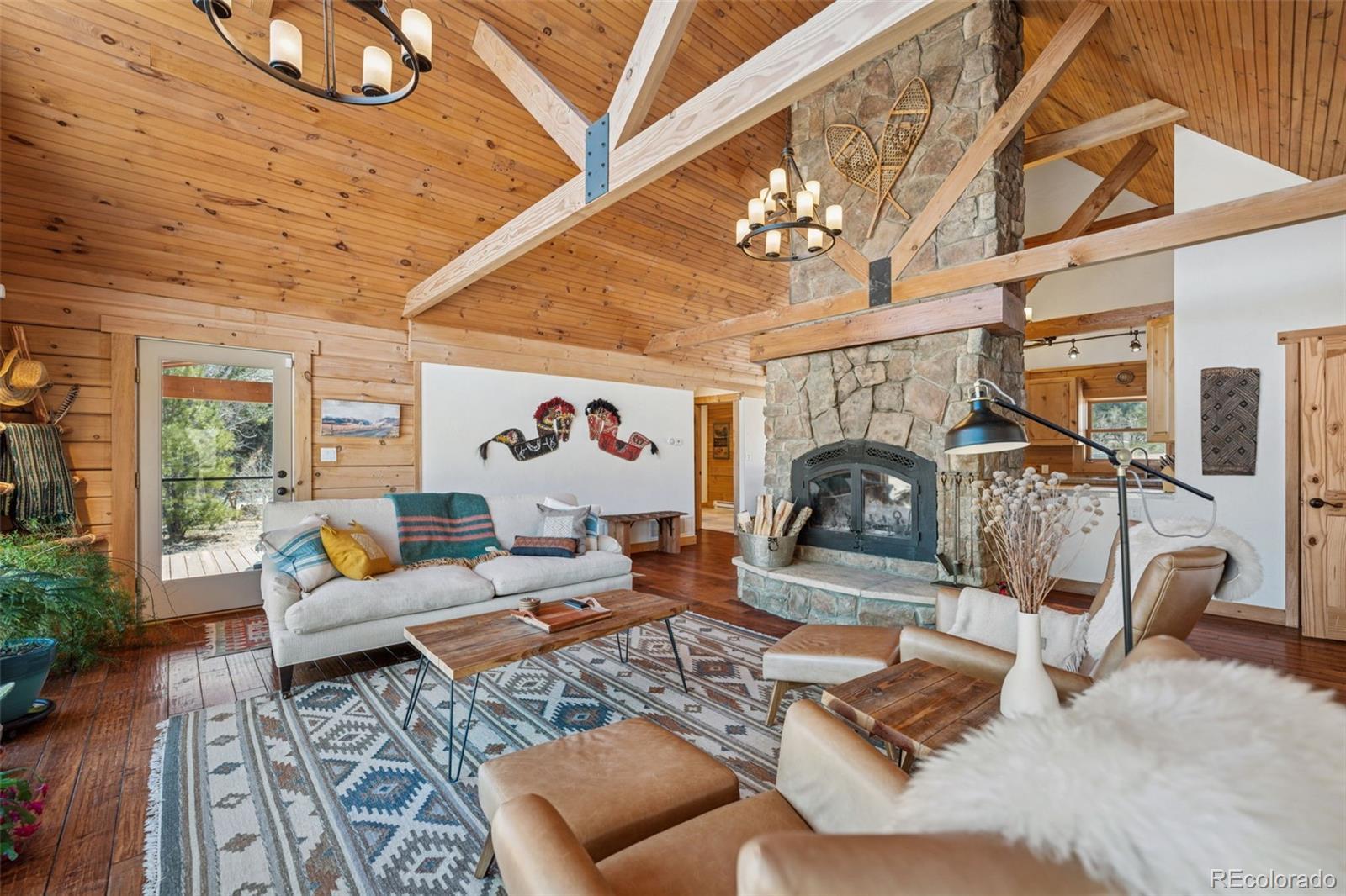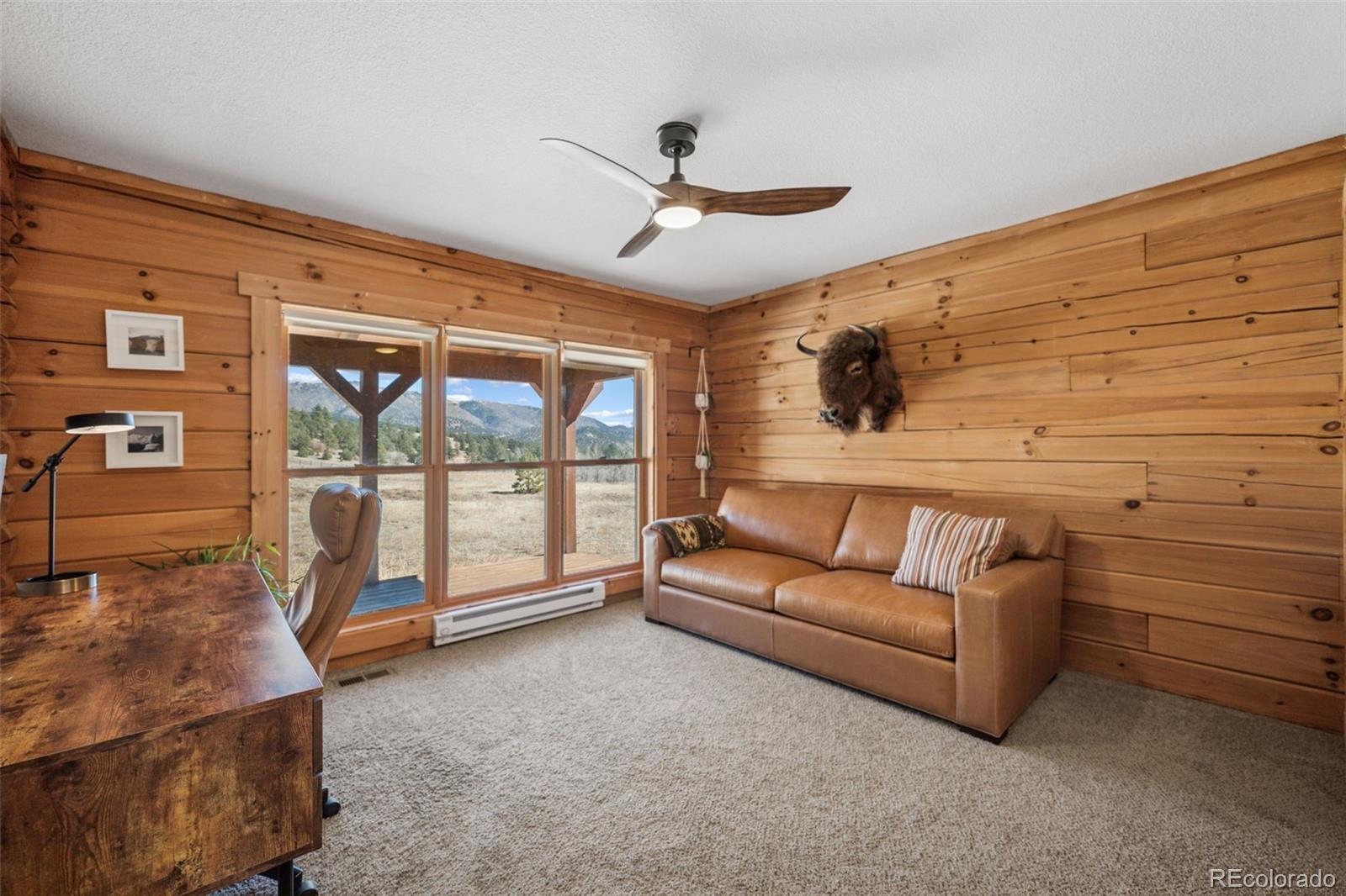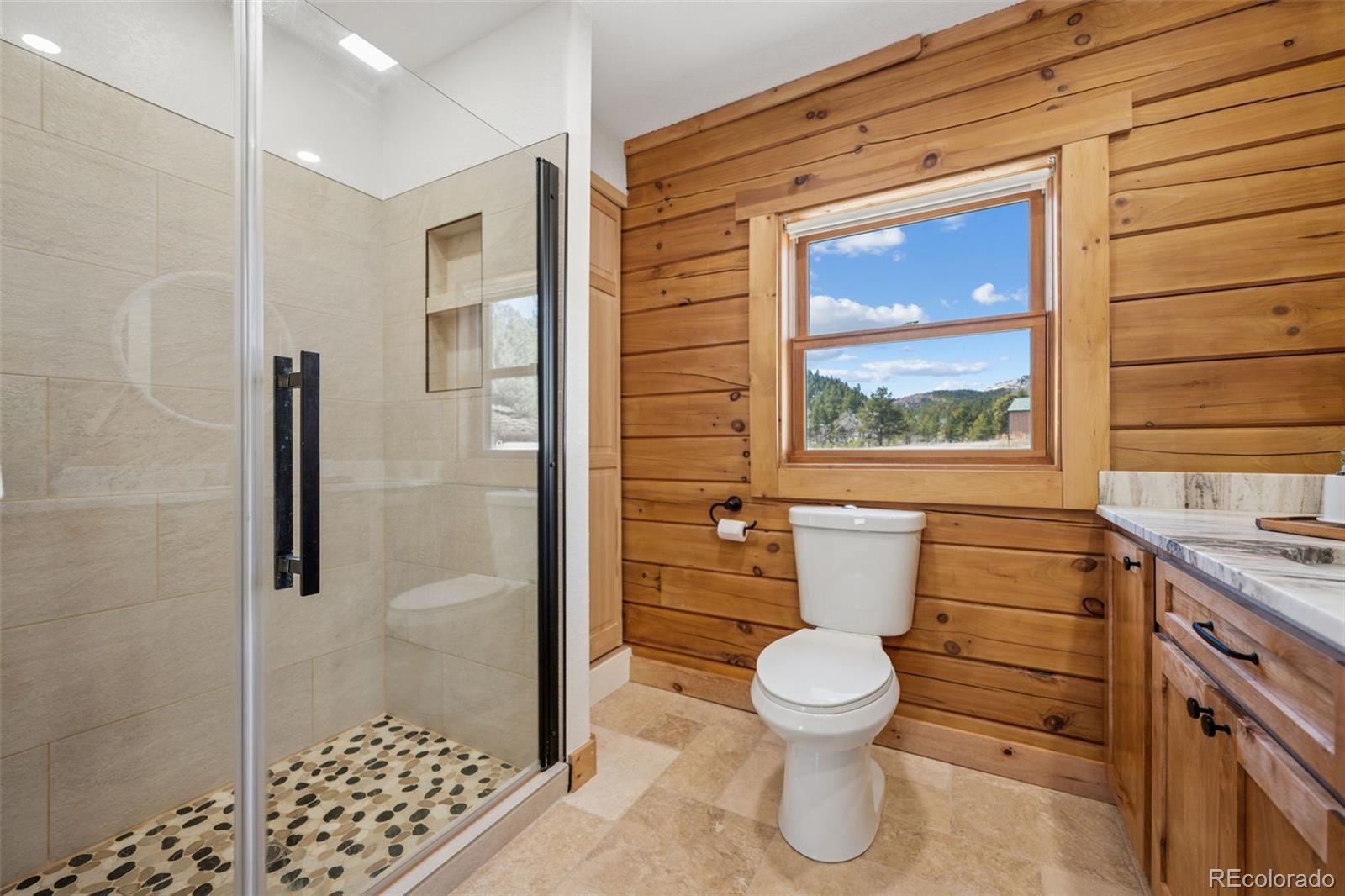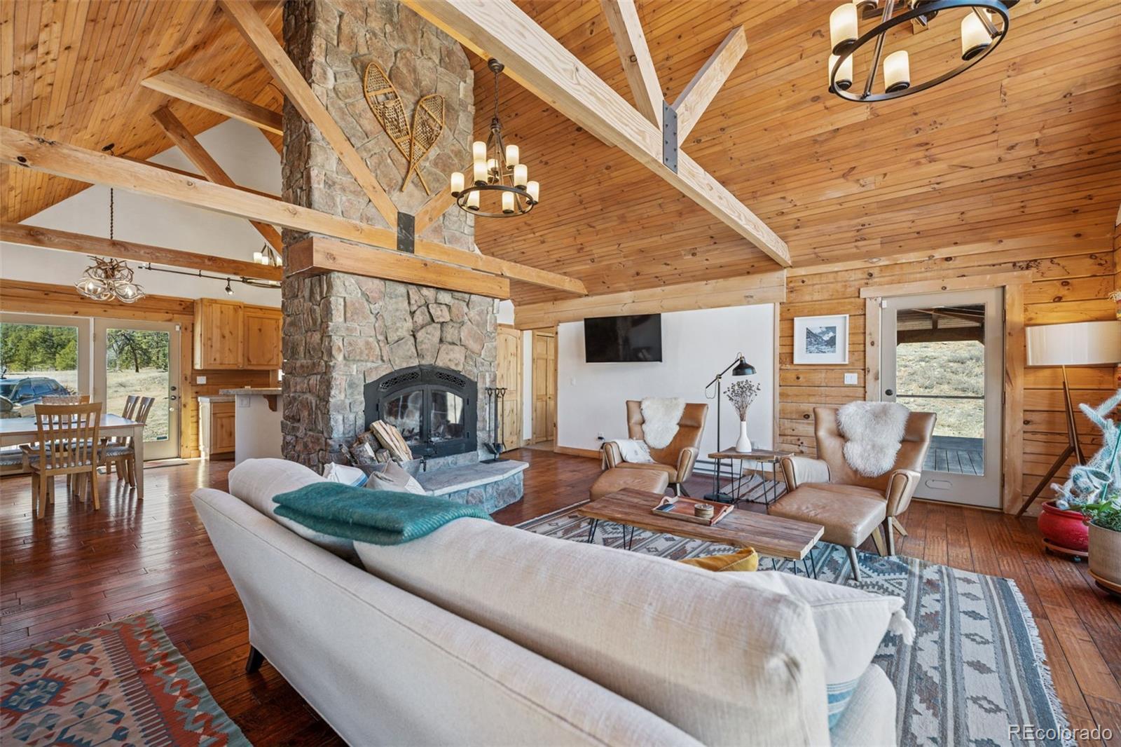Modern Log Home on 35 Acres with Unmatched Views & Privacy. Nestled within a gated mountain subdivision, this modern log home offers the perfect blend of rustic charm and contemporary comfort—all set on an expansive 35-acre lot with panoramic views of forested mountain peaks and Colorado’s famously blue skies. With private access to thousands of acres of public BLM land, outdoor adventure is just steps away. Crafted with high-quality D-log construction, this home retains classic log cabin appeal while delivering the energy efficiency of modern design. Step inside to a warm, inviting living room with a soaring vaulted ceiling, cozy fireplace, and massive windows that frame awe-inspiring mountain views. The custom kitchen boasts granite countertops, stainless steel sink and appliances, and a spacious walk-in pantry/laundry room. The large primary bedroom suite is a true retreat, complete with a fully remodeled spa-like bathroom featuring a marble double vanity, a luxurious travertine tile shower, heated floors, and a heated towel rack. Guests will enjoy the comfort of the second bedroom with easy access to the beautifully updated main hall bathroom—also finished with travertine tile and marble accents. Recent upgrades include a gas forced air furnace, Cellphone booster, new ceiling fans, window blinds and a whole-house backup generator—ensuring comfort and peace of mind year-round. Step outside to enjoy over 430 sq ft of covered decking, plus an 8x24 rear deck with a motorized awning ideal for morning coffee or evening stargazing. Relax as you listen to wild turkeys in the spring and elk bugling in the fall, right from your deck. The property also features a 24x30 detached garage. Located just minutes from Cañon City and only 1.5 hours from Monarch and Breckenridge ski resorts. The ideal balance of seclusion, convenience, and year-round adventure.
