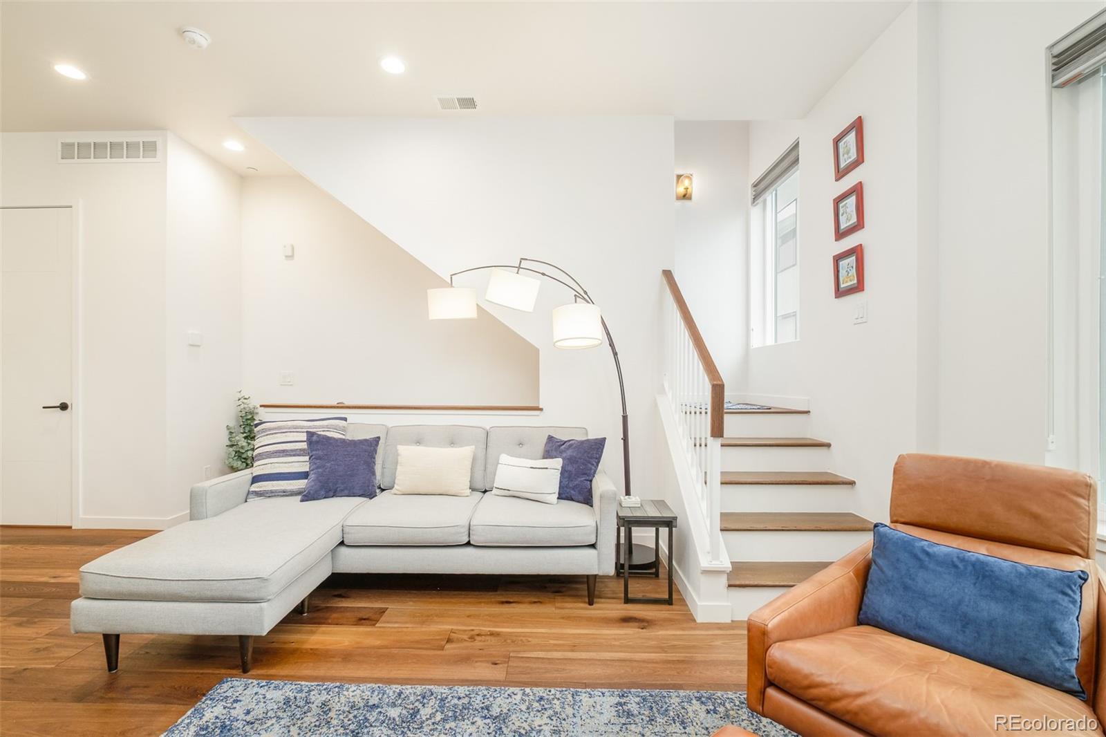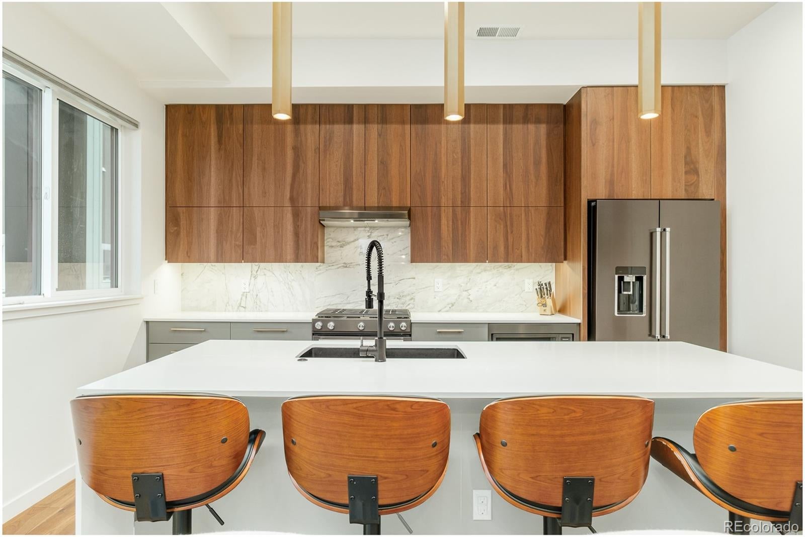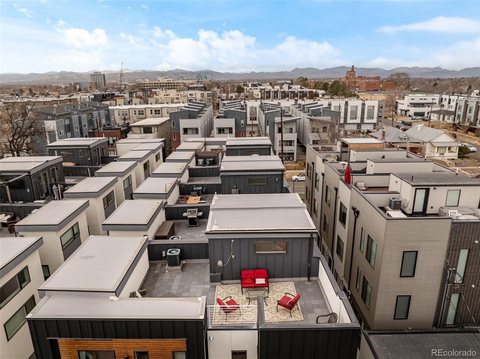 Elevated living awaits in this stunning Euro-inspired townhome, perfectly positioned in Sloan’s Lake just four blocks from the park. This striking residence exudes sophistication with a high-end finish package, showcasing wide plank wood floors, designer lighting, stylish tile and luxurious bathrooms. The chef’s kitchen boasts two-toned cabinetry, sleek quartz countertops, KitchenAid appliances, a waterfall island with seating, and beverage station with elegant shelving seamlessly connecting to a spacious living room grounded by a modern fireplace. The primary retreat offers restful relaxation with soaring ceilings, two closets, an en-suite bath featuring a dual vanity and a large walk-in shower. Unwind outdoors on one of three private covered balconies or soak in panoramic city and mountain views from the expansive rooftop deck. A convenient upper level laundry closet with a stackable washer and dryer set adds everyday ease. With a two-car attached garage and proximity to Sloan’s Lake Park, Empower Field at Mile High, Edgewater Market, Highlands Square, LoHi, Jefferson Park and downtown, this townhome perfectly blends urban convenience with refined design. **NO HOA. There is a party wall agreement in place. A maintenance company takes care of mowing the front area and snow removal for the community - currently $91/month.