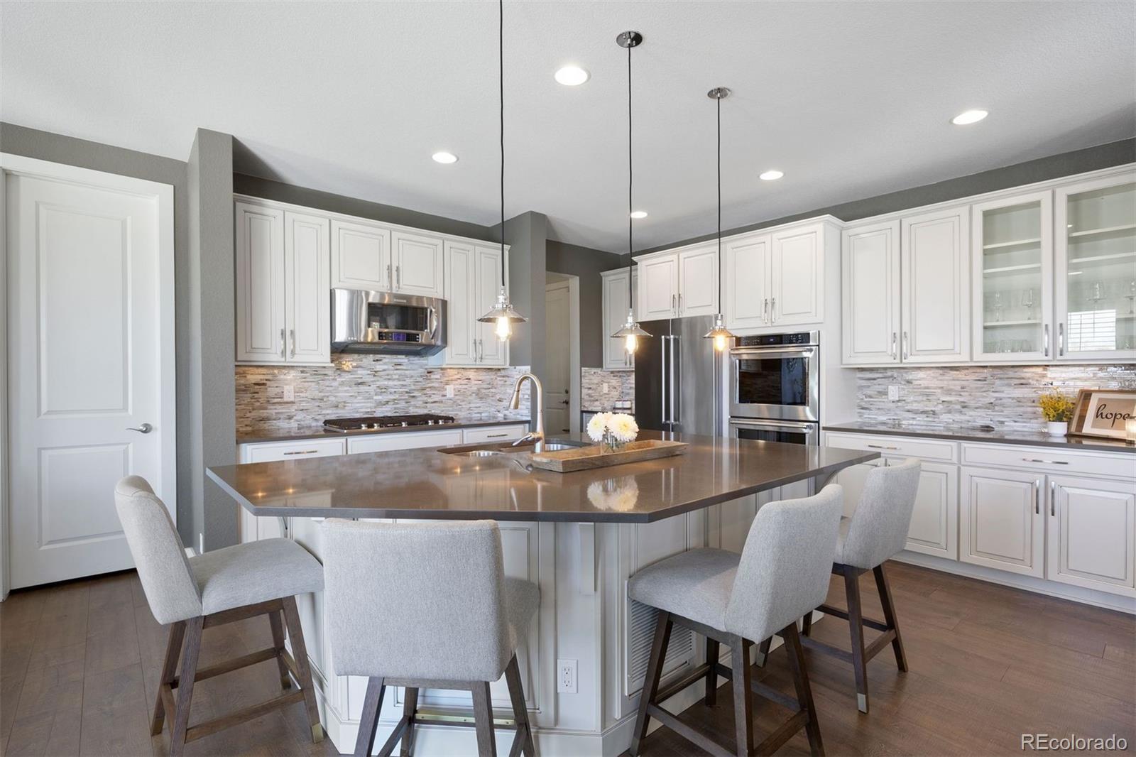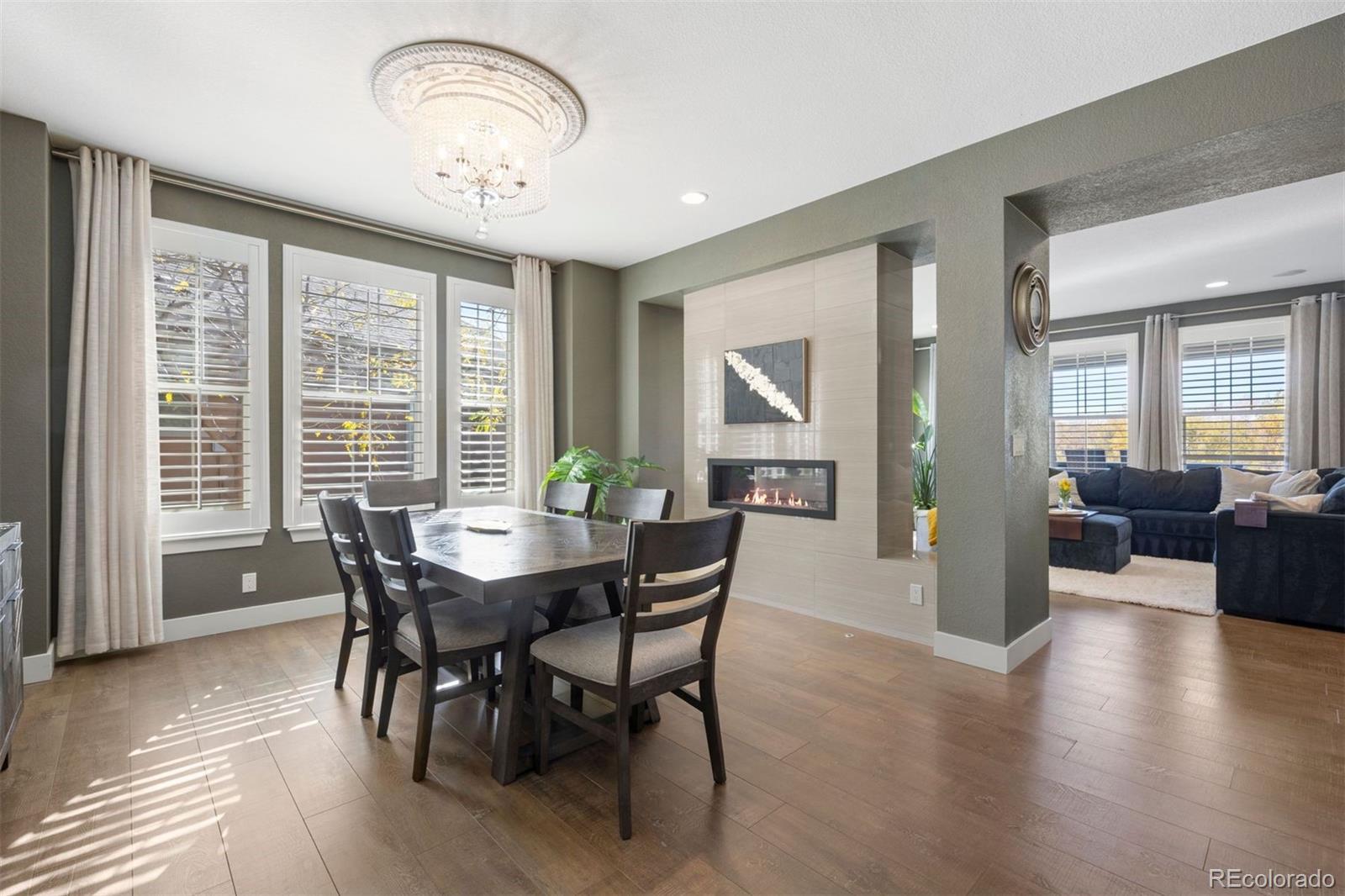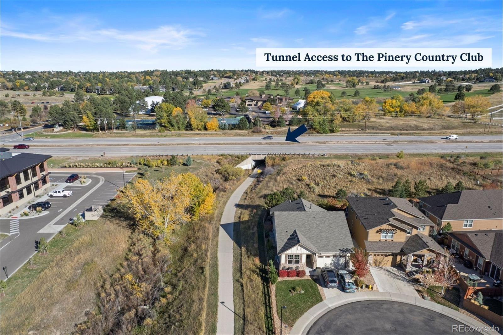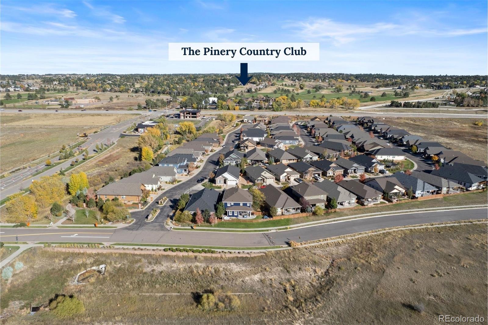 Wake up to mountain views and the serenity of open space just beyond your backyard in this stunning former model home located in the gated community of Pinery West! This home blends luxury and livability, featuring a chef-inspired kitchen, dedicated office, theater room, 3-car garage, and unforgettable Colorado sunsets. The kitchen showcases upgraded cabinetry, quartz countertops, double ovens, gas cooktop, wine fridge, a large center island, and a walk-in pantry. It opens to the inviting living room with a dual-sided fireplace that extends into the show-stopping dining room anchored by a beautiful crystal chandelier. Upstairs, the spacious primary suite offers dual walk-in closets and a luxurious 5-piece spa-inspired bathroom. Two additional bedrooms, a loft, and the laundry room complete the upper level. Throughout the home, you’ll find built-in speakers, upgraded finishes, and a dual-zone HVAC system for year-round comfort. The finished basement is designed for entertainment and includes a 4th bedroom (theater room), home gym, full bathroom, and a large game area with custom bar. The insulated, heated 3-car tandem garage offers a hot and cold interior faucet and abundant storage. Outdoors, relax or entertain on the covered patio and enjoy the hot tub overlooking mature trees along the Cherry Creek Trail. Golf cart access connects directly to The Pinery Country Club just minutes from door to door. This exceptional home offers the very best in comfort, design, and lifestyle.