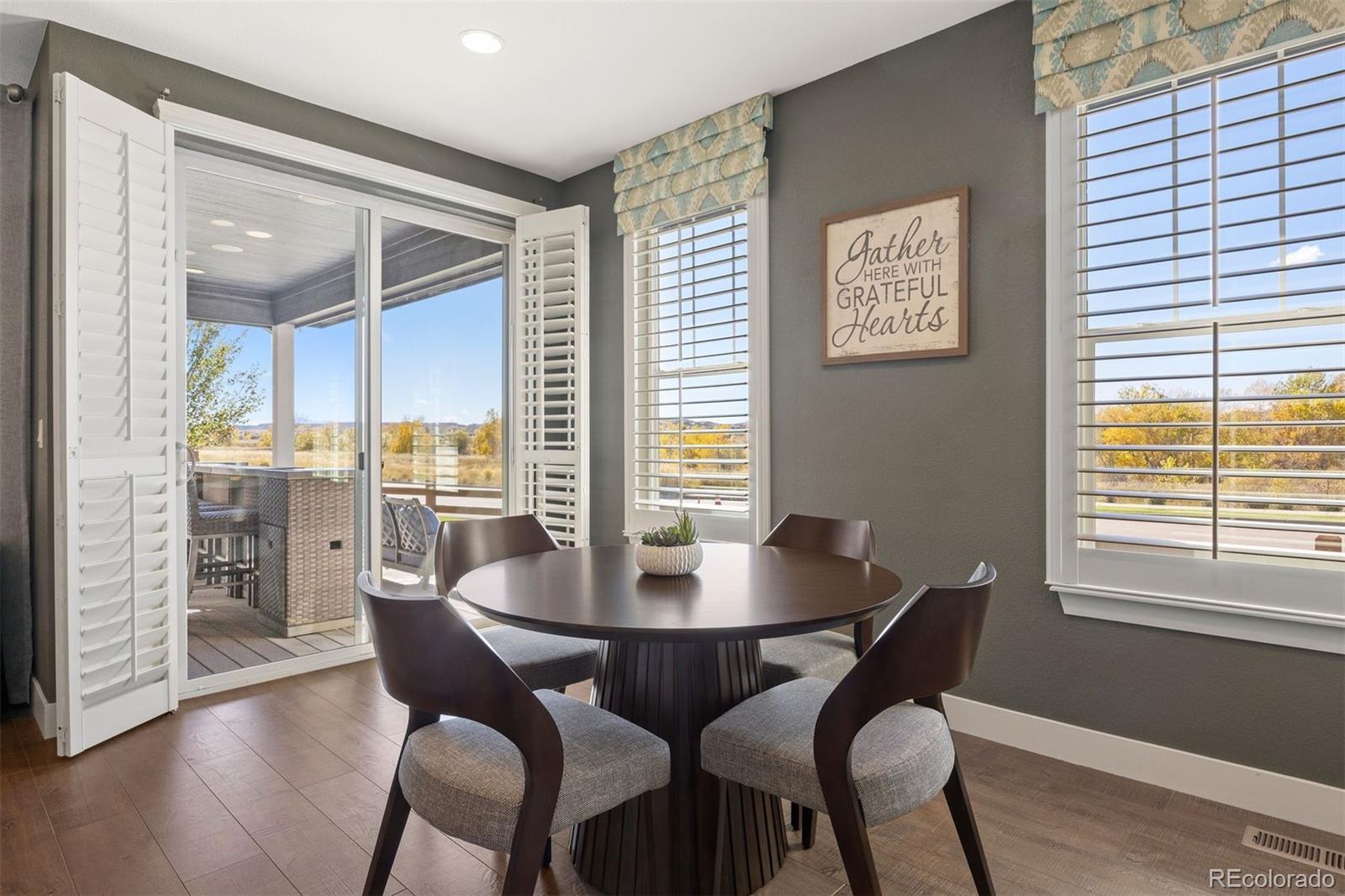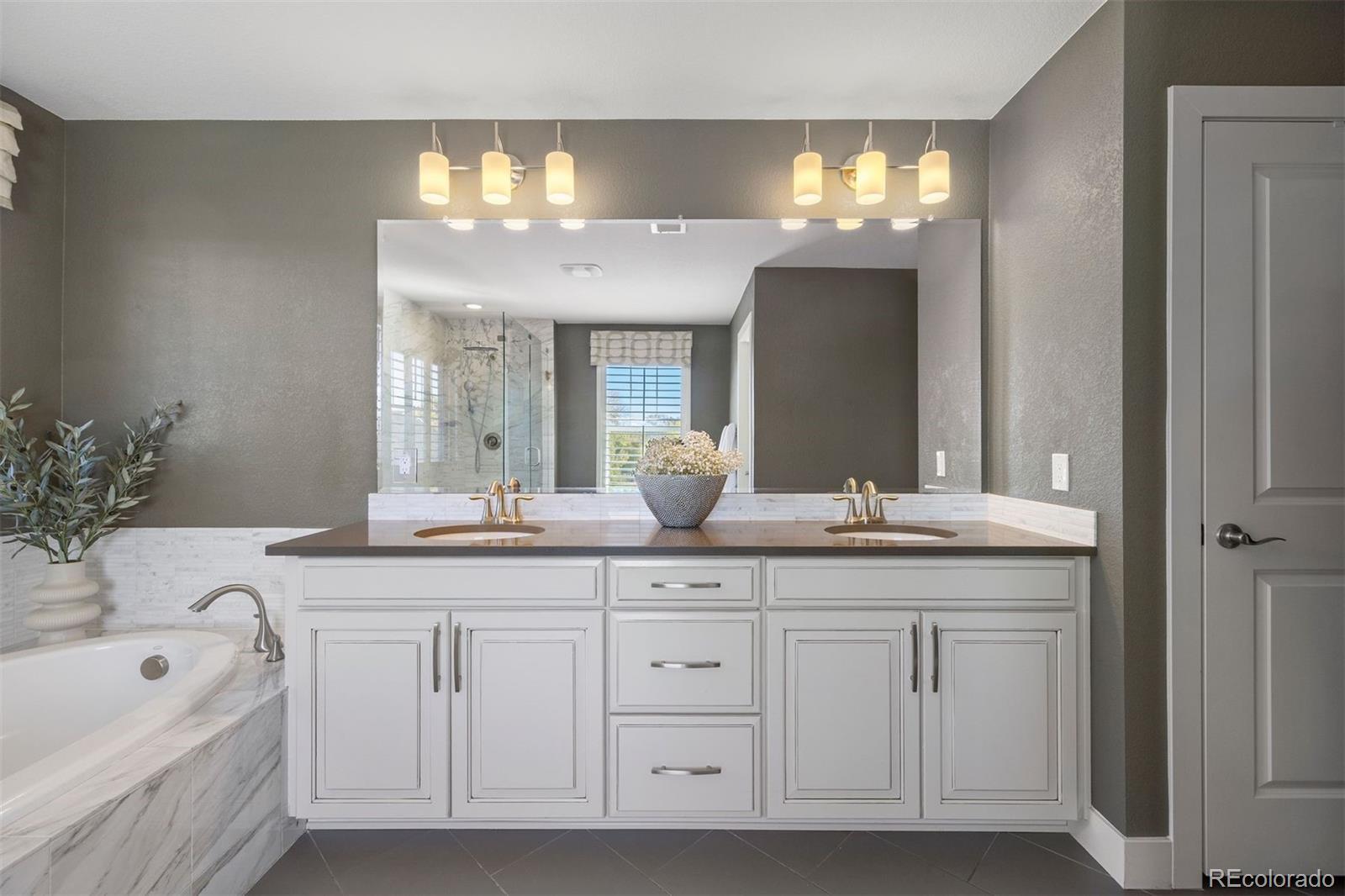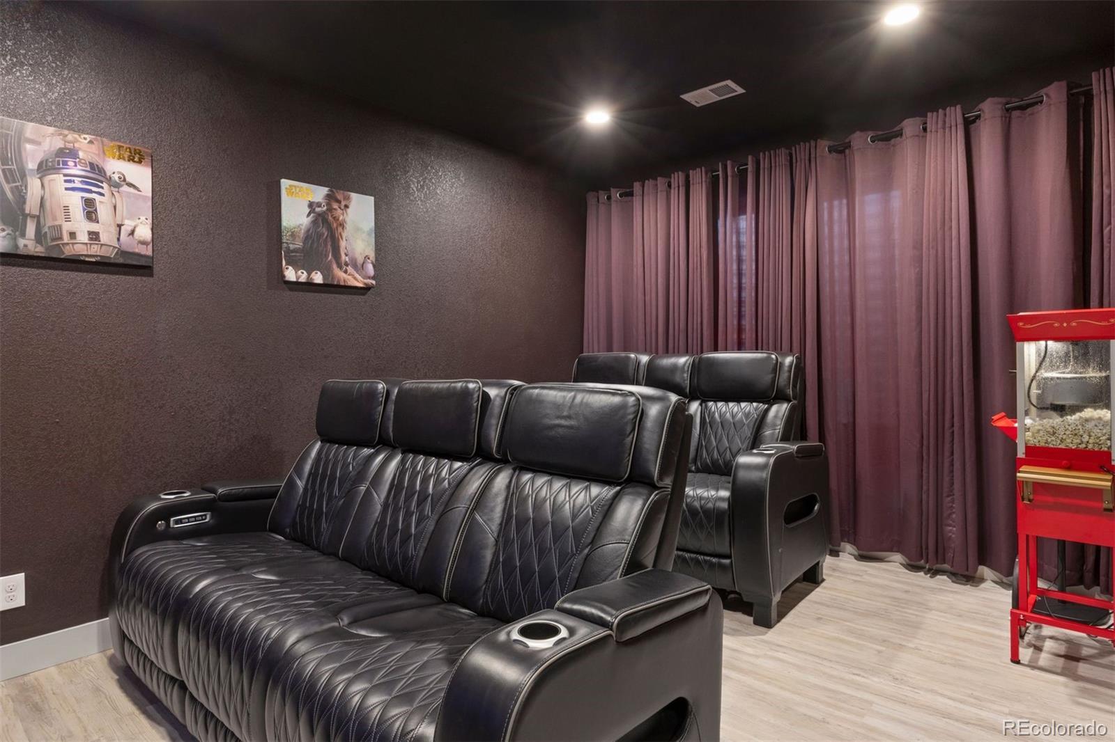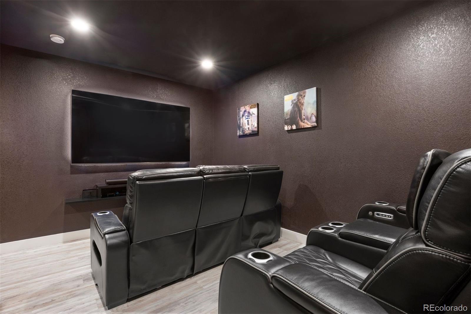 Wake up to mountain views and the serenity of open space just beyond your backyard in this stunning former model home located in the gated community of Pinery West! This home blends luxury and livability, featuring a chef-inspired kitchen, dedicated office, theater room, 3-car garage, and unforgettable Colorado sunsets. The kitchen showcases upgraded cabinetry, quartz countertops, double ovens, gas cooktop, wine fridge, a large center island, and a walk-in pantry. It opens to the inviting living room with a dual-sided fireplace that extends into the show-stopping dining room anchored by a beautiful crystal chandelier. Upstairs, the spacious primary suite offers dual walk-in closets and a luxurious 5-piece spa-inspired bathroom. Two additional bedrooms, a loft, and the laundry room complete the upper level. Throughout the home, you’ll find built-in speakers, upgraded finishes, and a dual-zone HVAC system for year-round comfort. The finished basement is designed for entertainment and includes a 4th bedroom (theater room), home gym, full bathroom, and a large game area with custom bar. The insulated, heated 3-car tandem garage offers a hot and cold interior faucet and abundant storage. Outdoors, relax or entertain on the covered patio and enjoy the hot tub overlooking mature trees along the Cherry Creek Trail. Golf cart access connects directly to The Pinery Country Club just minutes from door to door. This exceptional home offers the very best in comfort, design, and lifestyle.