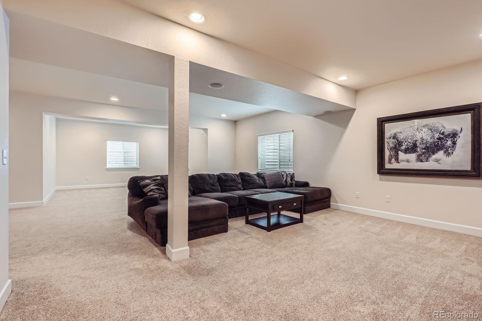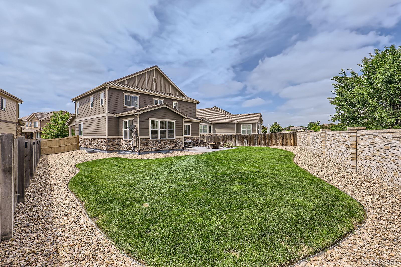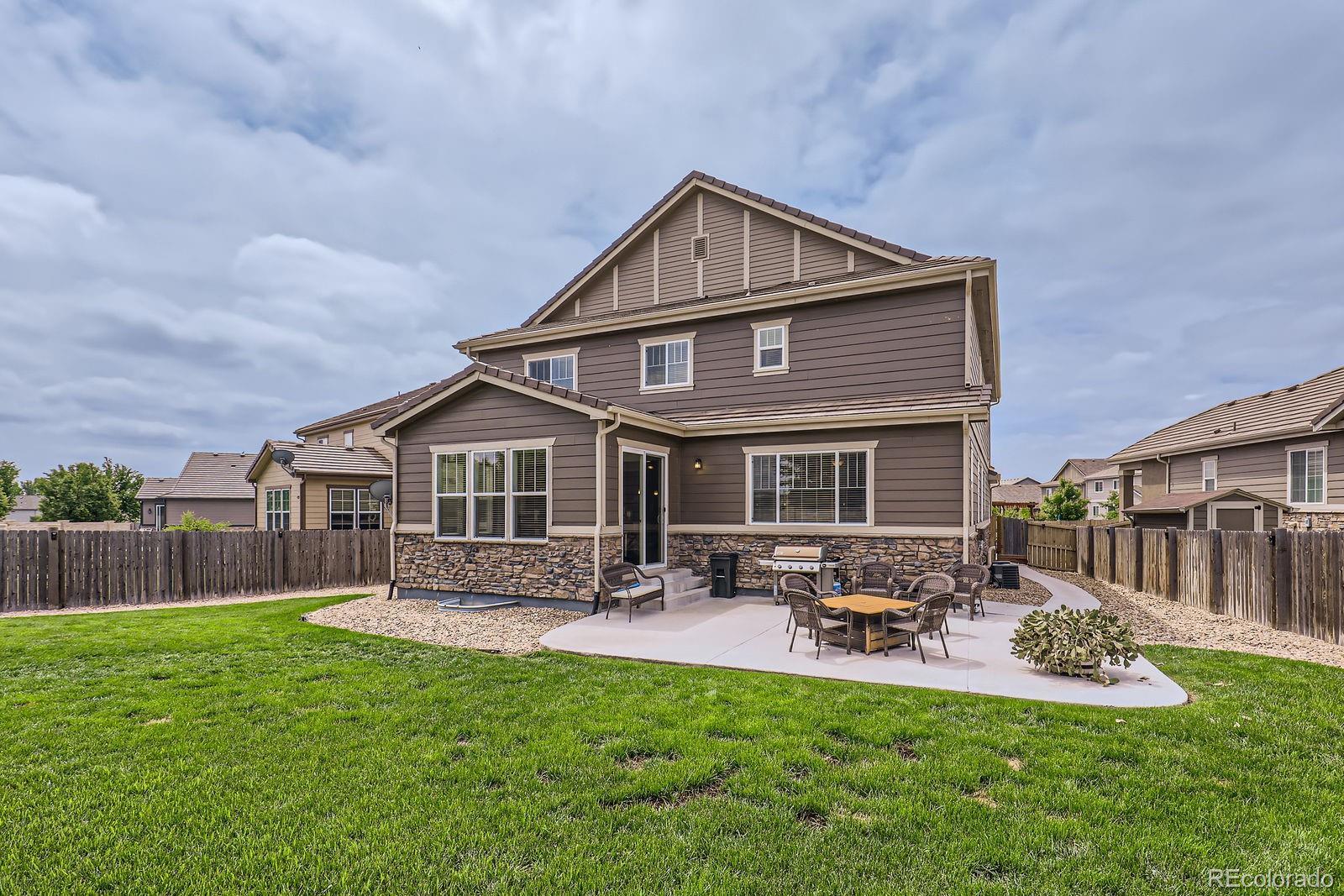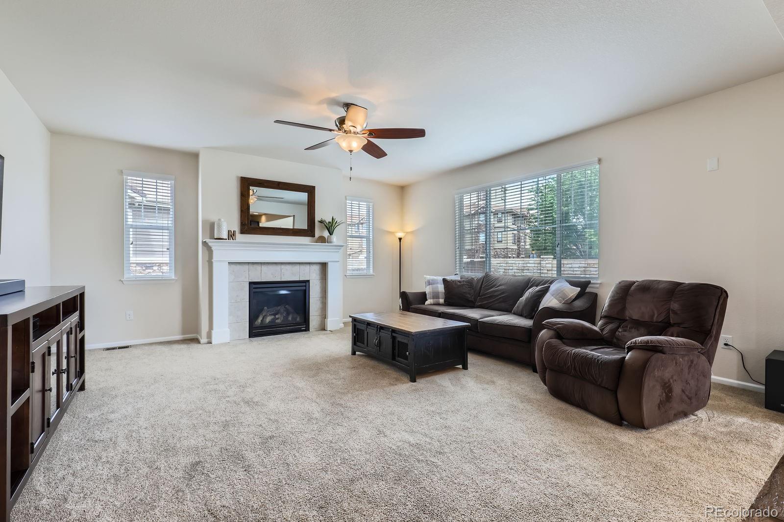 Spacious and beautifully maintained, this six-bedroom, four-bathroom home in Thornton’s Bramming Farm neighborhood offers 4,612 finished square feet of living space, including a finished basement and oversized three-car garage. Offering flexibility, comfort, and thoughtful design throughout. The main level welcomes you with a grand entryway that flows into a formal seating area. The heart of the home is an open-concept kitchen featuring a walk-in pantry, granite countertops, and stainless steel appliances, all centered around an extended island. The kitchen flows seamlessly into a sunlit living room with a cozy gas fireplace and continues to the dining area, which overlooks the generous backyard and patio, making it perfect for everyday living or entertaining. A private office and powder bath on the same floor add functionality and flexibility to the layout. Upstairs, a spacious loft provides a second living area, ideal for work or play. On one side, the primary suite features two walk-in closets and a luxurious five-piece bath. On the other, three secondary bedrooms share a full bathroom, conveniently located near the laundry room. The finished basement offers high ceilings, full egress windows, and a wide-open layout that easily accommodates a media room, game space, or home gym. A guest bedroom and three-quarter bath with dual access make this level ideal for visitors or extended stays. Tucked into a quiet neighborhood near the community park and playground with easy access to major highways and the N Line light rail, this home delivers space, style, and everyday comfort in one welcoming package.
