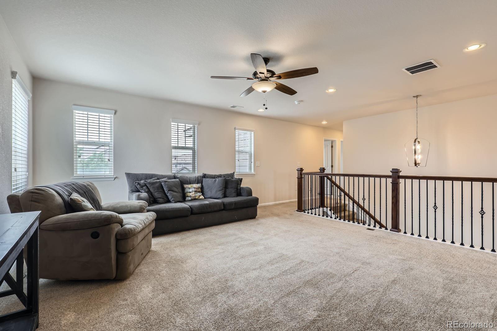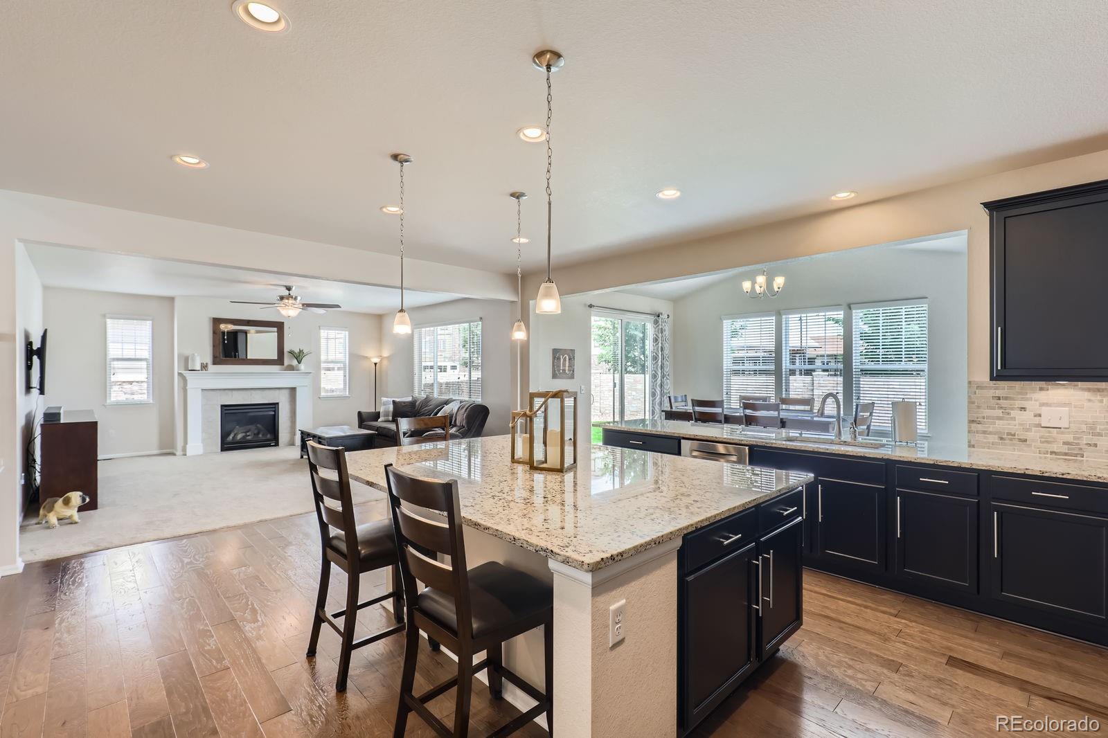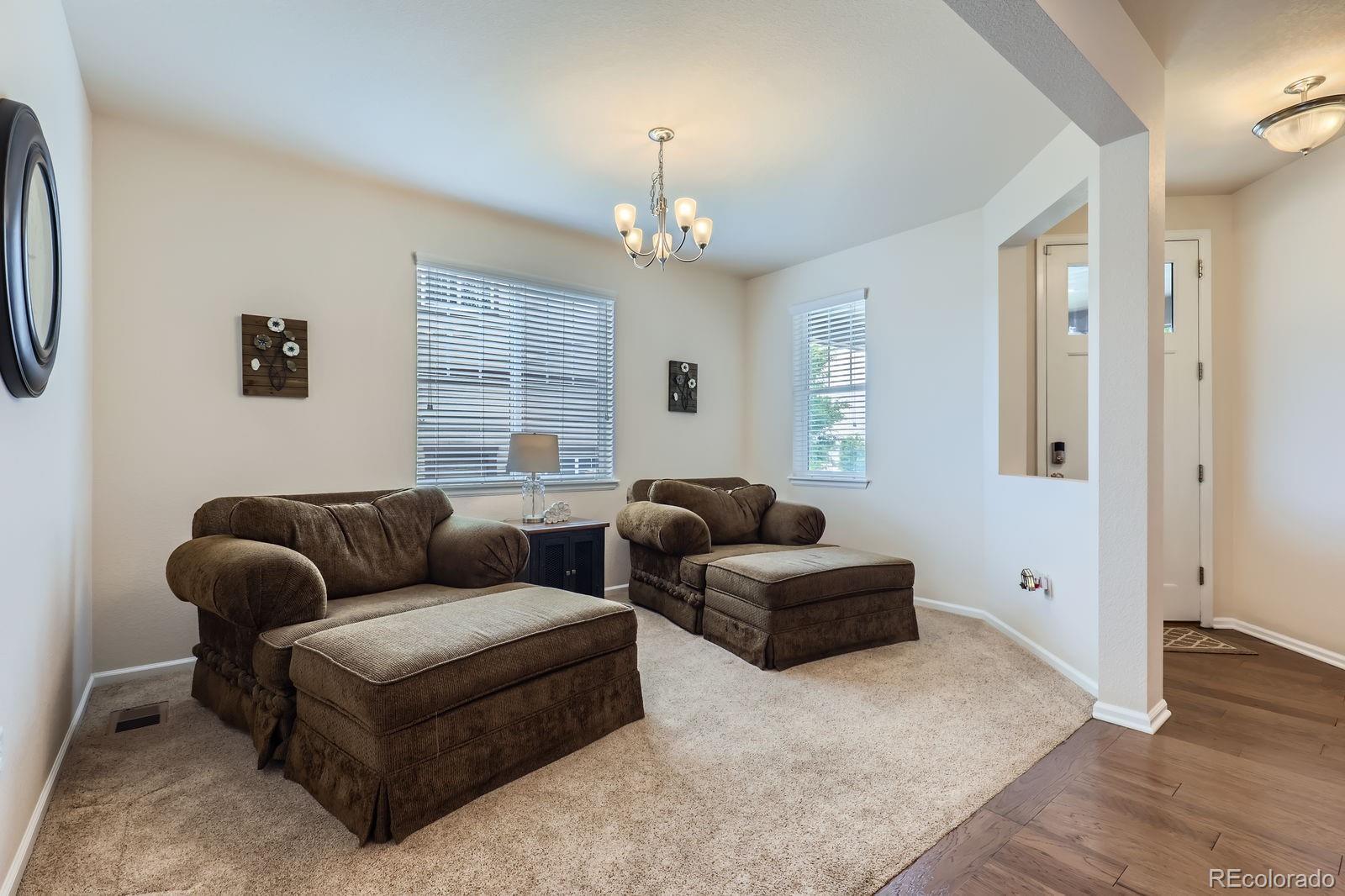 Spacious and beautifully maintained, this six-bedroom, four-bathroom home in Thornton’s Bramming Farm neighborhood offers 4,612 finished square feet of living space, including a finished basement and oversized three-car garage. Offering flexibility, comfort, and thoughtful design throughout. The main level welcomes you with a grand entryway that flows into a formal seating area. The heart of the home is an open-concept kitchen featuring a walk-in pantry, granite countertops, and stainless steel appliances, all centered around an extended island. The kitchen flows seamlessly into a sunlit living room with a cozy gas fireplace and continues to the dining area, which overlooks the generous backyard and patio, making it perfect for everyday living or entertaining. A private office and powder bath on the same floor add functionality and flexibility to the layout. Upstairs, a spacious loft provides a second living area, ideal for work or play. On one side, the primary suite features two walk-in closets and a luxurious five-piece bath. On the other, three secondary bedrooms share a full bathroom, conveniently located near the laundry room. The finished basement offers high ceilings, full egress windows, and a wide-open layout that easily accommodates a media room, game space, or home gym. A guest bedroom and three-quarter bath with dual access make this level ideal for visitors or extended stays. Tucked into a quiet neighborhood near the community park and playground with easy access to major highways and the N Line light rail, this home delivers space, style, and everyday comfort in one welcoming package.