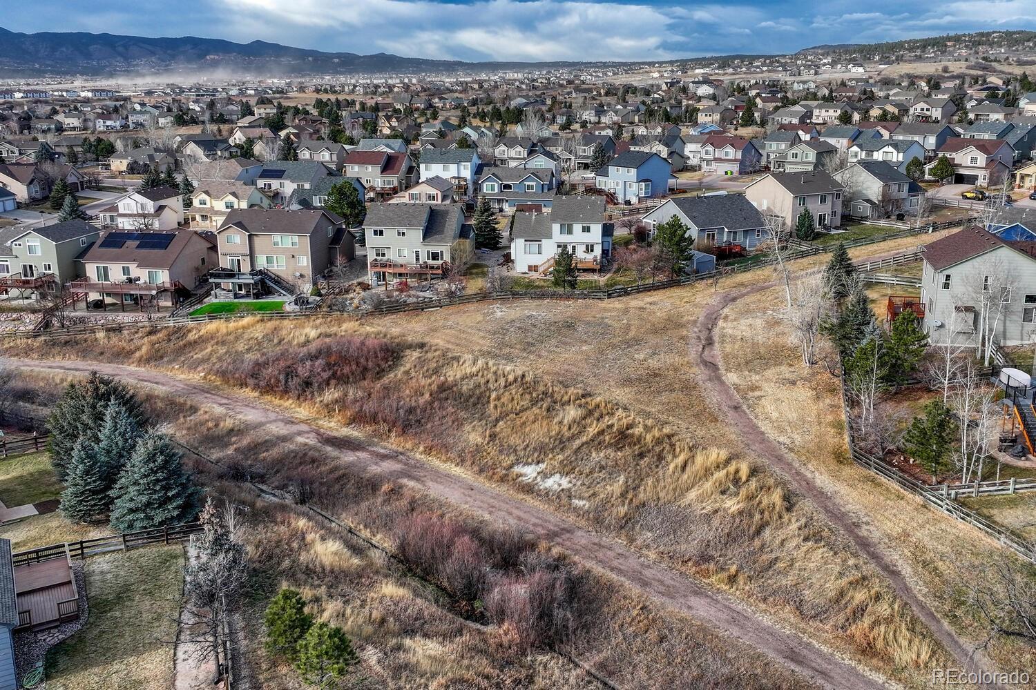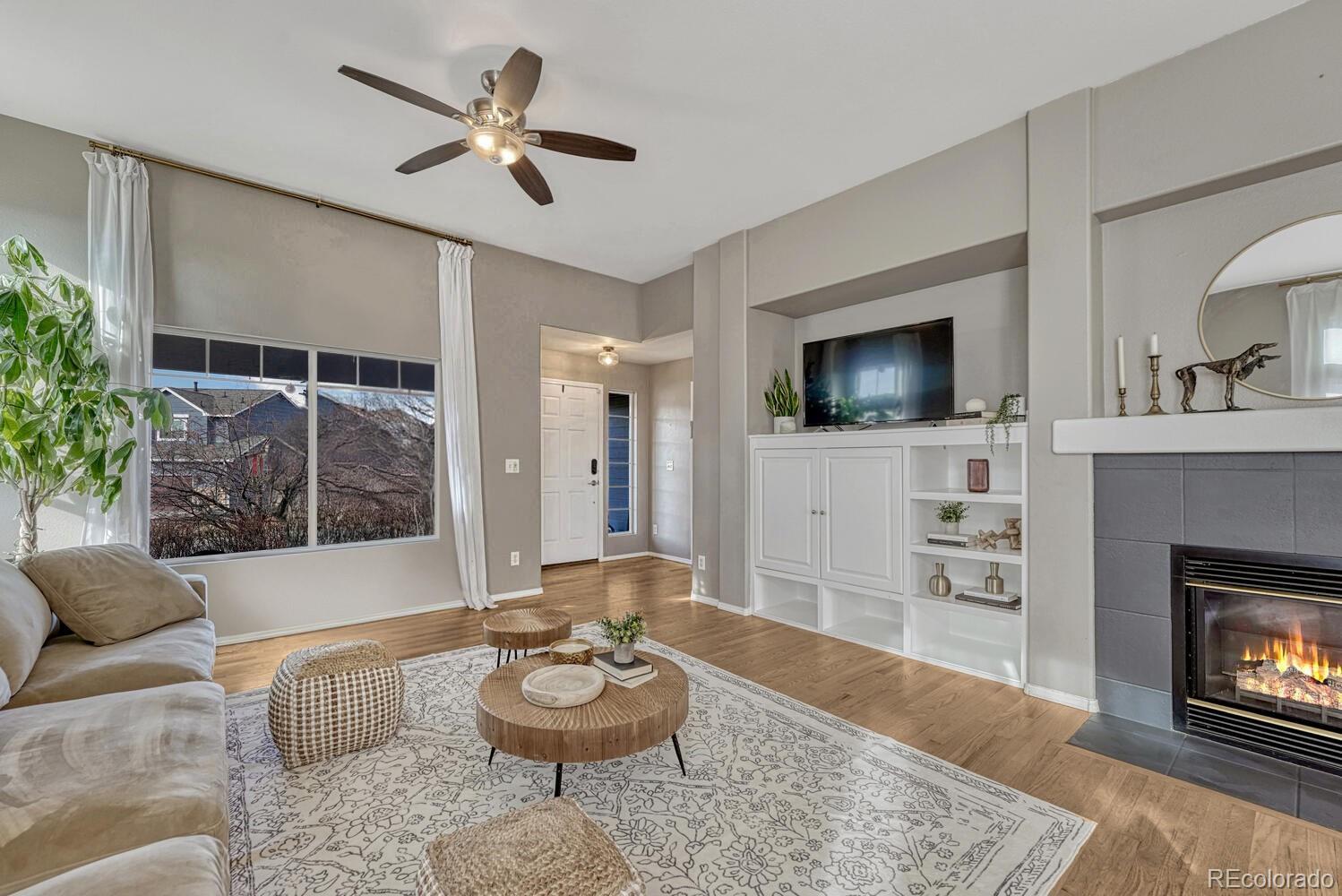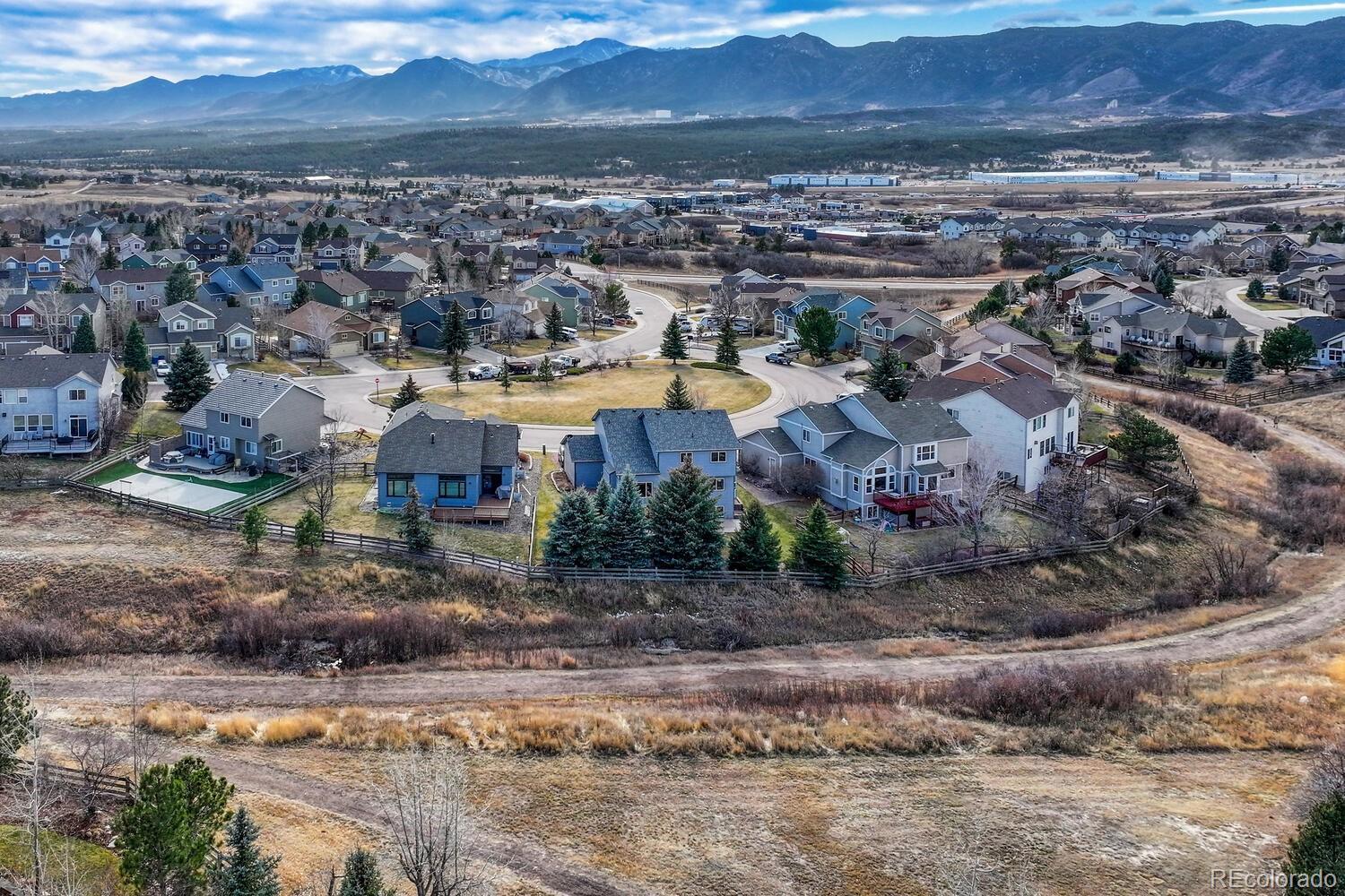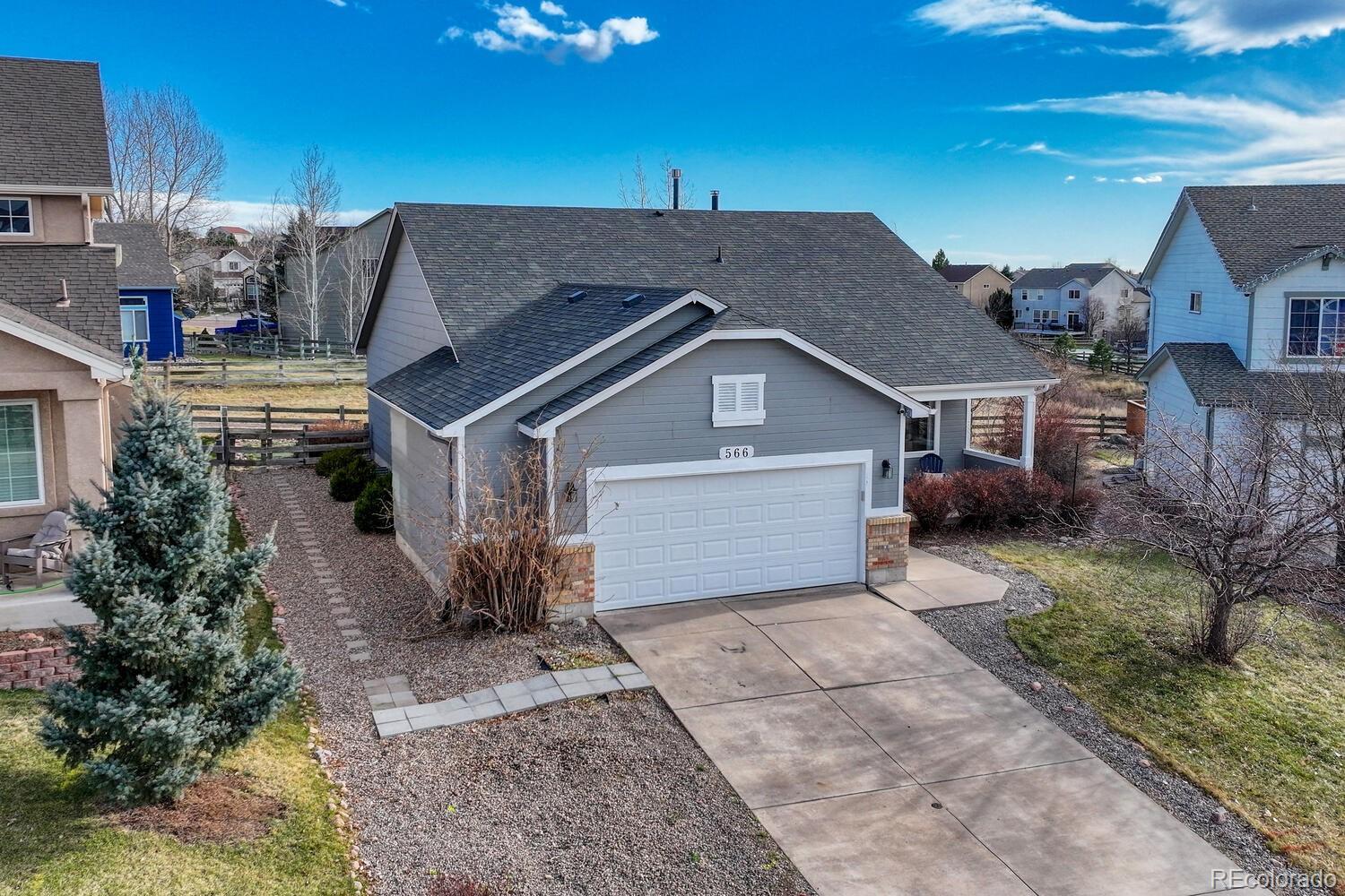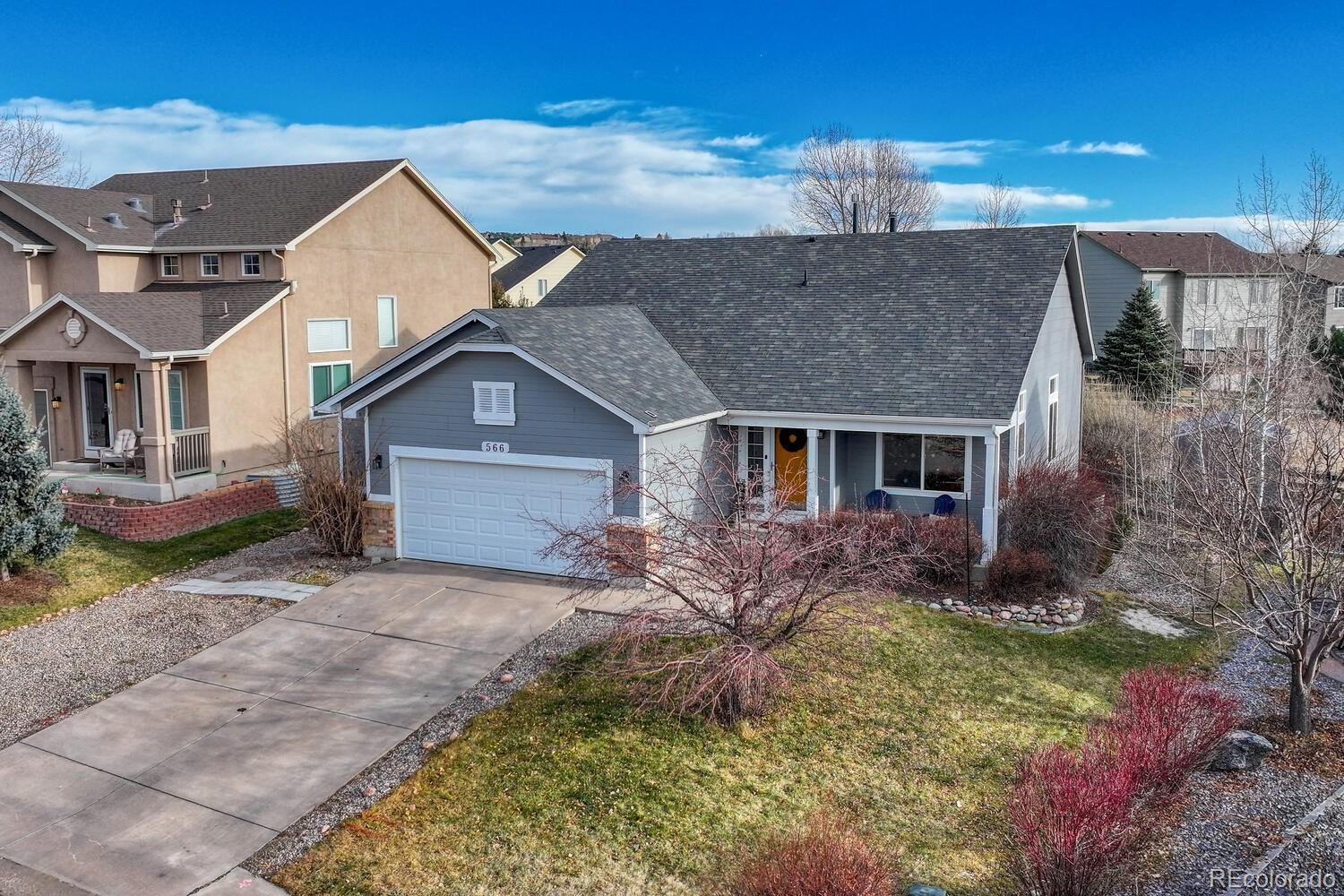 Welcome to lovely main-level living in the coveted Jackson Creek neighborhood, backing up to open space & a walking trail with stunning mountain views from the back porch. This impressive home features 5 bedrooms, 3 bathrooms & a 2 car attached garage. Step inside to a bright, open living room with tall ceilings. Oak wood floors & a wall of built-in shelving accent a gas fireplace painted in chic charcoal grey. The open-concept main level flows effortlessly from living room to dining room to kitchen. The remodeled kitchen features stainless steel appliances, a large farmhouse sink, pantry, two-toned cabinets & a large butcher block island. Walkout patio doors off the kitchen lead to a peaceful deck with mountain views! The backyard backs to open space & a trail system, offering peace and privacy from neighbors. Newly installed hybrid grass turf provides the perfect spot for pets or kids to play. A storage shed painted to match the house can be used for extra storage. Down the hall, discover the spacious main-level primary suite. It offers charming wainscoting trim & a wall of built-in shelving with a window seat. The ensuite bathroom has been upgraded with a huge walk-in spa shower featuring both a rain shower head & a handheld shower head. It also includes a double vanity, water closet, and large walk-in closet. The main level is complete with two additional bedrooms, a full bathroom, and a laundry closet. In the basement, enjoy a large family room with NEW carpet & a wet bar. The basement features two additional bedrooms and a full bathroom. Don't miss the large storage room—perfect for a home gym. This home is in a great location and school district (D-38). Enjoy easy access to shopping, dining, and hiking and being perfectly situated with easy access to I-25 for those commuting to Denver. This one won't last long!